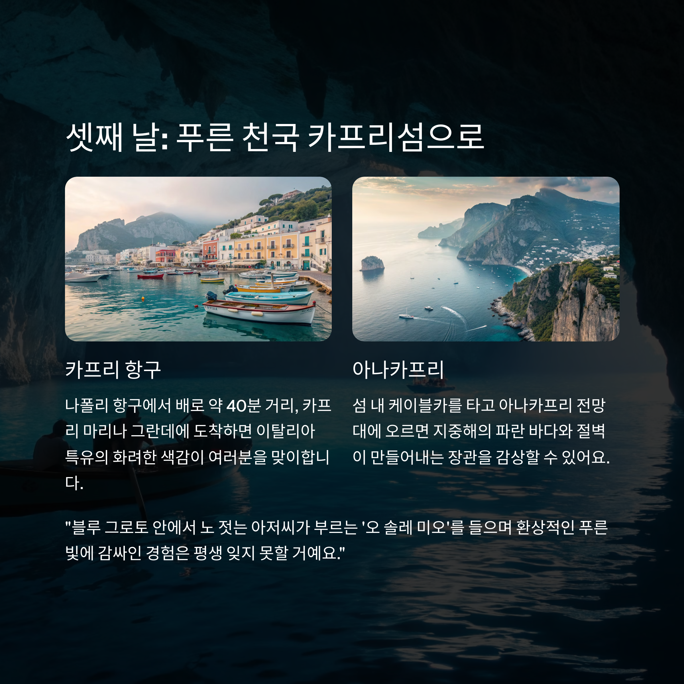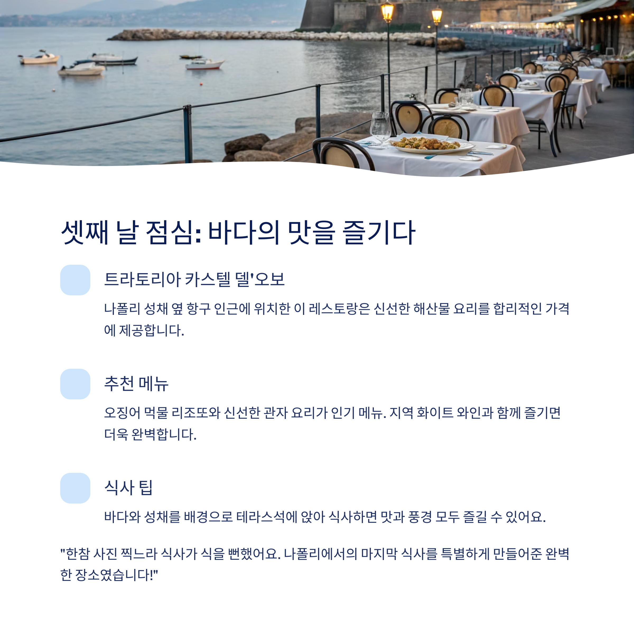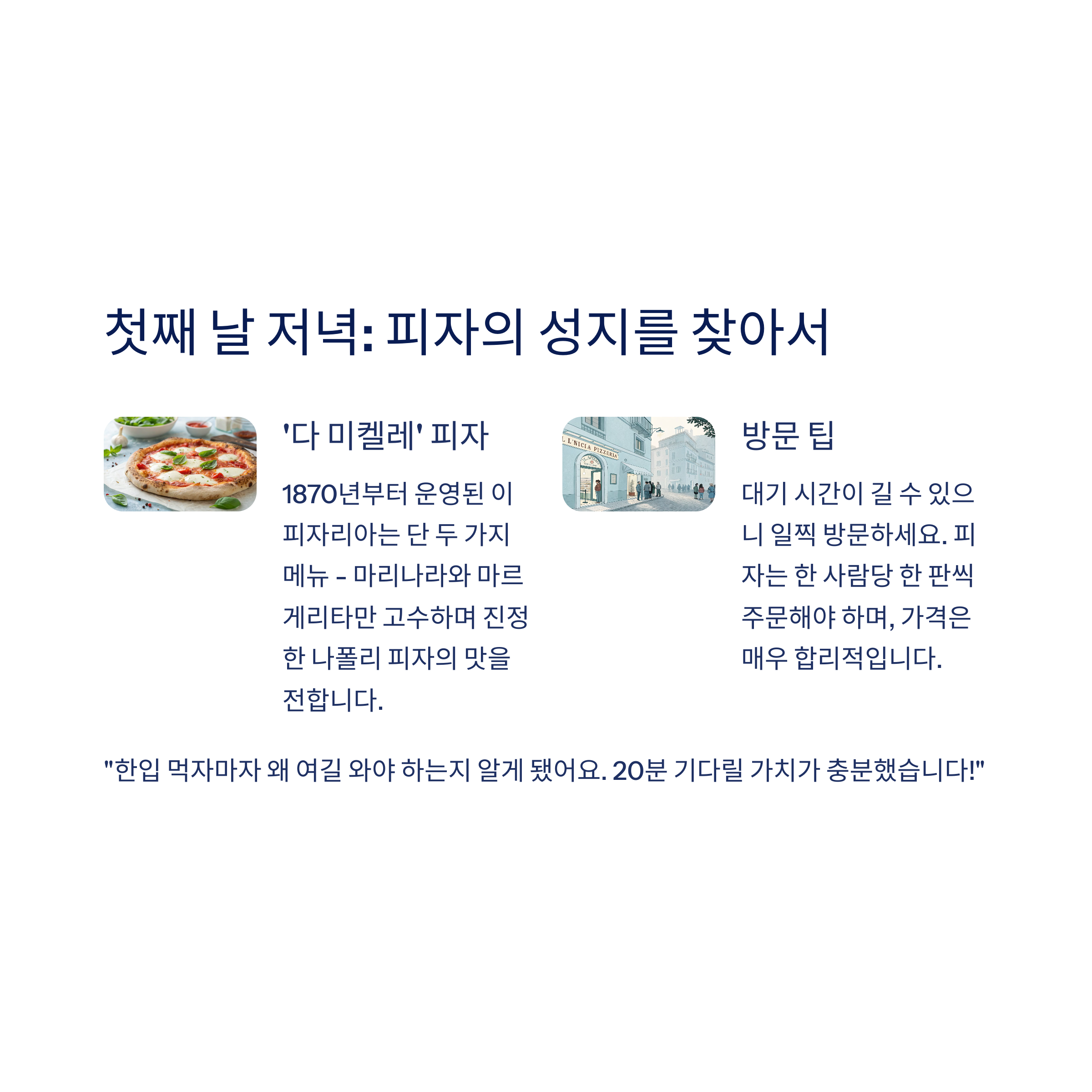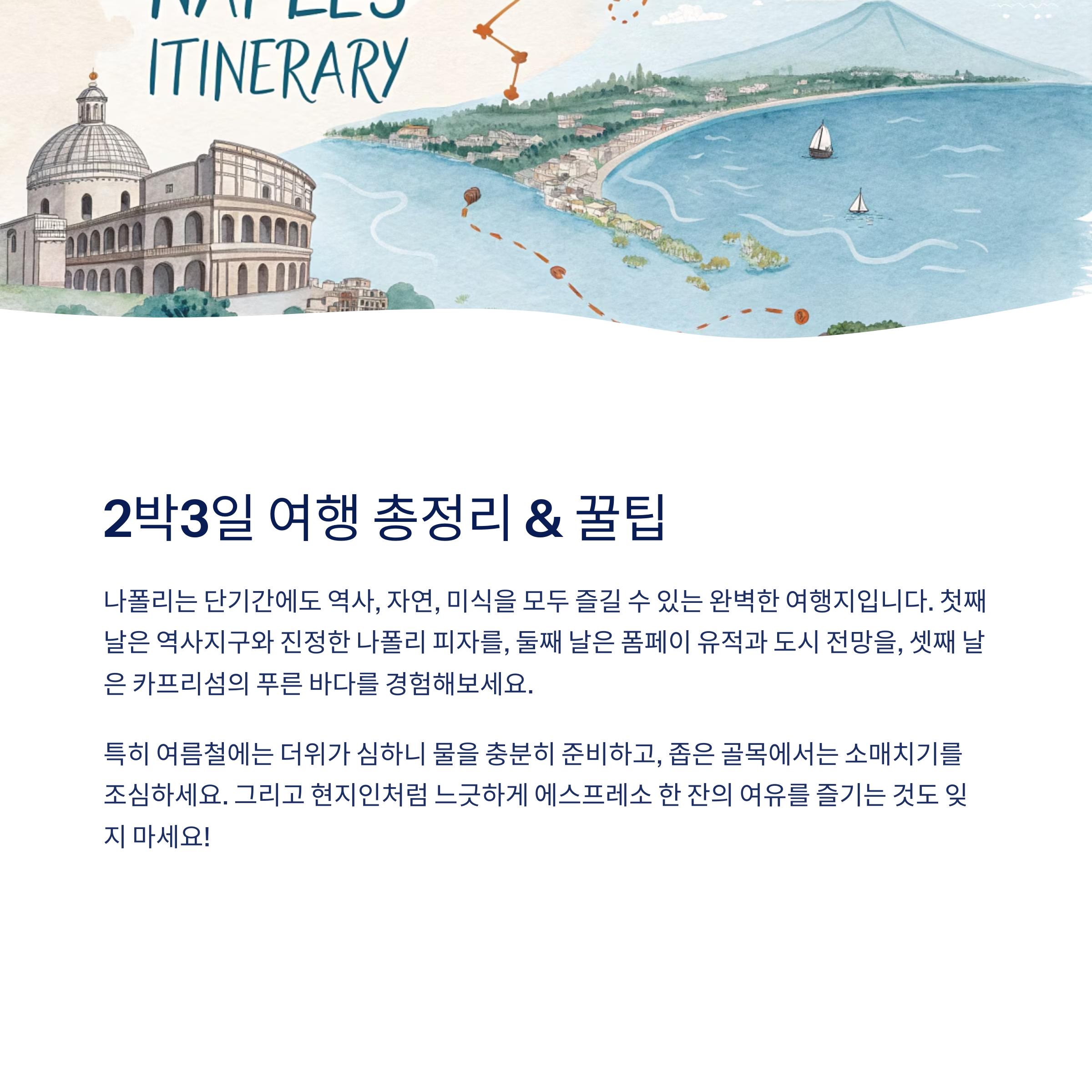 1일차 스파카나폴리 골목 탐방 산타 키아라 수도원, 역사지구 산책 다 미켈레 피자 식사 2일차 폼페이 유적지 투어 산텔모 성에서 나폴리 조망 항구 근처 디너 or 재방문 장소 탐방 3일차 카프리섬 일일투어 (보트 이동) 블루 그로토 및 아나카프리 산책 항구 인근 해산물 식사 후 귀환 준비