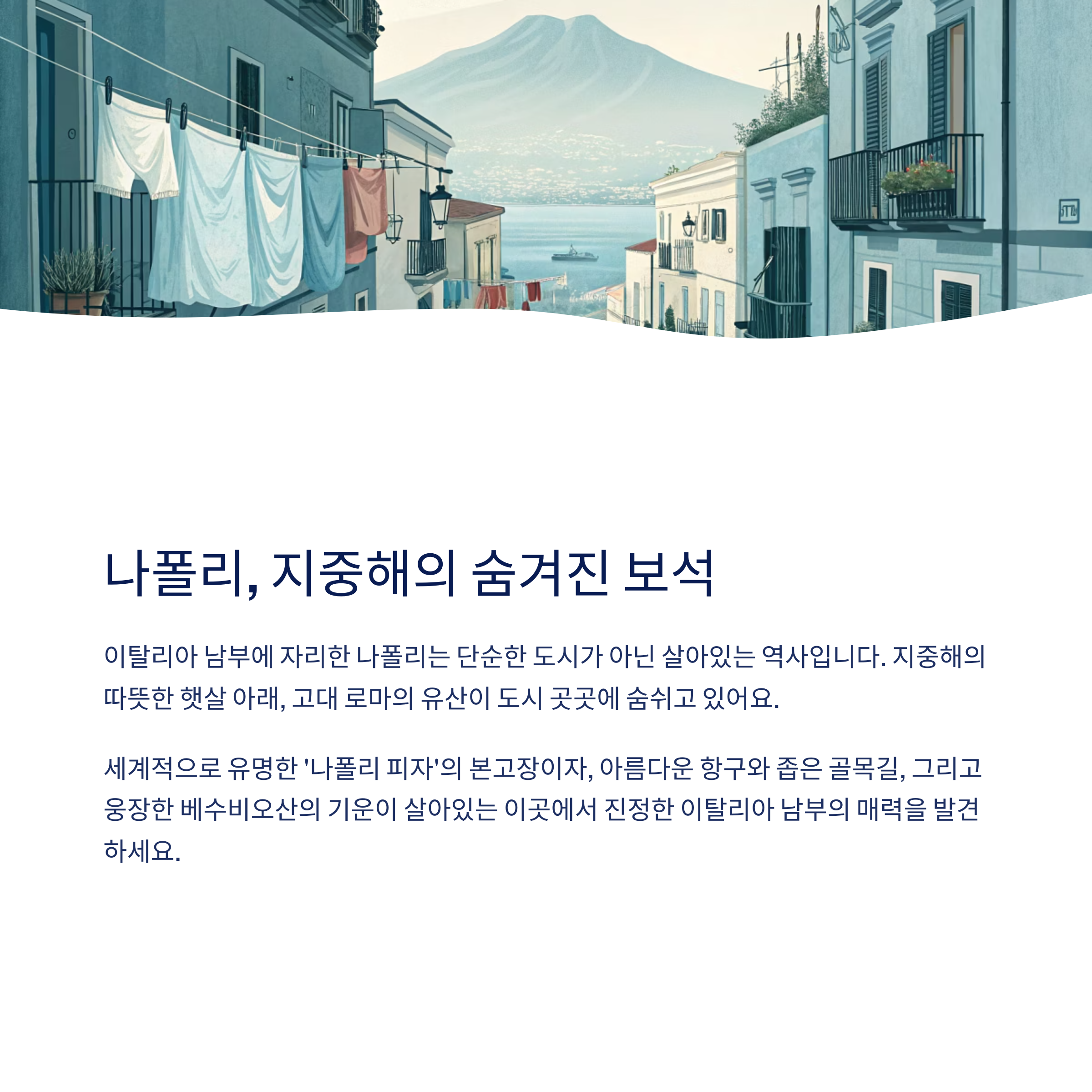 이탈리아 남부에 위치한 나폴리는 지중해의 따뜻한 기후와 고대 로마의 유산이 공존하는 매력적인 도시입니다.