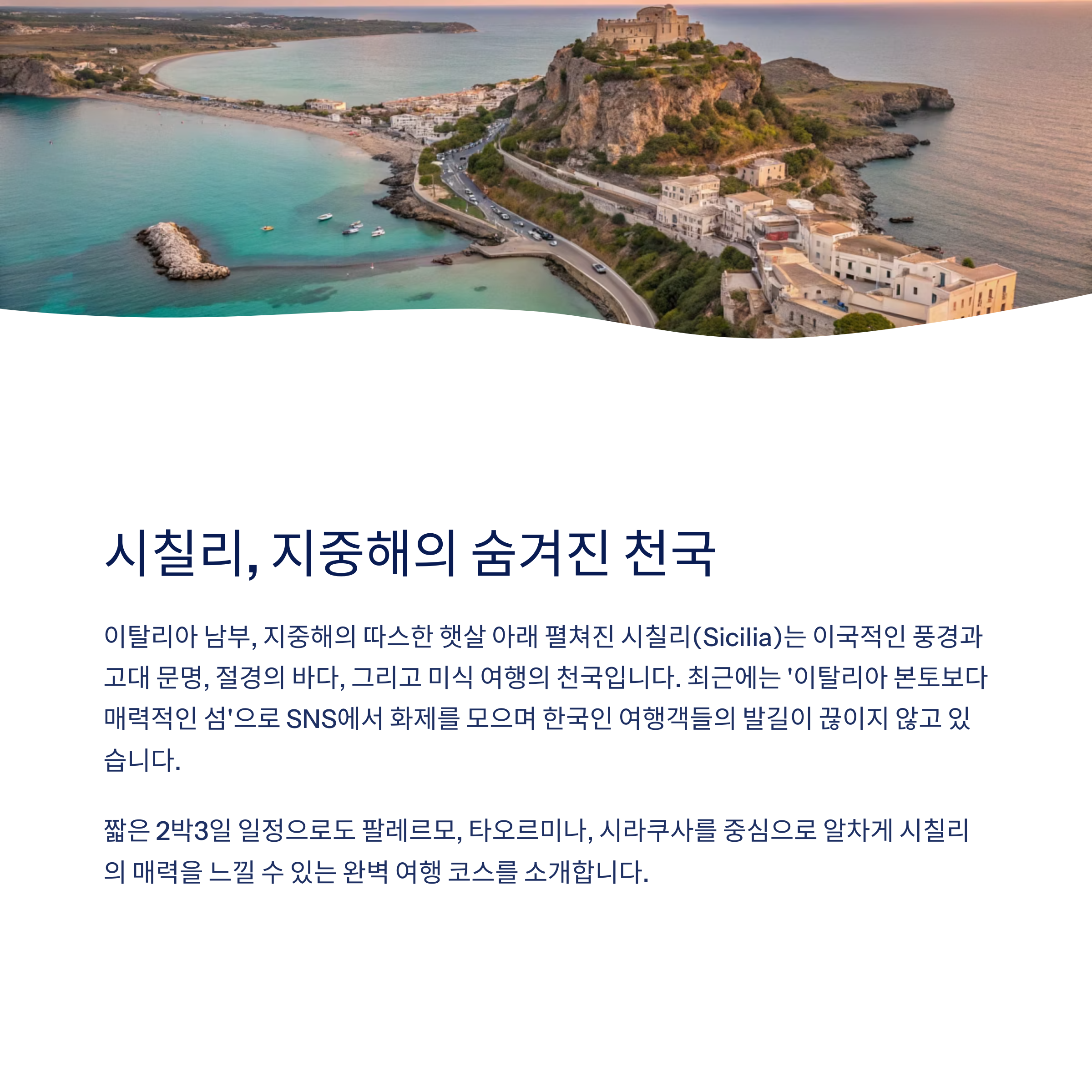 이탈리아 남부, 지중해의 따스한 햇살 아래 펼쳐진 시칠리(Sicilia)는 이국적인 풍경과 고대 문명, 절경의 바다, 그리고 미식 여행의 천국으로 불린다. 최근 SNS에서는 ‘이탈리아 본토보다 매력적인 섬’으로 시칠리를 찾는 한국인 여행객들이 꾸준히 늘고 있으며, 특히 2박3일 단기 일정으로도 알차게 즐길 수 있는 코스가 다양하게 소개되고 있다. 이번 글에서는 시칠리의 주요 도시 팔레르모, 타오르미나, 시라쿠사 중심의 여행 루트를 소개하고, 맛집 정보와 함께 여행 꿀팁을 제공한다.