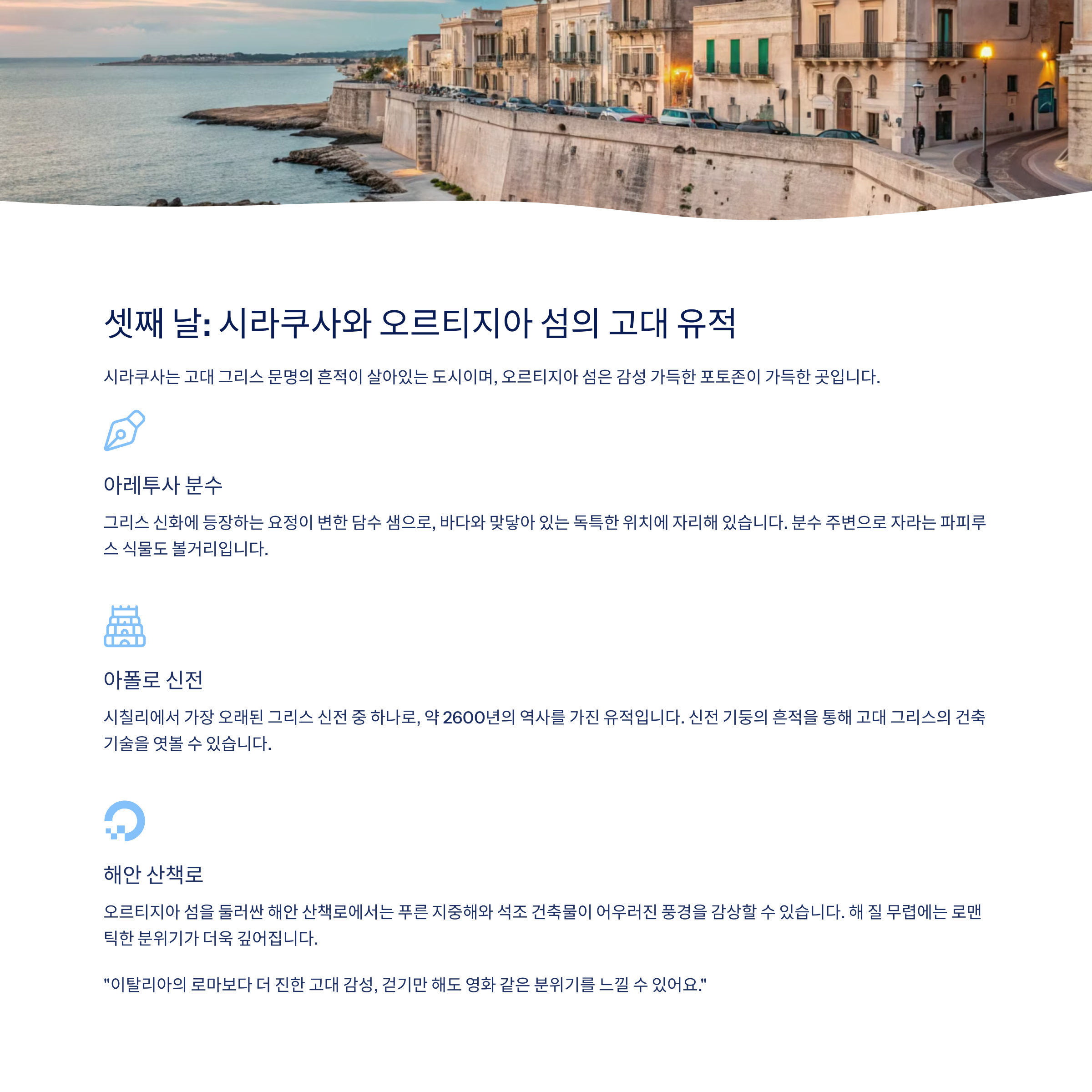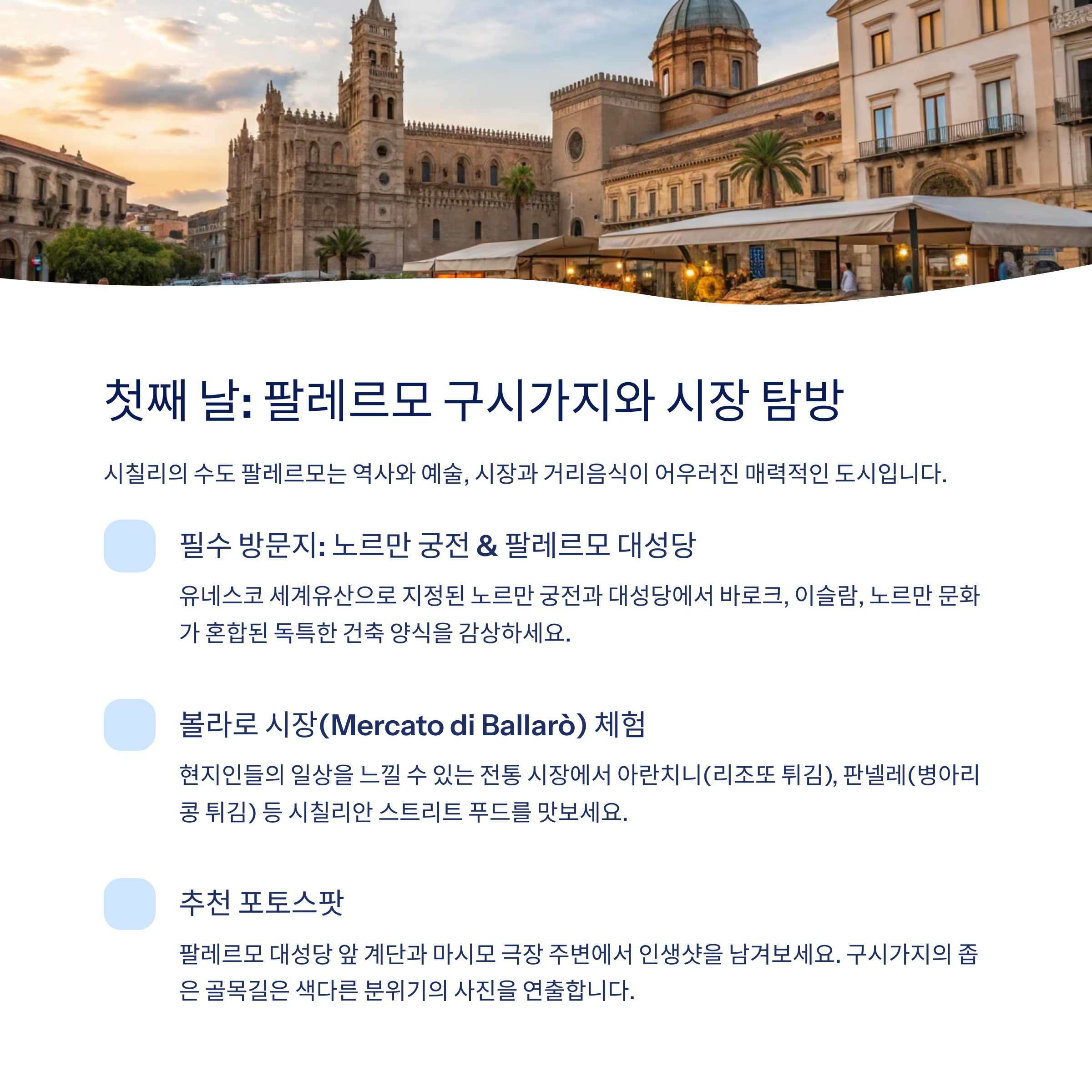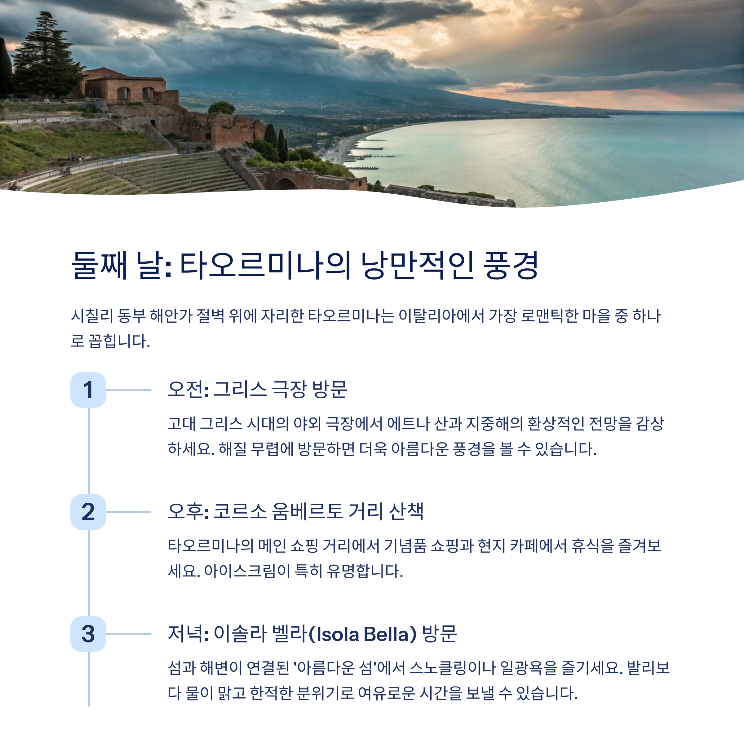 1일차 팔레르모 구시가지 + 볼라로 시장 투어 팔레르모 중심 호텔 2일차 타오르미나 관광 + 이솔라 벨라 해변 체험 타오르미나 언덕 뷰 숙소 3일차 시라쿠사 오르티지아 섬 산책 + 점심 시라쿠사 항구 근처 숙소(또는 귀국 준비) 이 일정을 기반으로 하면 무리 없이 문화, 자연, 미식을 모두