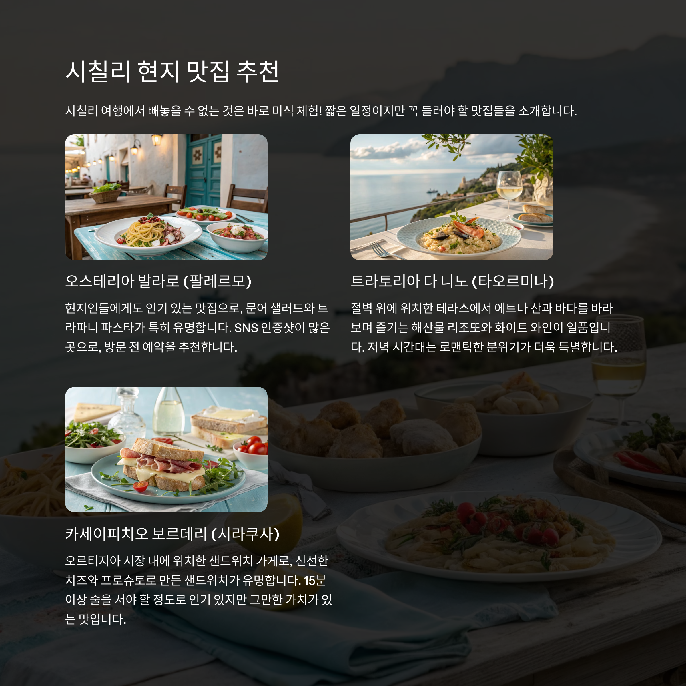 2박3일의 짧은 일정이지만, 시칠리 현지 미식은 절대 놓쳐선 안 될 여행의 필수 코스다.