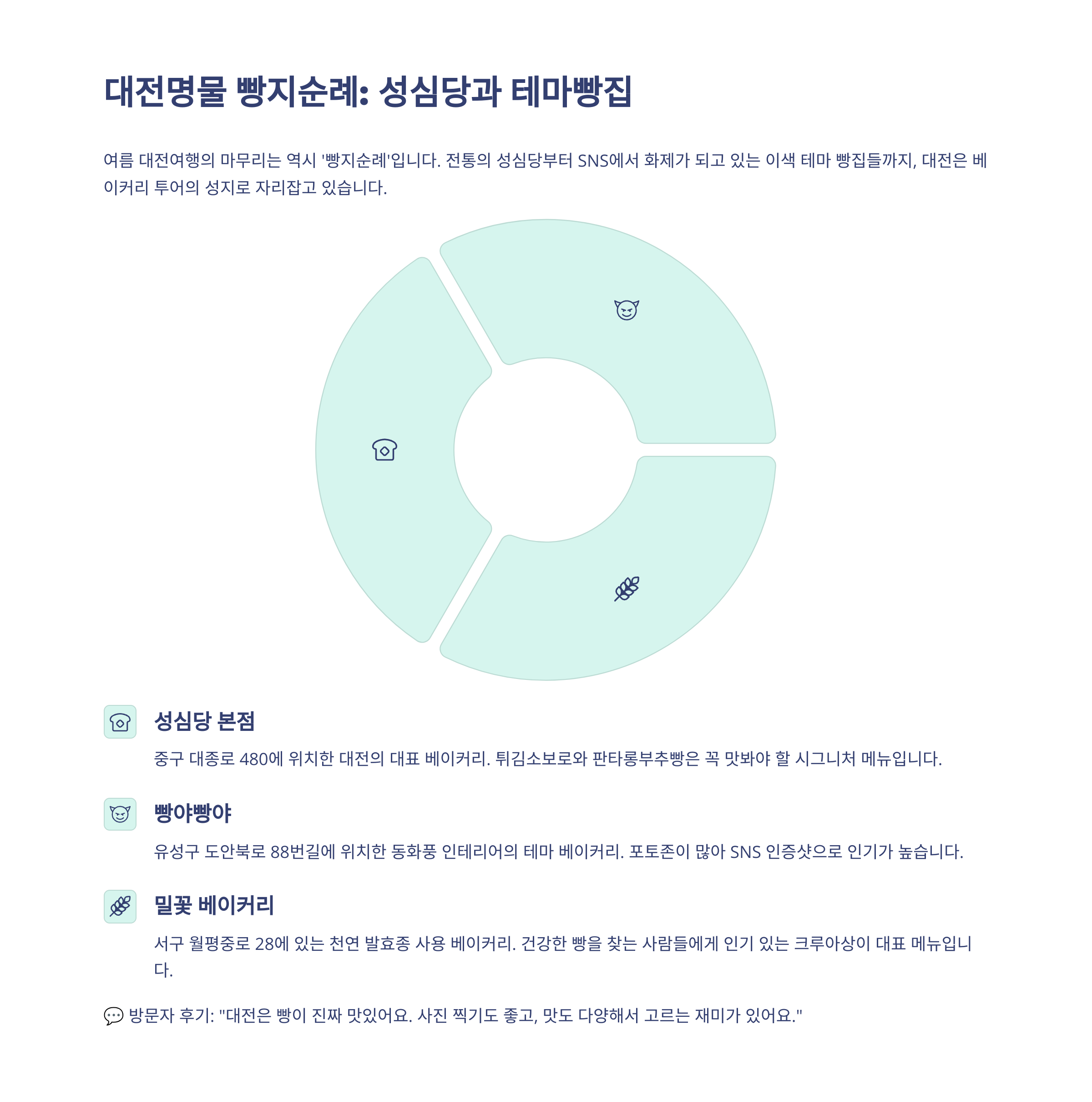 성심당 본점 중구 대종로 480 튀김소보로, 판타롱부추빵 대표 메뉴 빵야빵야 (banya) 유성구 도안북로 88번길 동화풍 인테리어, 포토존 인기 밀꽃 베이커리 서구 월평중로 28 천연 발효종 사용, 시그니처 크루아상 등 체험후기: "대전은 빵이 진짜 맛있어요.