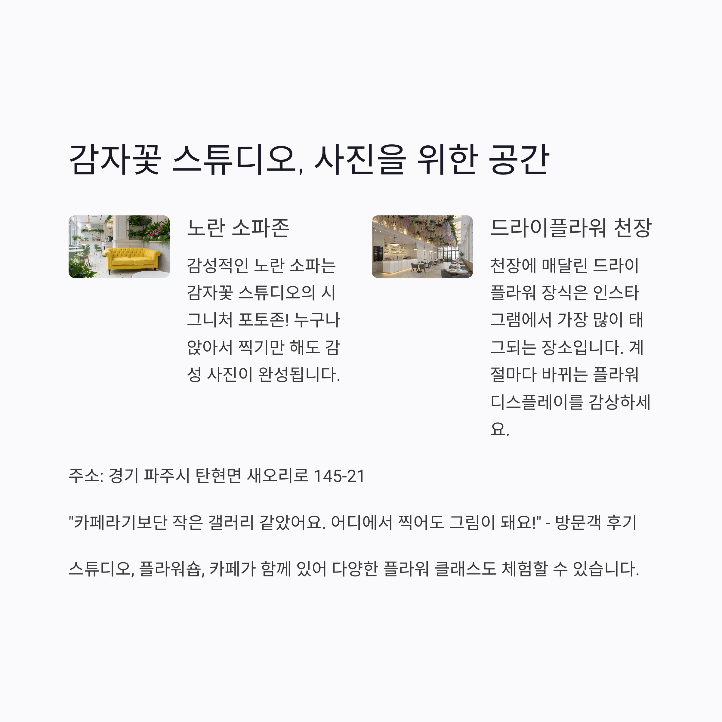 스튜디오, 플라워숍, 카페가 함께 있어 다양한 감성 사진을 남길 수 있으며, SNS에서 '파주 감성 카페'로 검색되는 대표 장소입니다.즐길거리