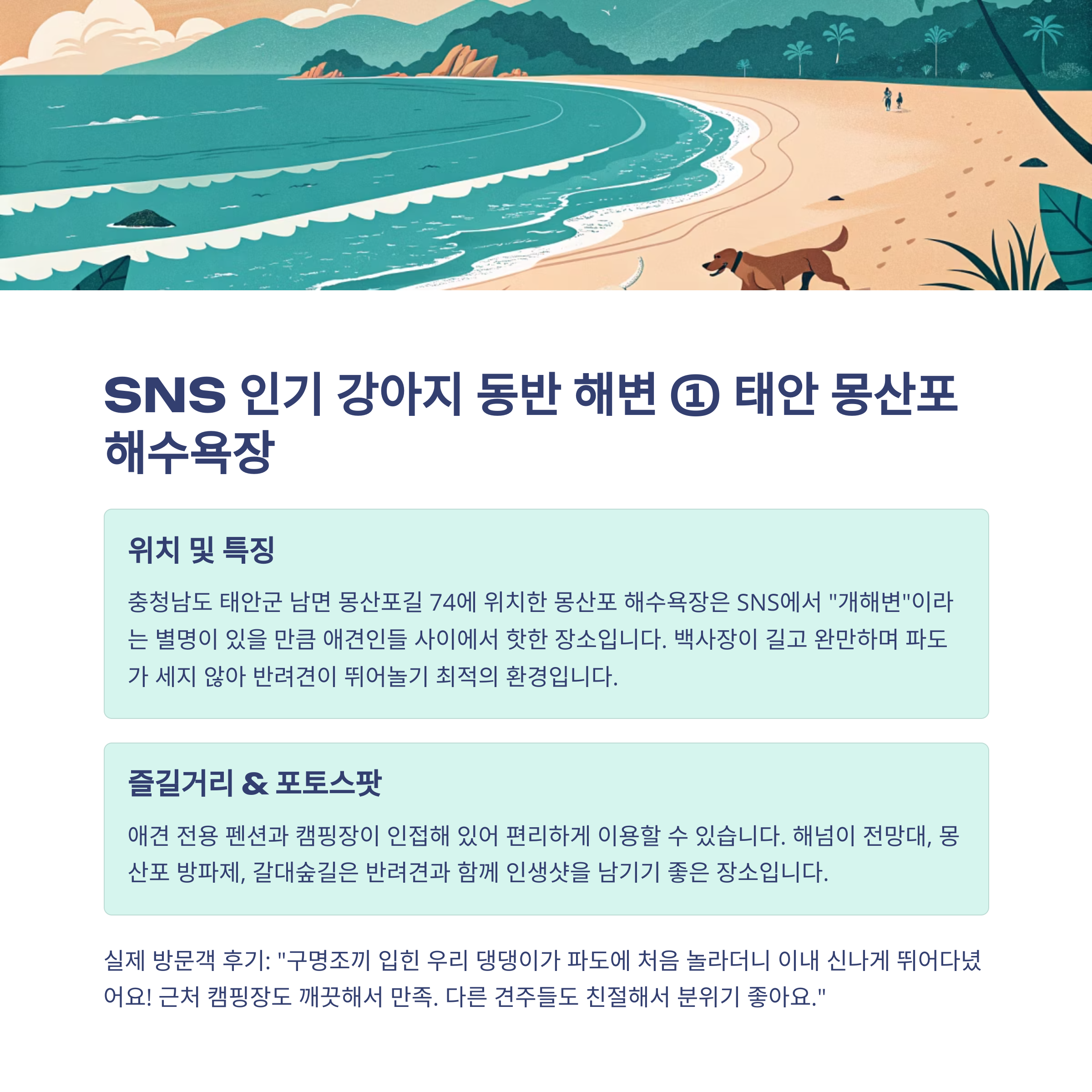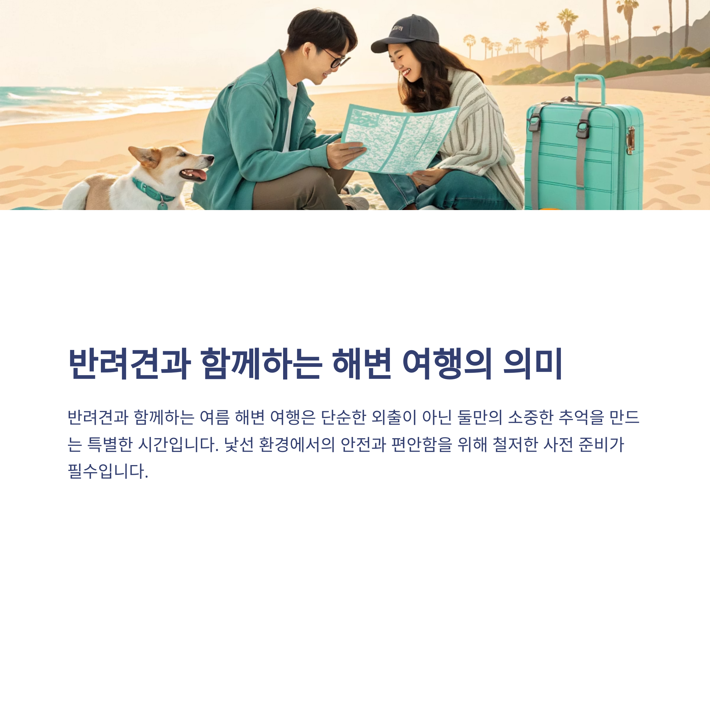 반려견과 함께하는 여름 해변 여행은 단순한 외출이 아니라 둘만의 소중한 추억을 만드는 시간입니다. 하지만 낯선 환경에서의 안전과 편안함을 고려해야 하는 만큼, 사전 준비는 필수입니다. SNS에서도 강아지와 함께한 해변 여행 후기와 정보 공유가 활발하게 이뤄지고 있으며, 반려견 동반 가능 해변에 대한 관심도 높아지고 있습니다. 이 글에서는 반려견과 함께 떠나기 전 반드시 챙겨야 할 준비물 체크리스트와 함께 국내에서 강아지 동반이 가능한 해변 추천, 포토스팟, 즐길 거리, 체험 후기를 자세히 소개합니다.