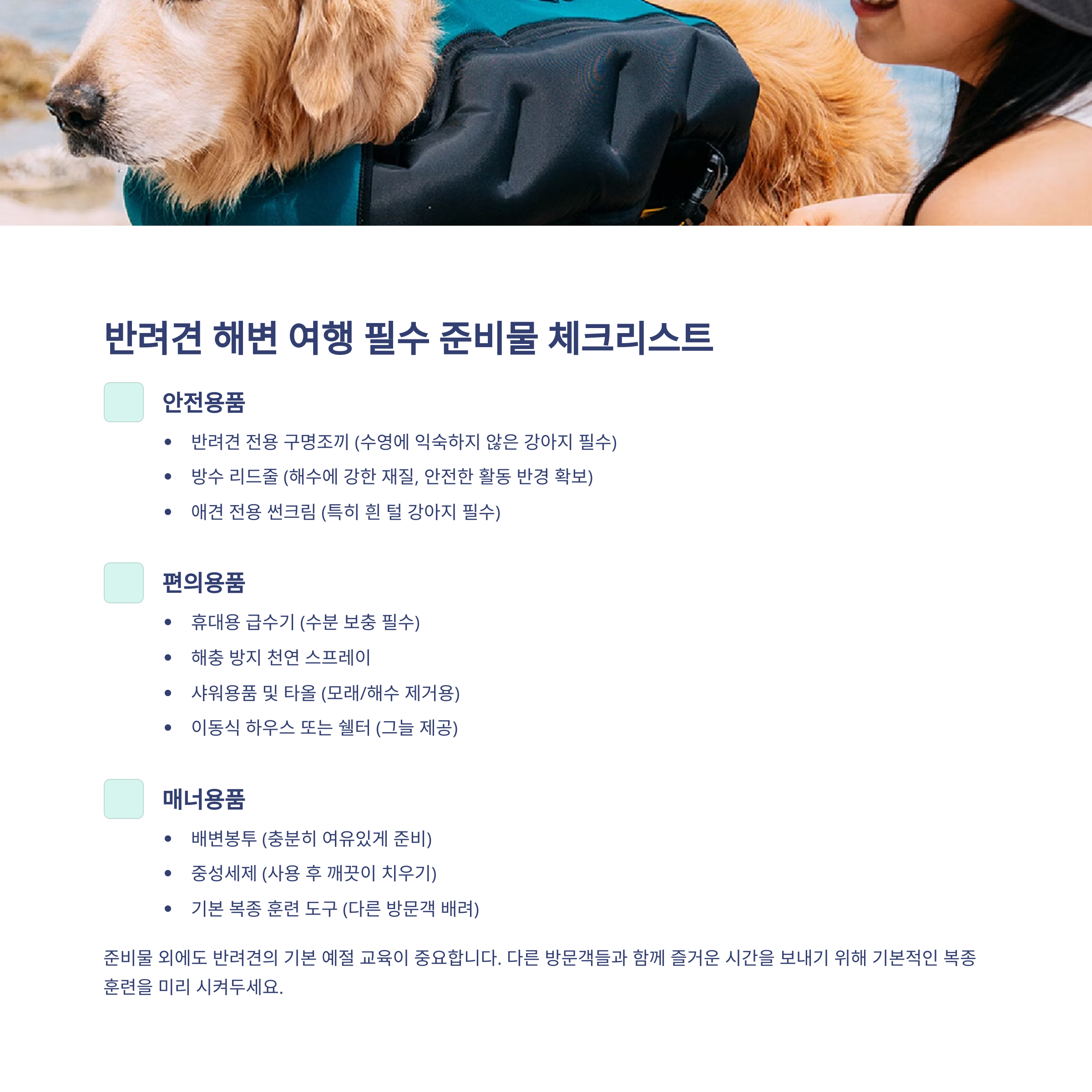 반려견 전용 구명조끼 수영에 익숙하지 않거나 조류가 빠른 바다에서는 필수 방수 리드줄 해수에 강한 재질, 안전한 활동 반경 확보 휴대용 급수기 수분 보충이 자주 필요하므로 개별 급수기 준비 해충 방지 스프레이 모기, 진드기 예방을 위한 천연 스프레이 추천 애견 전용 썬크림 강한 햇볕으로부터 피부 보호 (특히 흰 털 반려견) 샤워용품 및 타올 모래 제거와 해수 씻김 후 간단한 세정 필요 이동식 하우스 또는 쉘터 강아지가 쉬어갈 수 있는 그늘 공간 준비물 외에도 동반자의 반려견 매너가 중요합니다. 배변봉투, 중성세제, 기본 복종 훈련 등도 챙겨야 여행이 더 즐거워집니다.