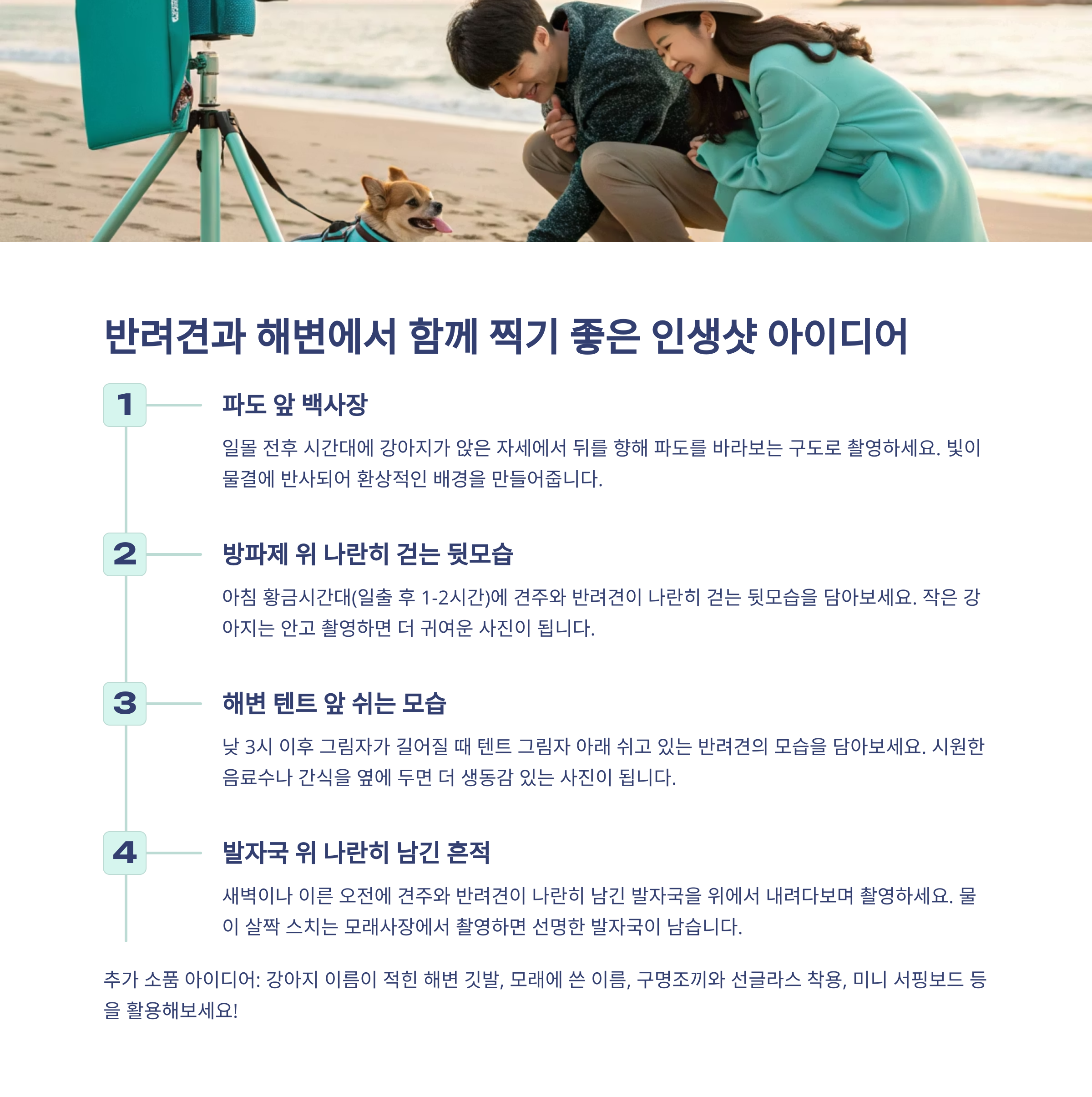 파도 앞 백사장 앉은 자세에서 뒤를 향해 파도 바라보기 일몰 전후 방파제 위 나란히 걷는 뒷모습 아침 황금시간대 해변 텐트 앞 텐트 그림자 아래 쉬는 모습 낮 3시 이후 발자국 위 견주와 나란히 남긴 발자국 촬영 새벽 또는 이른 오전 강아지 이름이 적힌 해변 깃발, 모래에 쓴 이름, 구명조끼와 선글라스