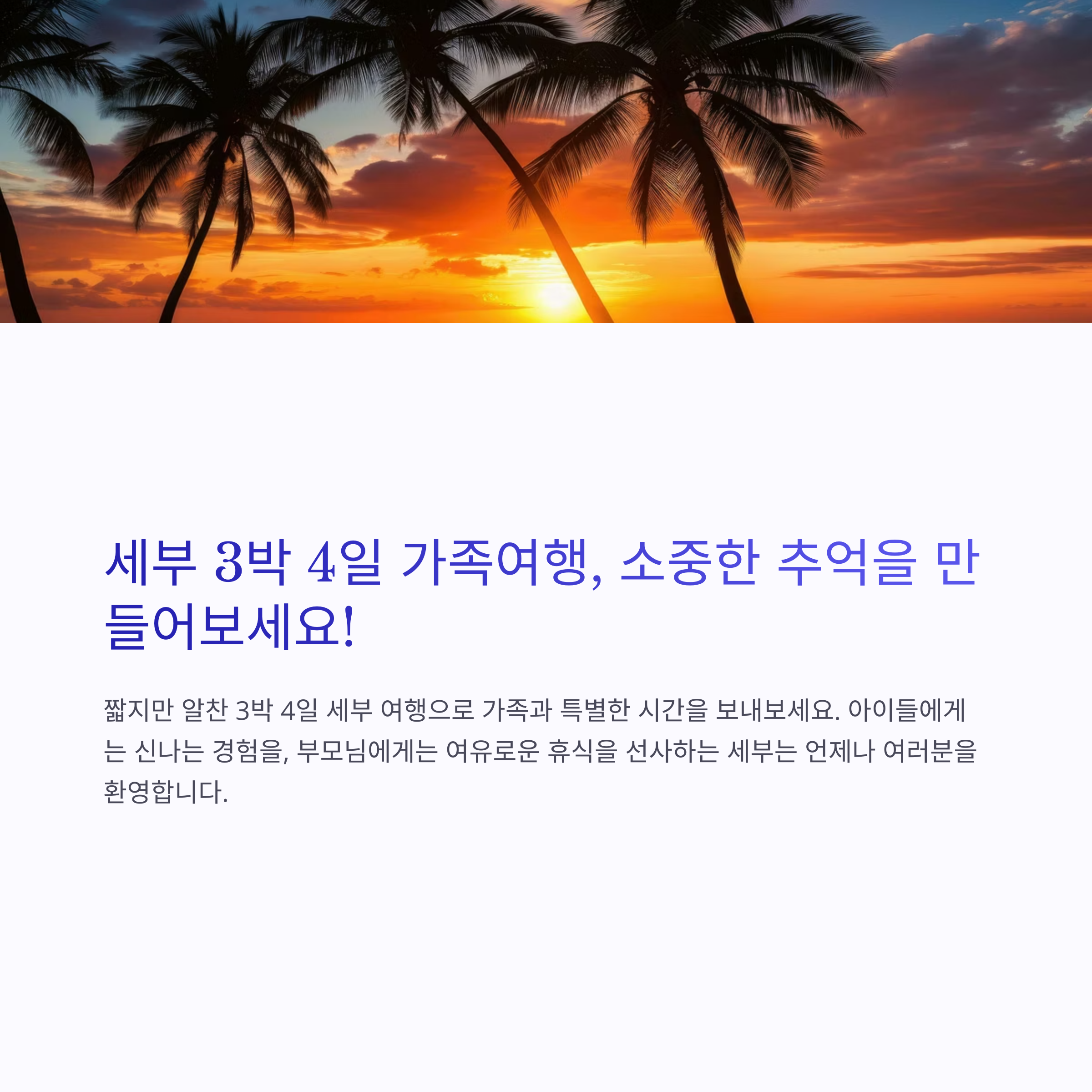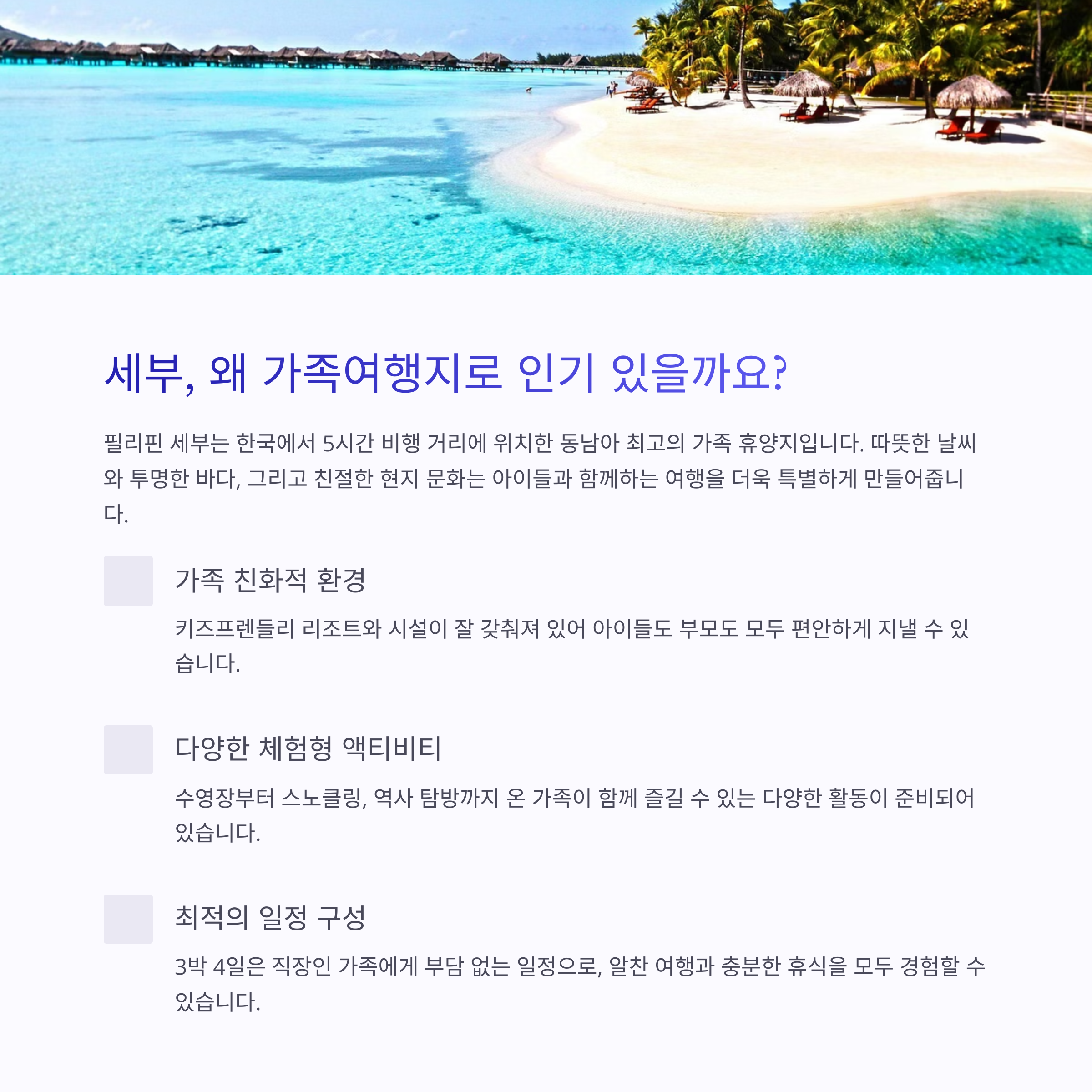 필리핀 세부는 따뜻한 날씨, 깨끗한 바다, 친절한 현지 문화로 가족 단위 여행자들에게 꾸준히 사랑받고 있는 동남아 대표 휴양지입니다. 특히 3박 4일 일정은 직장인 가족에게 적당한 시간 구성으로 인기를 끌고 있습니다. 최근 SNS와 블로그에서는 가족 중심의 체험형 여행, 키즈프렌들리 리조트, 안전하고 다양한 액티비티를 즐길 수 있는 일정이 화제가 되고 있으며, 부모와 아이 모두를 만족시킬 수 있는 알찬 구성의 코스들이 공유되고 있습니다. 이번 글에서는 가족여행에 최적화된 세부 3박 4일 여행 일정을 중심으로 장소별 추천, 꿀팁, 포토스팟, 실후기까지 완벽하게 소개합니다.