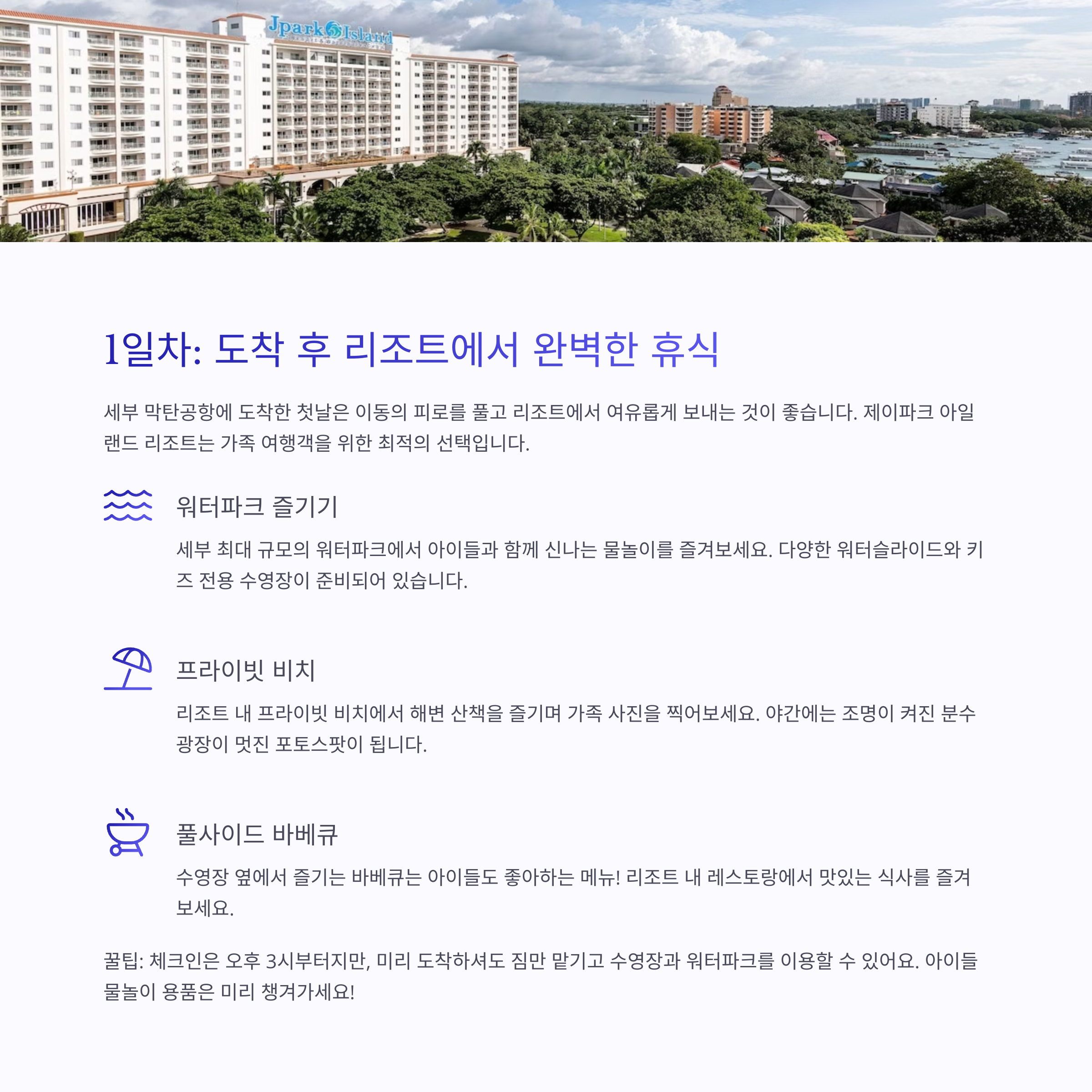 1일차 도착 및 리조트 체크인 제이파크 리조트 수영, 워터파크, 휴식 막탄공항 → 리조트 이동 2일차 해양 액티비티 날루수안섬 호핑투어, 스노클링, BBQ 오전 8시 출발 추천 3일차 시내 문화 체험 산페드로 요새 외 역사 관광, 쇼핑, 카페 그랩 택시 이동 4일차 리조트 체크아웃 리조트 내 조식, 마사지, 사진촬영 공항 셔틀 예약 필요 3박 4일 일정이라 짧지만, 가족이 함께라면 알차고 편안한 휴식 여행이 가능합니다.