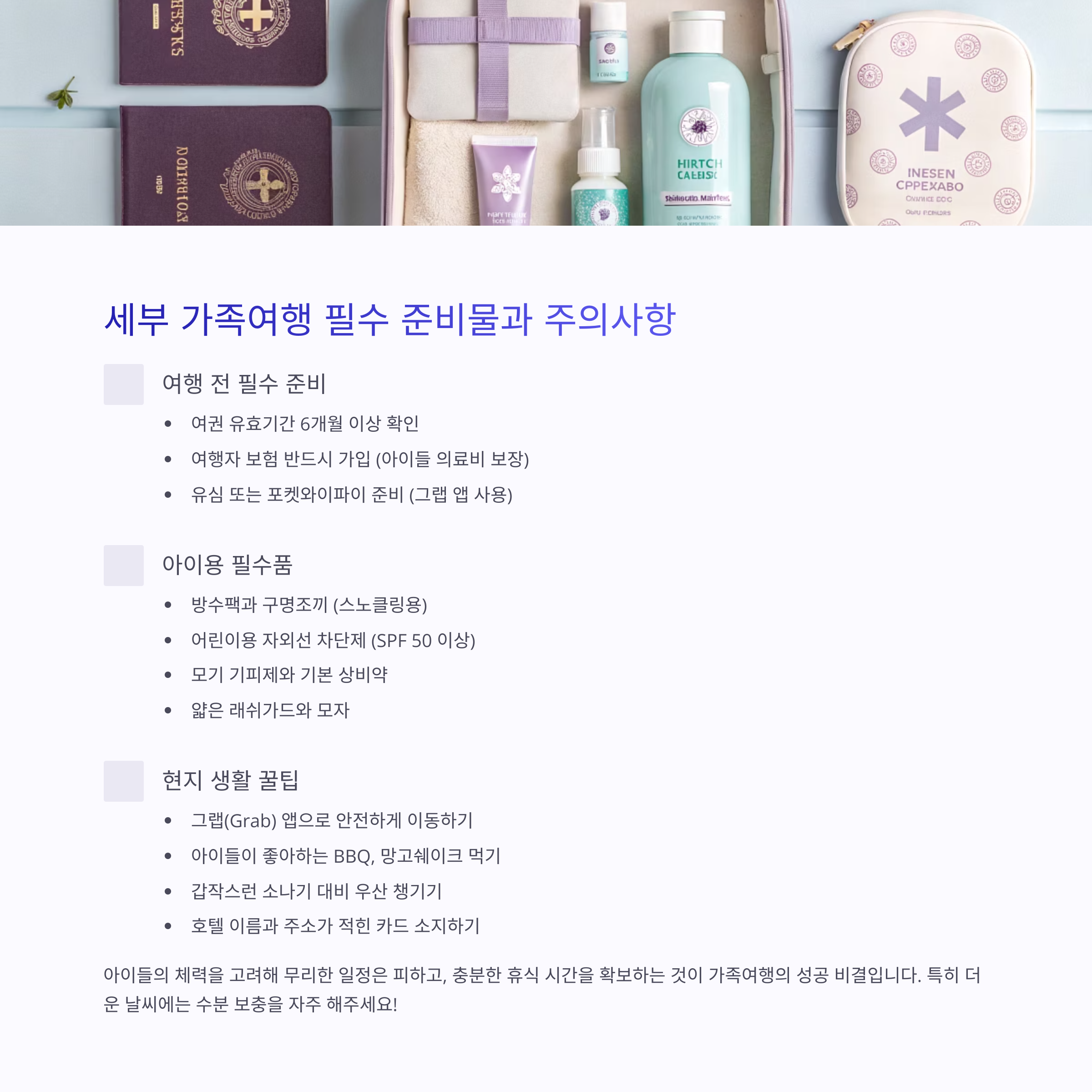 여행 전 준비 여권 유효기간 6개월 이상, 유심 또는 포켓와이파이 준비 아이용 필수품 방수팩, 유아 썬크림, 모기 기피제, 어린이 약 현지 이동 수단 그랩(Grab) 앱 필수 설치, 대중교통 비추천 음식 선택 아이와 함께 먹기 좋은 필리핀 현지 음식은 BBQ, 망고쉐이크, 치킨인아살 - 여행자 보험은 반드시 가입해야 하며,