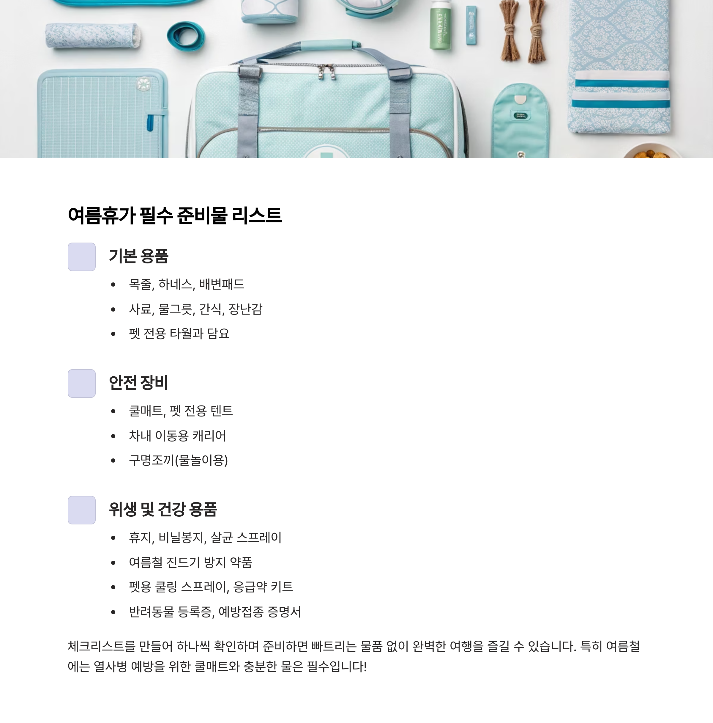 - 안전 장비: 쿨매트, 펫 전용 텐트, 차내 이동용 캐리어, 구명조끼(물놀이용)