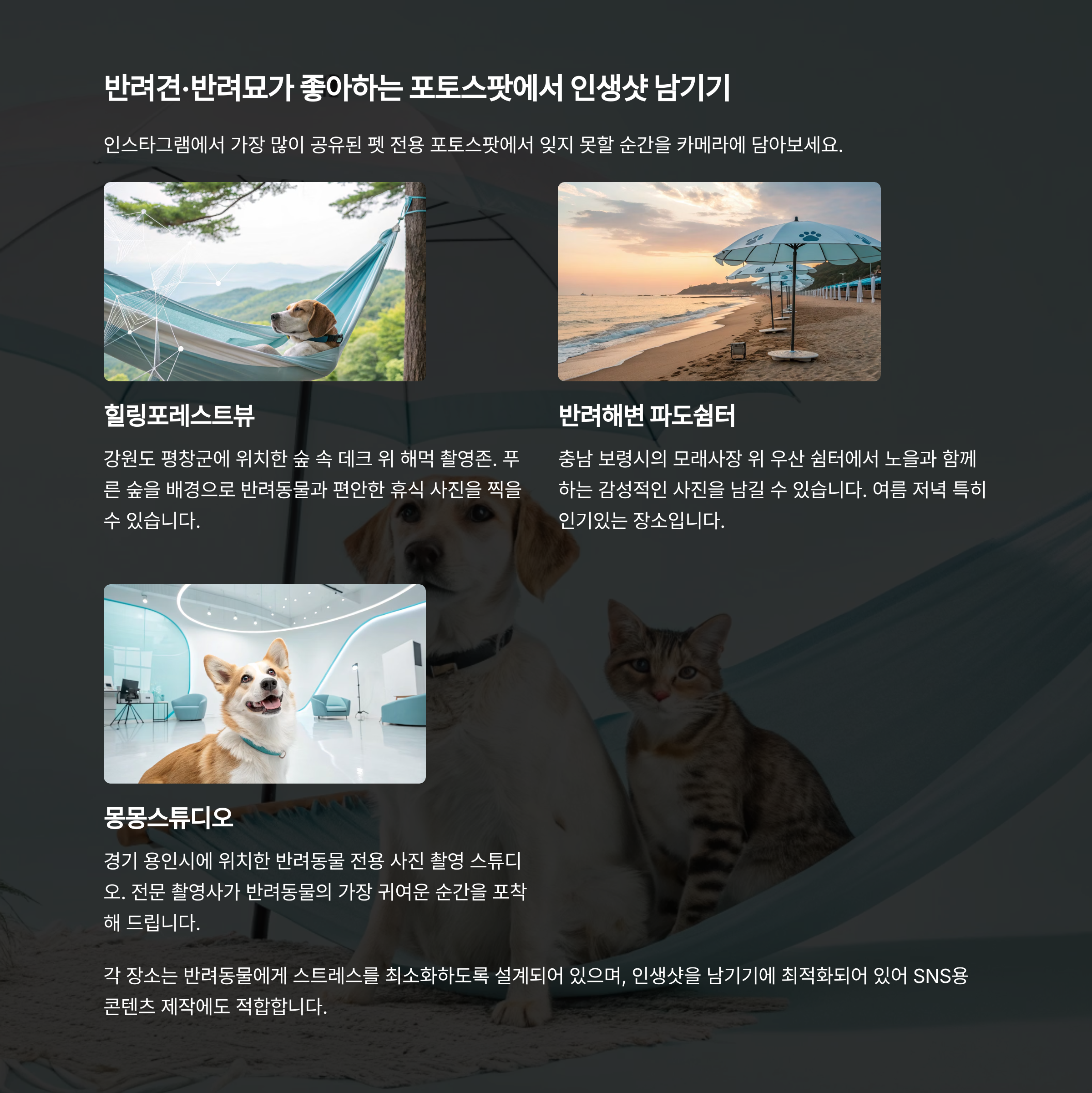 힐링포레스트뷰 강원도 평창군 숲 속 데크 위 해먹 촬영존 반려해변 파도쉼터 충남 보령시 모래사장 위 우산 쉼터+노을 뷰 몽몽스튜디오 경기 용인시 반려동물 전용 사진 촬영 스튜디오 각 장소는 반려동물에게 스트레스를 최소화하며, 인생샷도 남길 수 있어 SNS용