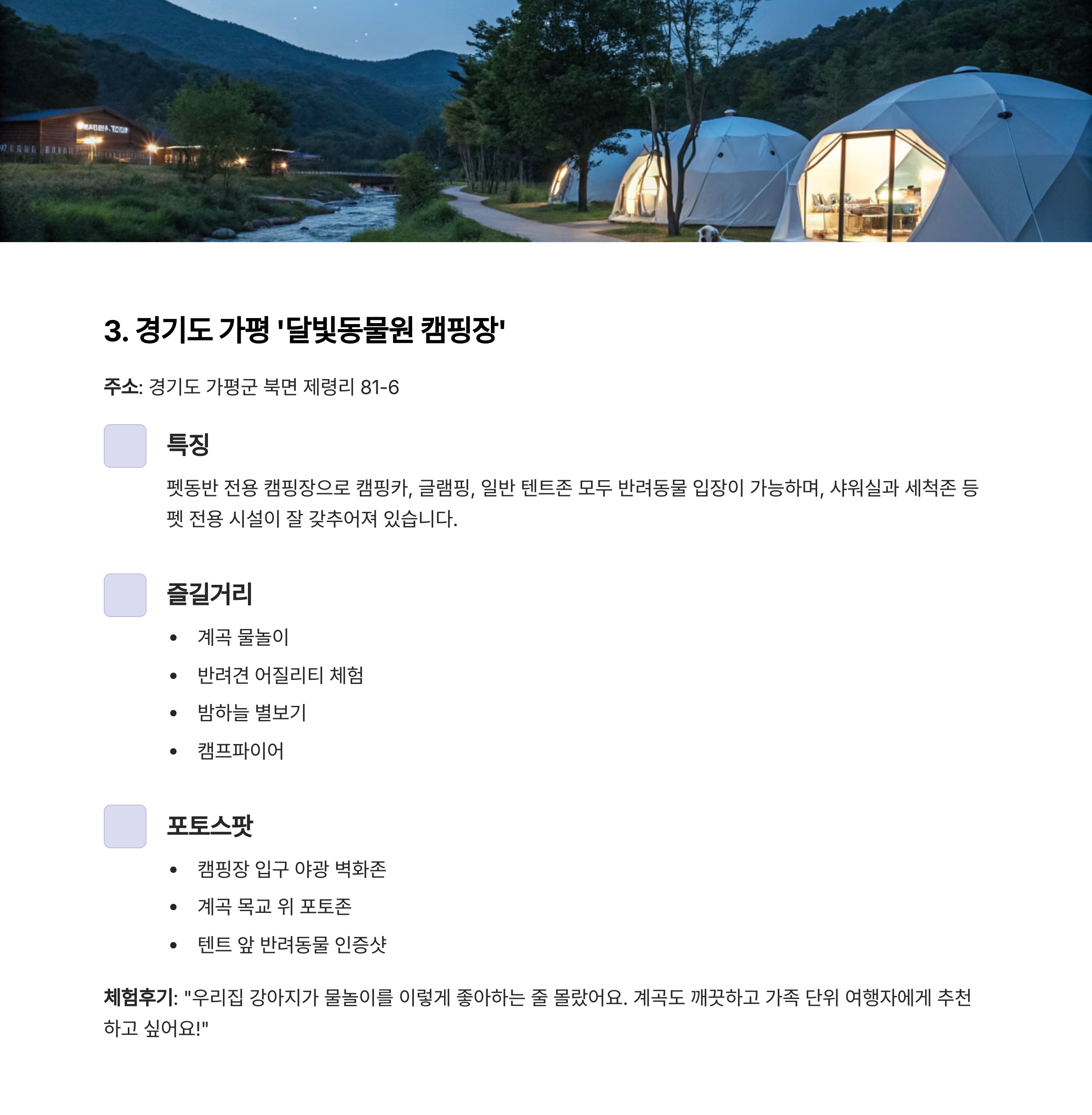 특징: 펫동반 전용 캠핑장으로 캠핑카, 글램핑, 일반 텐트존 모두 반려동물