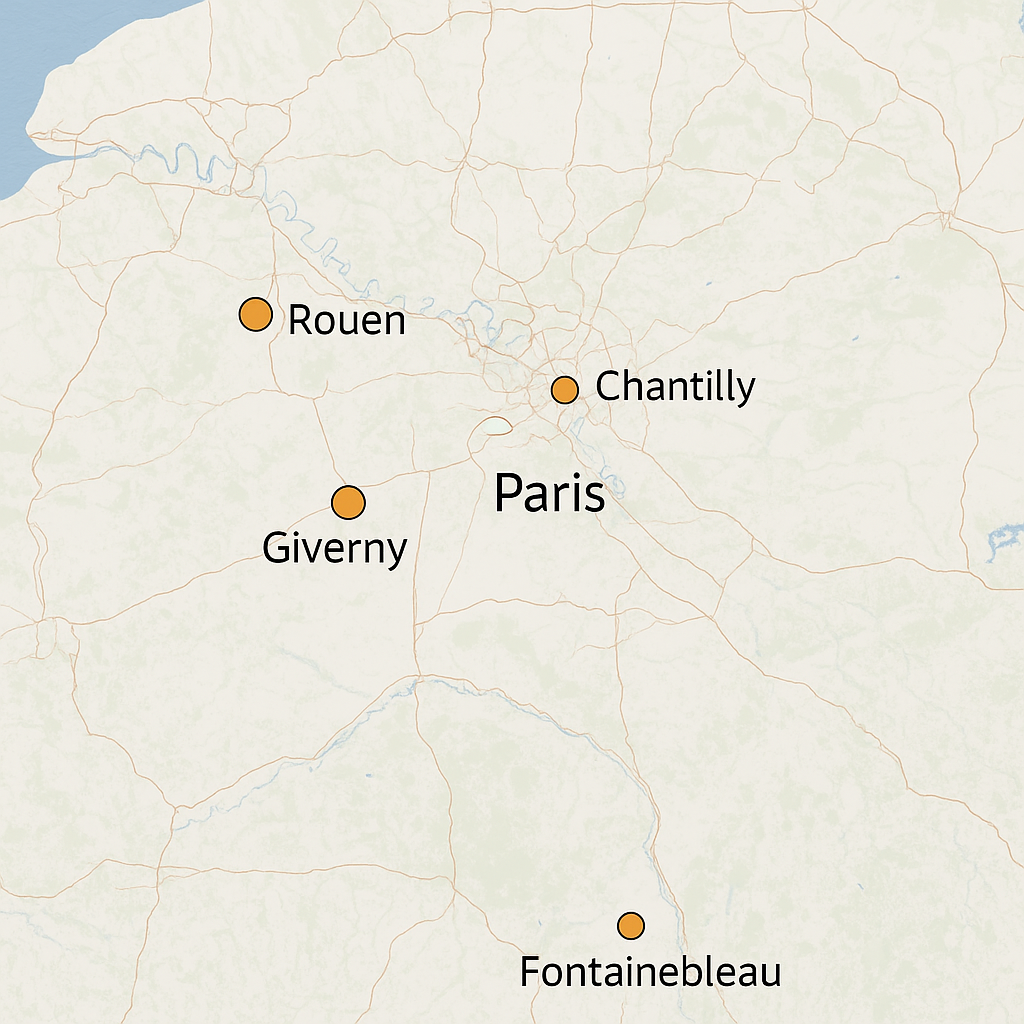 지베르니 08:00 모네 정원 및 박물관 → 마을 산책 17:00 베르사유 09:00 궁전 투어 → 정원 산책 및 분수쇼 감상 18:00 퐁텐블로 08:30 궁전 탐방 → 숲 산책 → 지역 카페 이용 17:30 루앙 07:30 대성당 방문 → 구시가지 산책 → 미술관 관람 18:00 샹티이 09:00 성 관람 → 말 박물관 투어 → 디저트 카페 방문 17:00