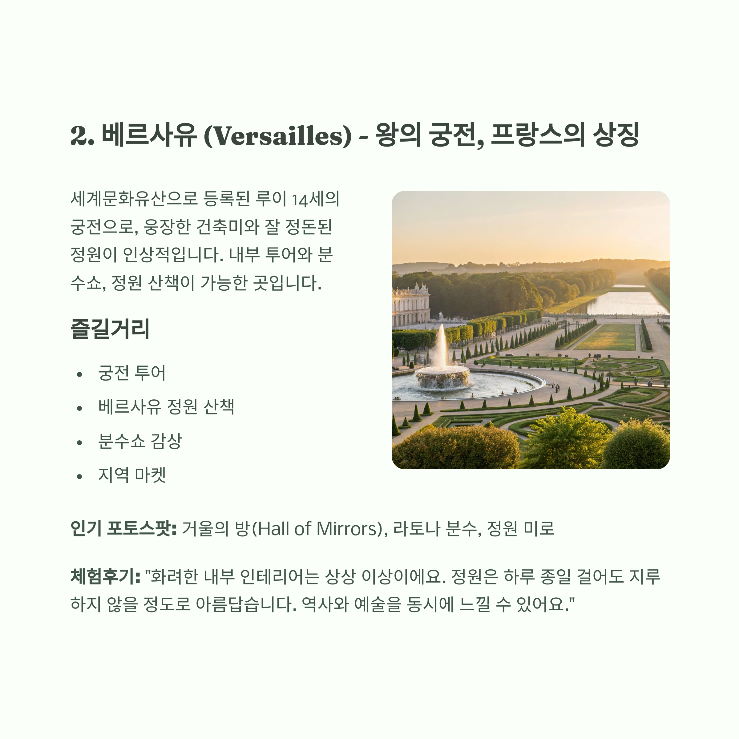 특징: 세계문화유산으로 등록된 루이 14세의 궁전으로, 웅장한 건축미와