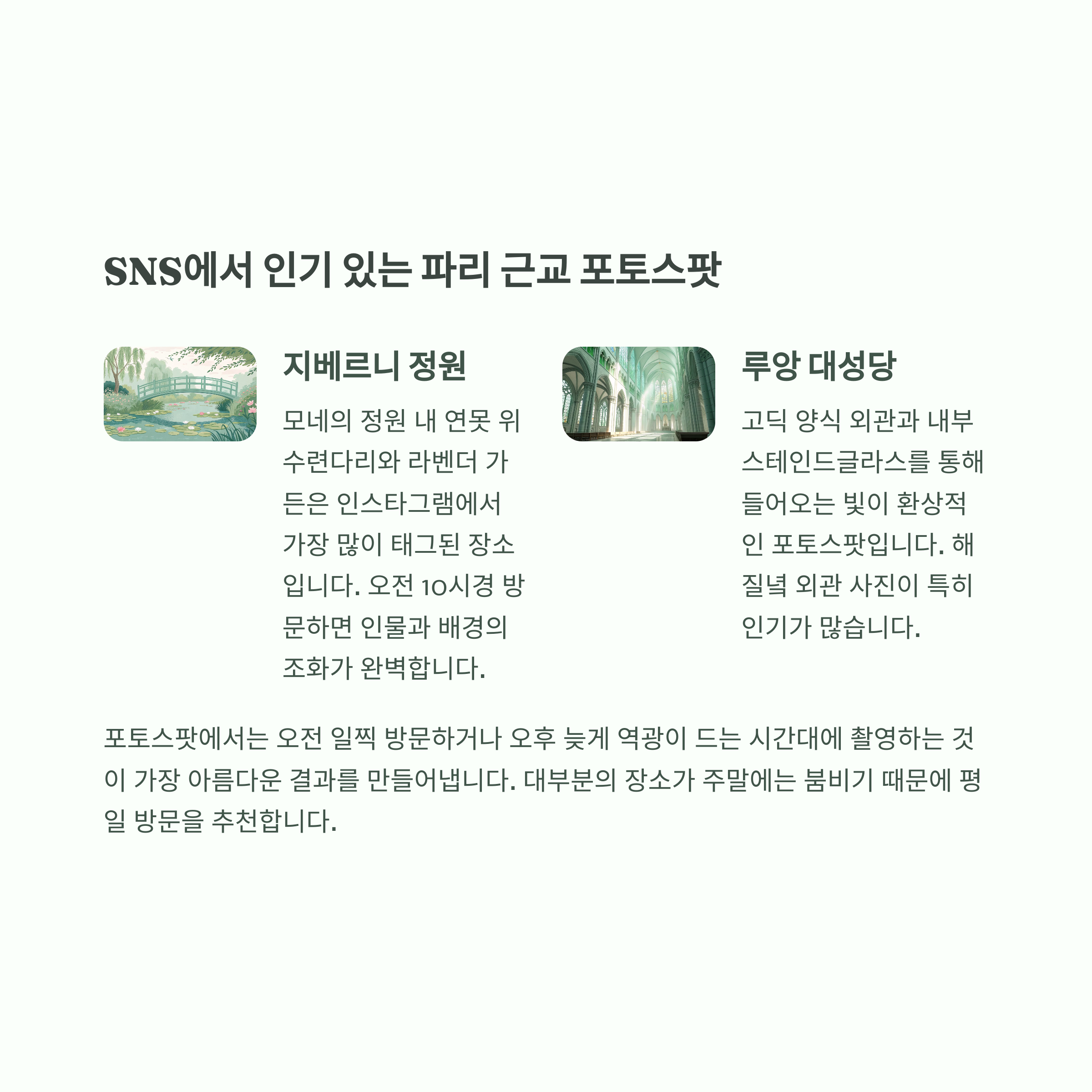 지베르니 정원 지베르니 연못 위 수련다리, 라벤더 가든 베르사유 정원 베르사유 라토나 분수, 미로형 나무길 루앙 대성당 루앙 고딕 양식 외관, 대성당 내부 조명 샹티이 대운하 샹티이 고풍스러운 운하 배경 셀카 촬영 포토스팟에서는 오전 일찍 방문하거나 오후 늦게 역광이 드는 시간대에