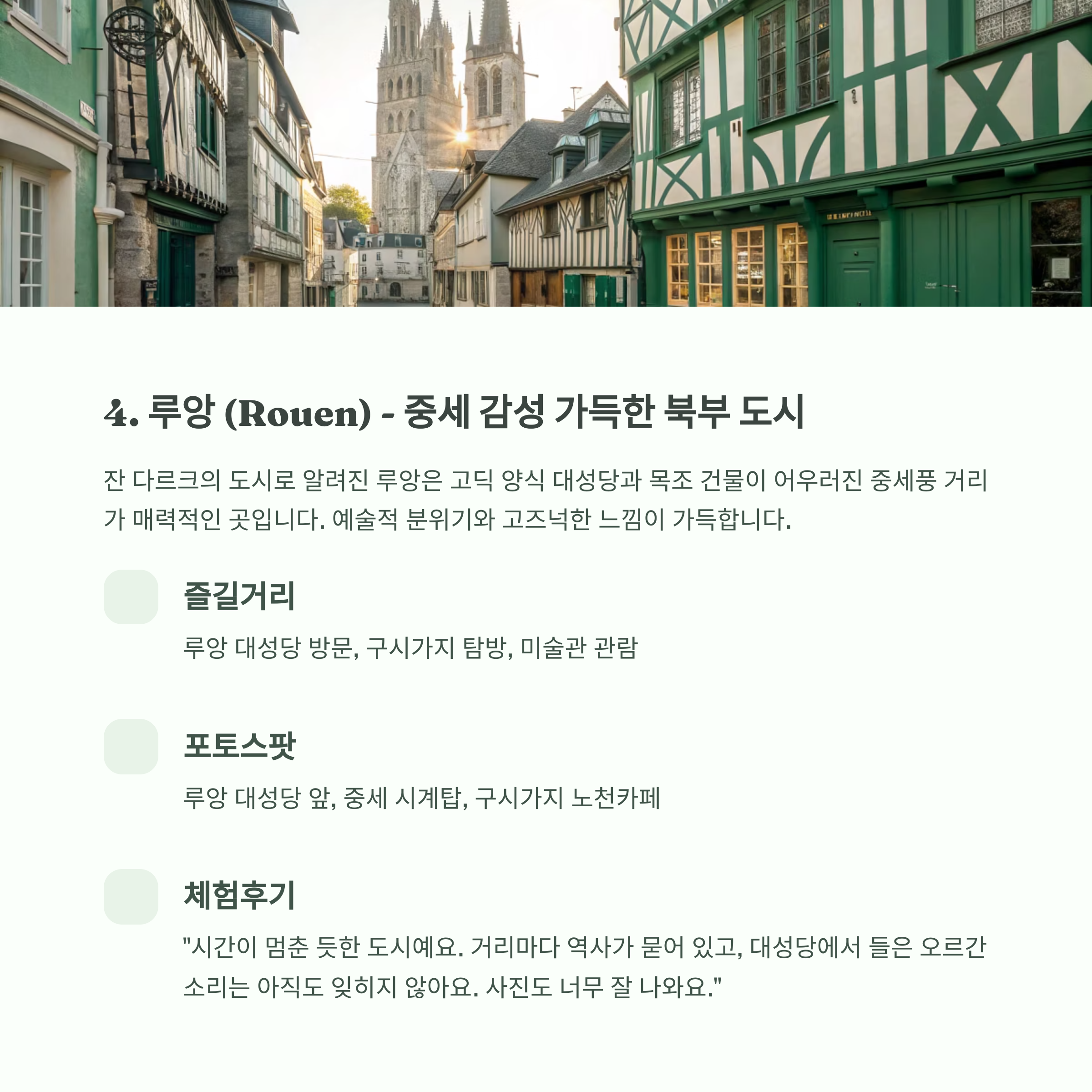 특징: 잔 다르크의 도시로 알려진 루앙은 고딕 양식 대성당과 목조 건물이