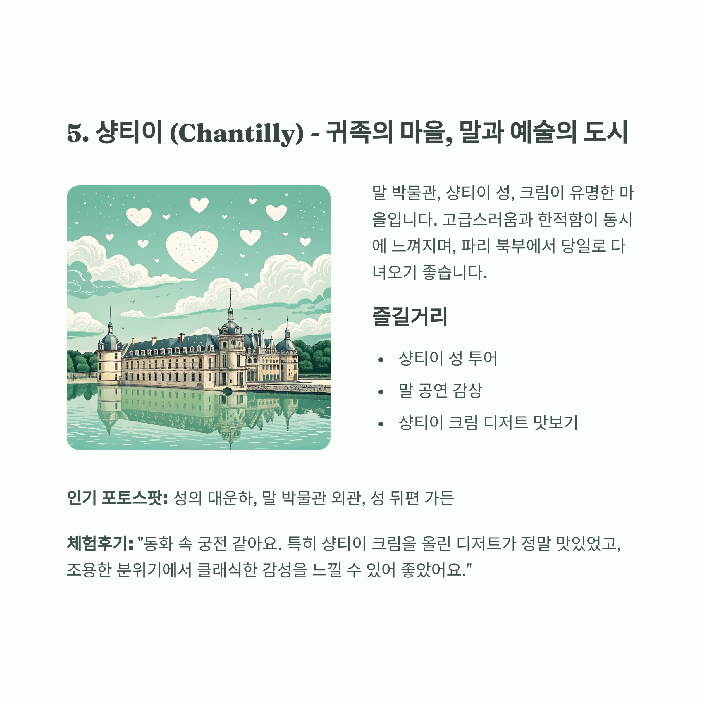 한적함이 동시에 느껴지며, 파리 북부에서 당일로 다녀오기 좋습니다.즐길거리: 샹티이 성 투어, 말 공연 감상, 샹티이 크림 디저트 맛보기
