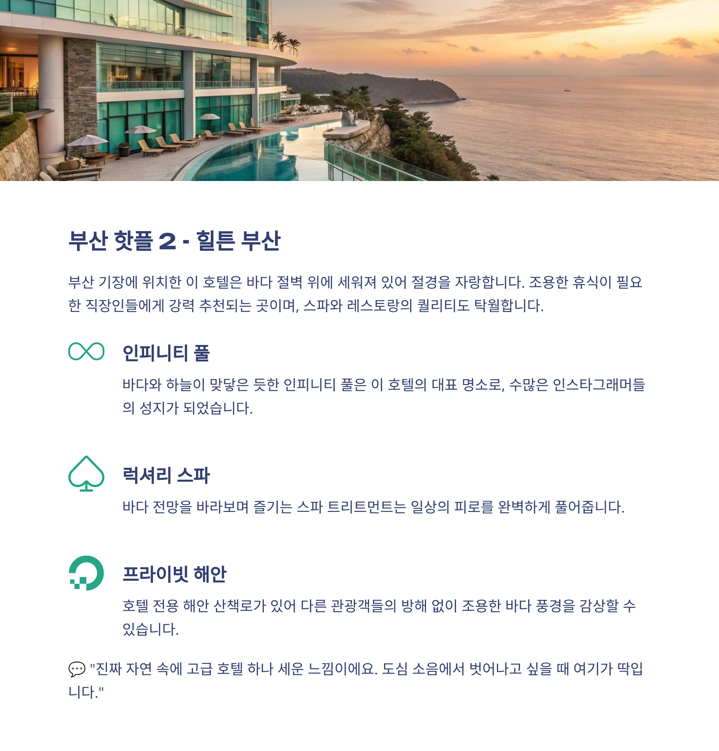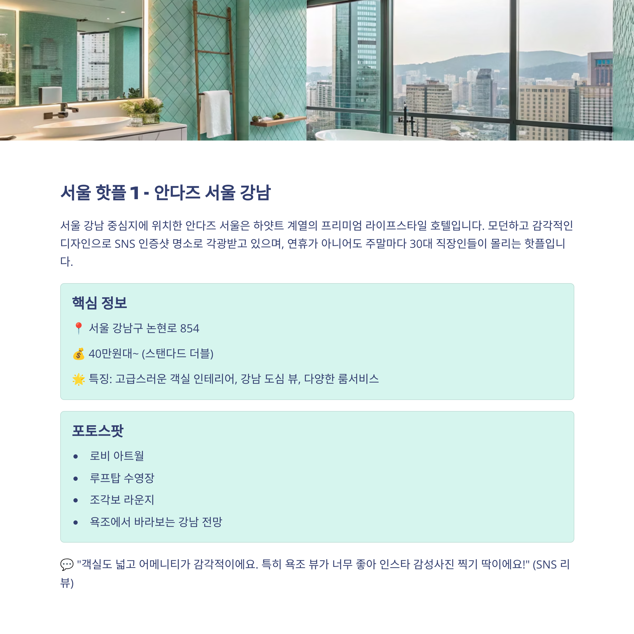 안다즈 서울 서울 도심형 감성호텔 로비 아트월, 수영장 뷰 파라다이스 부산 부산 해변 앞 스파와 풀 야외 스파, 선셋 포인트 그랜드 하얏트 제주 제주 초대형 복합 호텔 미디어월, 고층뷰 롯데호텔 월드 서울 놀이공원 연계형 호텔 석촌호수 뷰, 불꽃놀이 전망 힐튼 부산 부산 절벽 위 휴식형 호텔 인피니티풀, 해변 산책로 해비치 제주 제주 제주 문화형 리조트 호텔 해변 테라스, 정원 전망대 포시즌스 서울 서울 고급 정통 럭셔리 호텔 광화문 뷰 라운지, 바