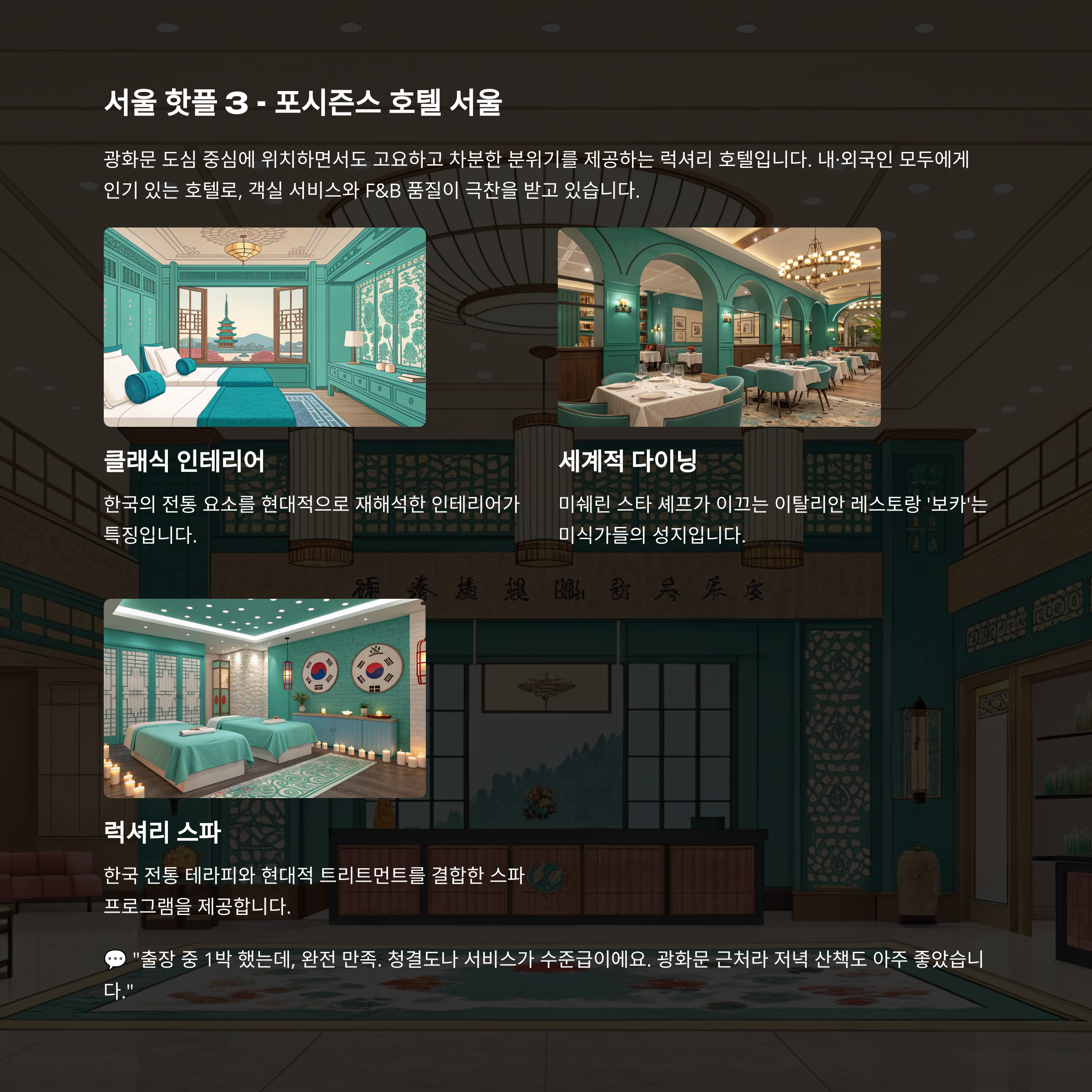 특징: 클래식한 인테리어, 세계적 수준의 다이닝