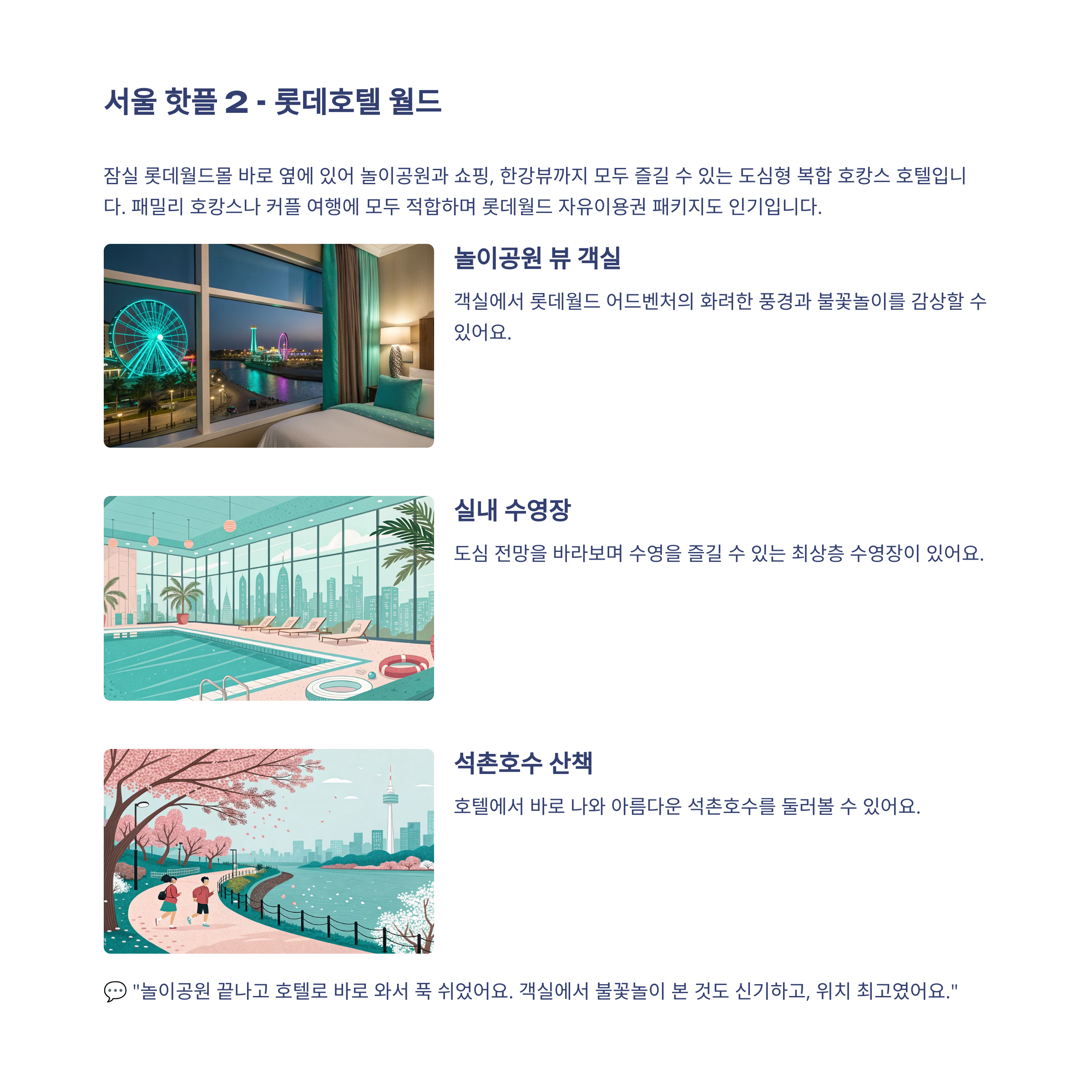 즐길거리: 롯데월드 어드벤처, 석촌호수 산책, 쇼핑몰 투어