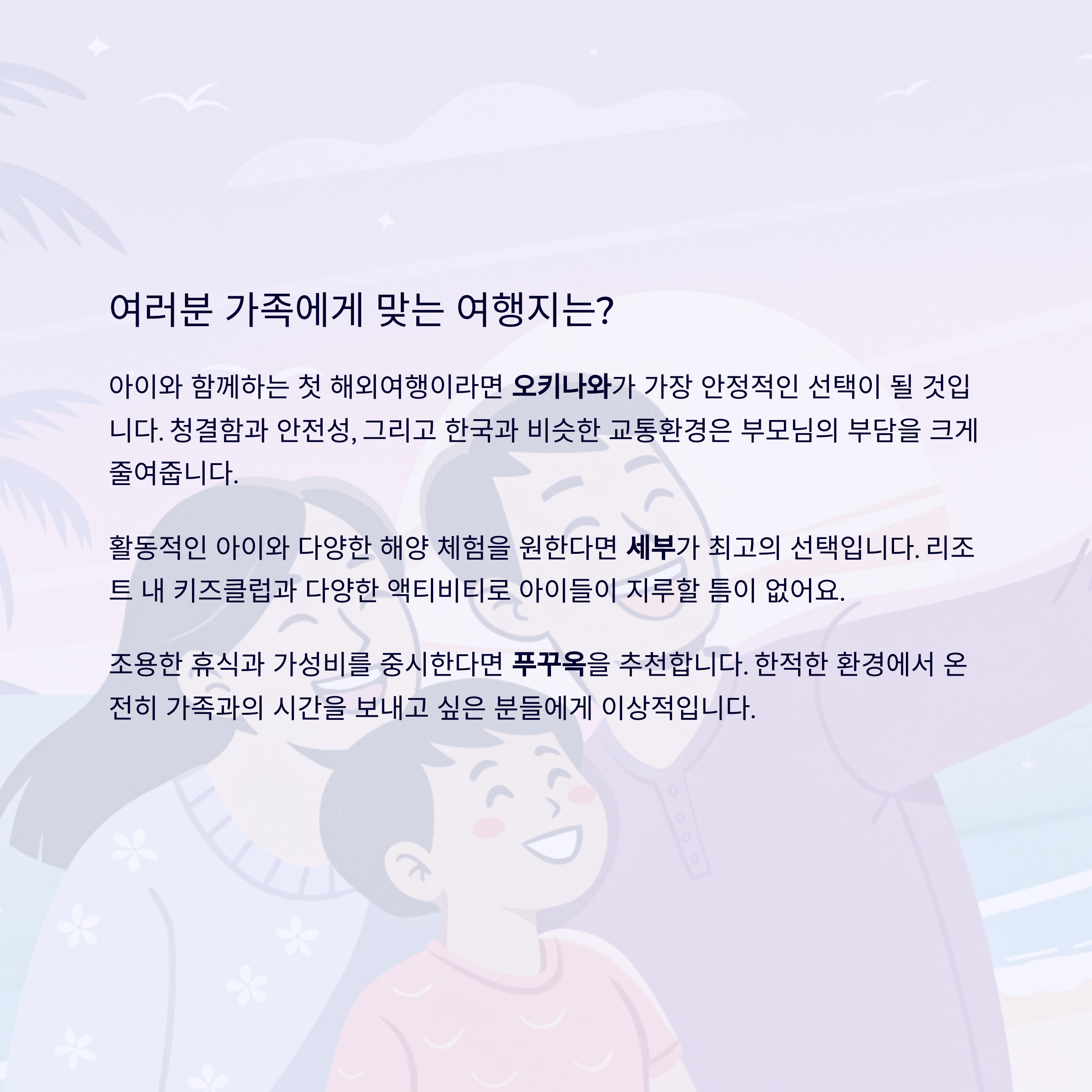 가족여행 3박 4일, 오키나와 vs 세부 vs 푸꾸옥 어디가 좋을까?여행 2025. 7. 30. 19:00