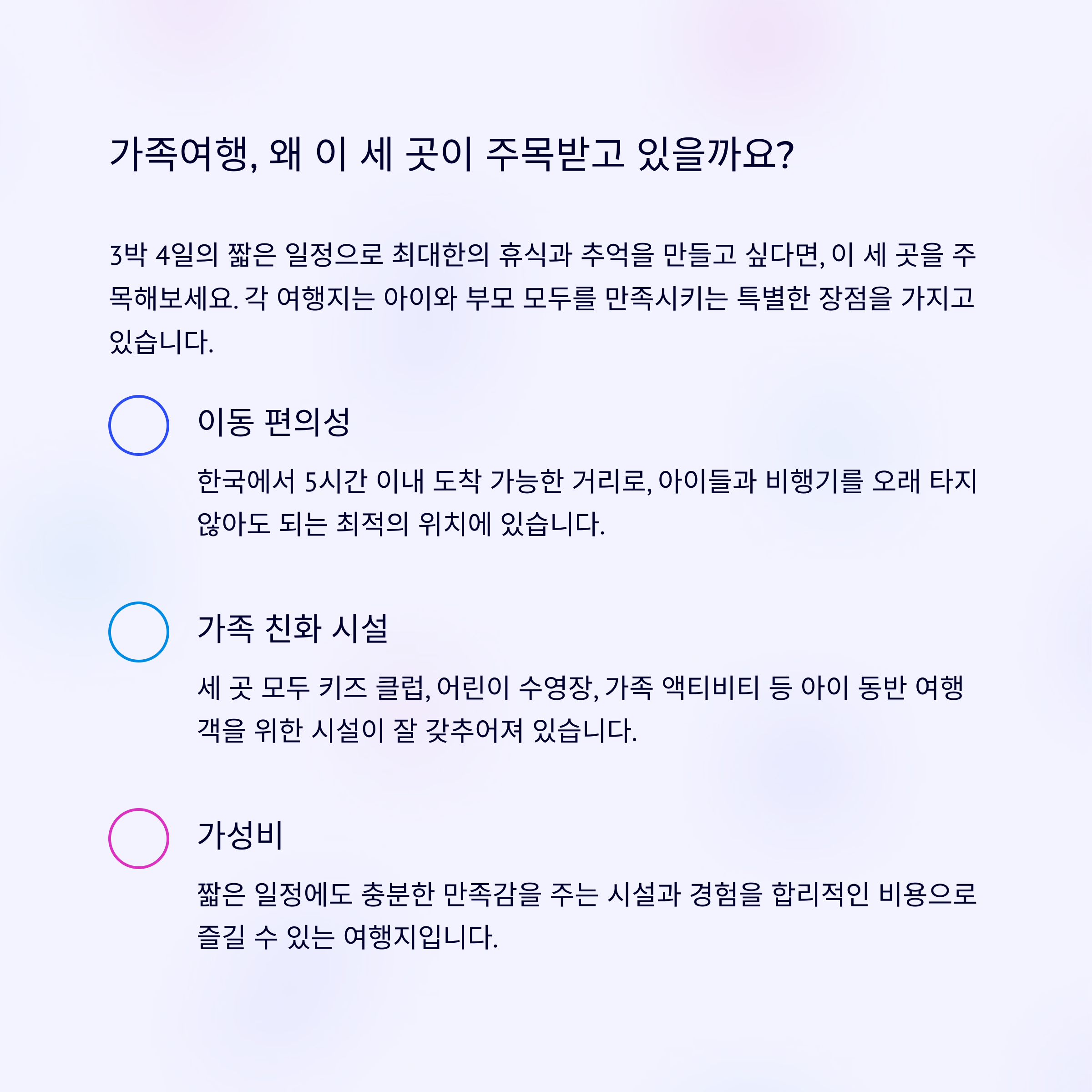 가족과 함께 하는 3박 4일 해외여행을 고민 중이라면, 휴양과 체험, 편의시설까지
