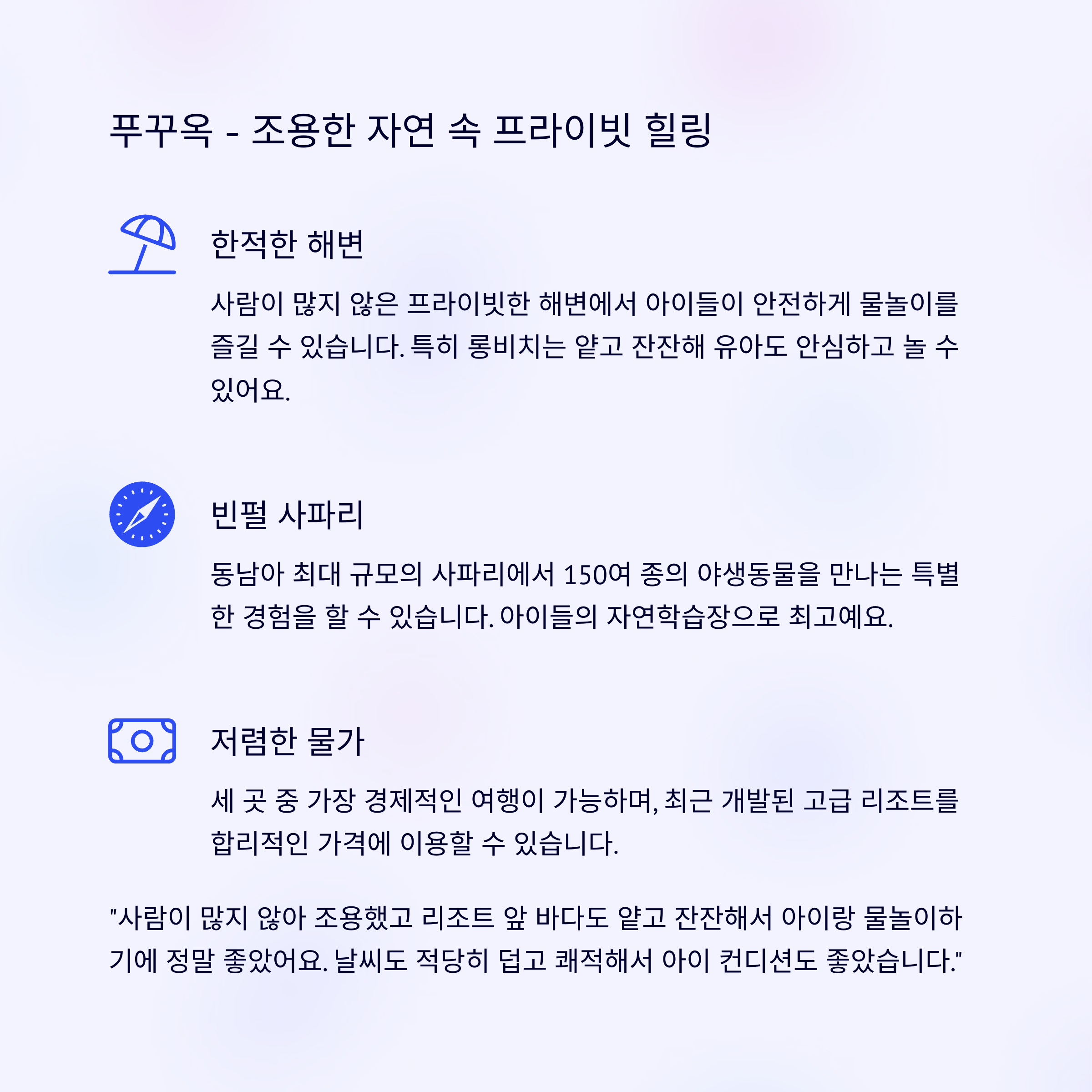 반면 푸꾸옥은 '조용한 자연 속 휴양과 저렴한 여행비'가 핵심 포인트입니다.가족 구성원의 연령과 성향에 따라 선택지가 달라질 수 있지만,