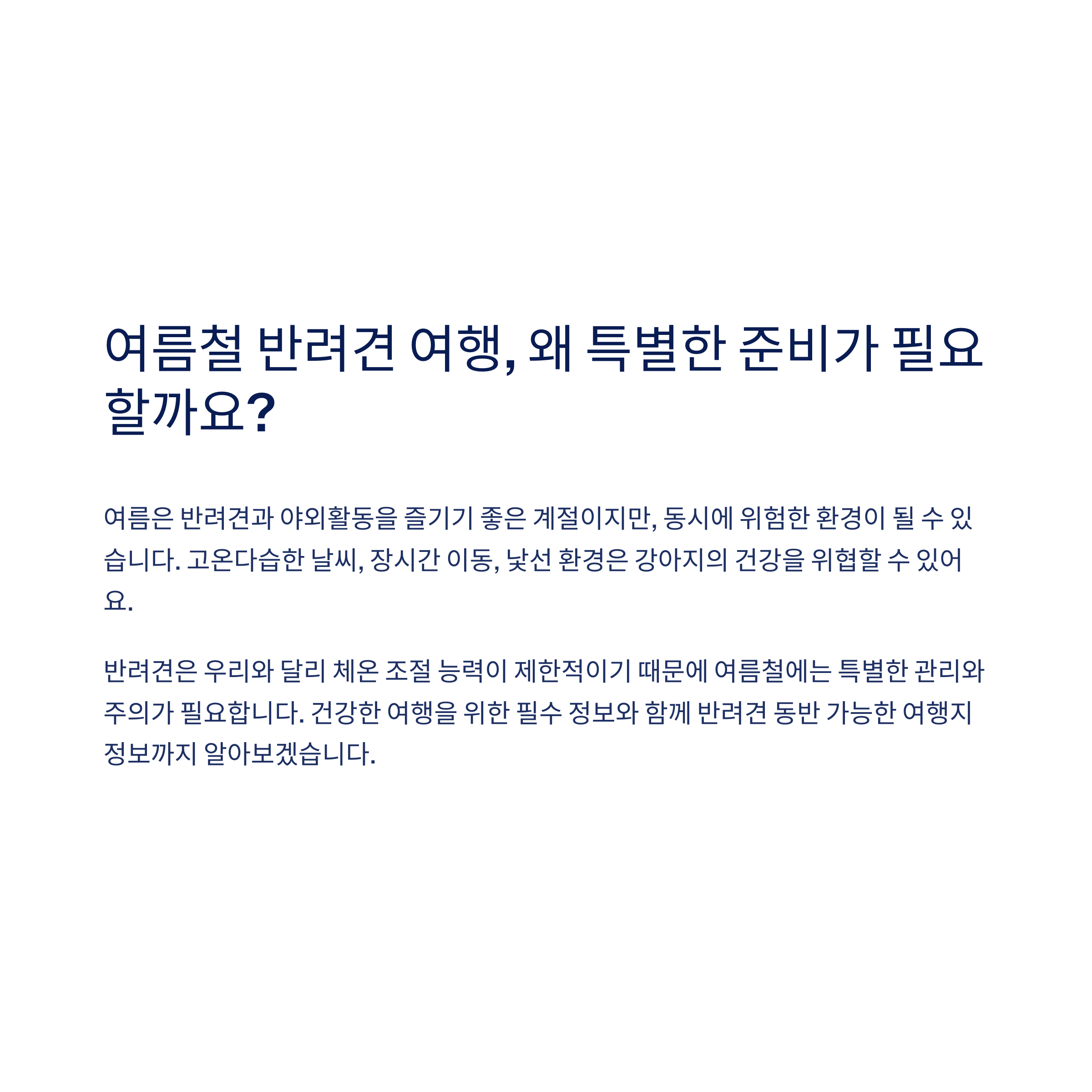 여름은 반려견과 함께 야외활동을 즐기기 좋은 계절이지만, 동시에 강아지에게 위험한 환경이 될 수 있습니다. 고온다습한 날씨, 장시간 이동, 낯선 환경은 강아지의 건강을 위협할 수 있기 때문에 여름철 반려견 건강관리와 여행 시 주의사항을 철저히 알아두는 것이 중요합니다. 또한 반려견과 함께 떠날 수 있는 여행지 정보와 후기도 함께 정리해 보았습니다.
