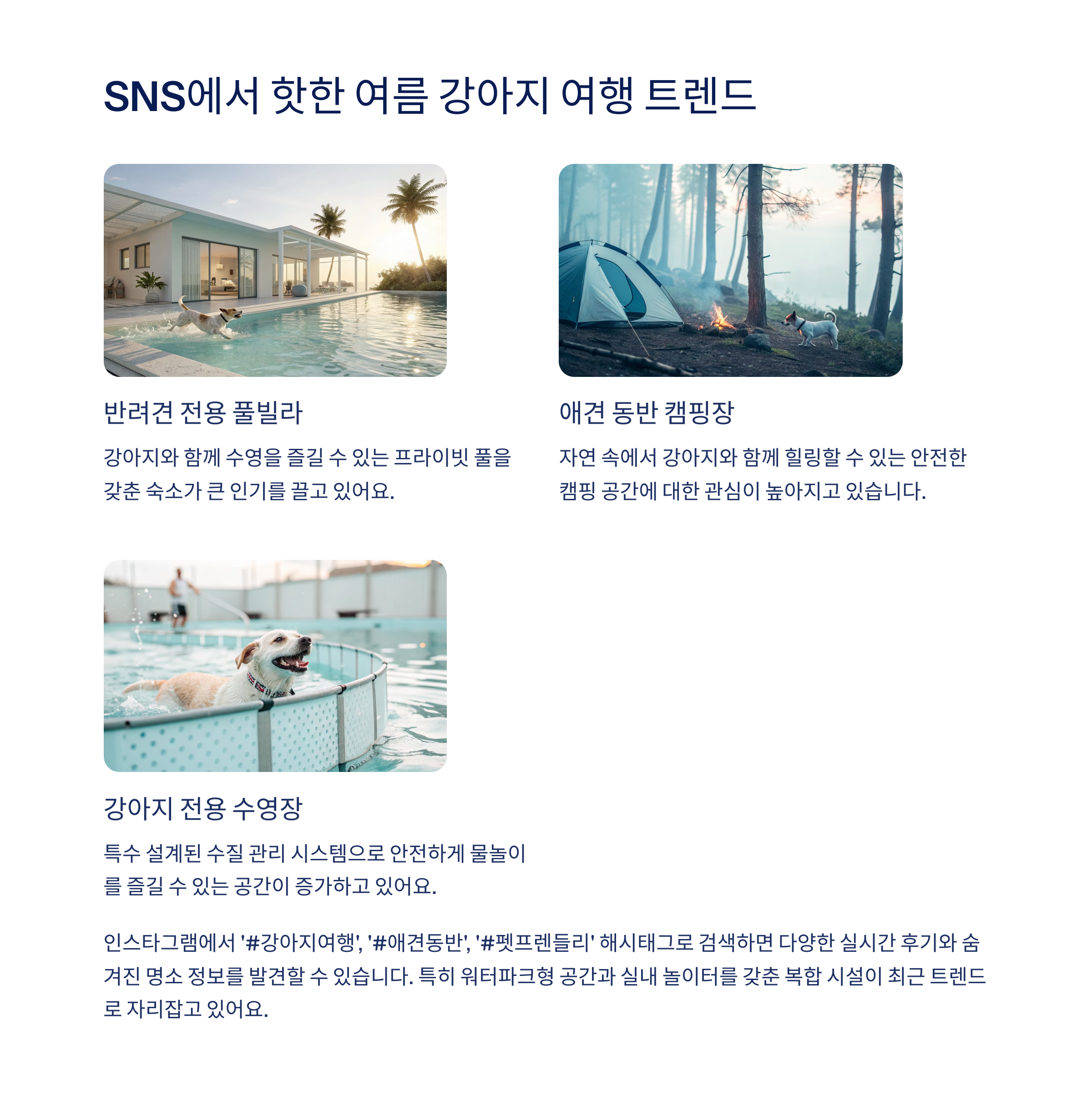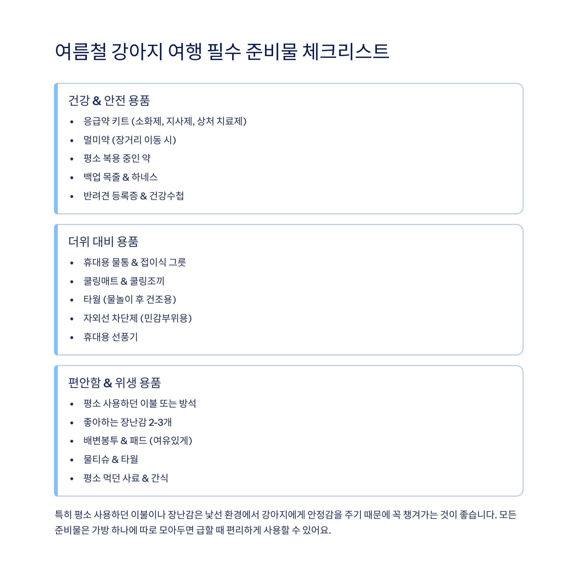 강아지도, 보호자도 모두 만족스러운 시간을 보낼 수 있습니다.아래는 1박 2일 기준 강아지 동반 여름 여행 일정 요약표입니다.