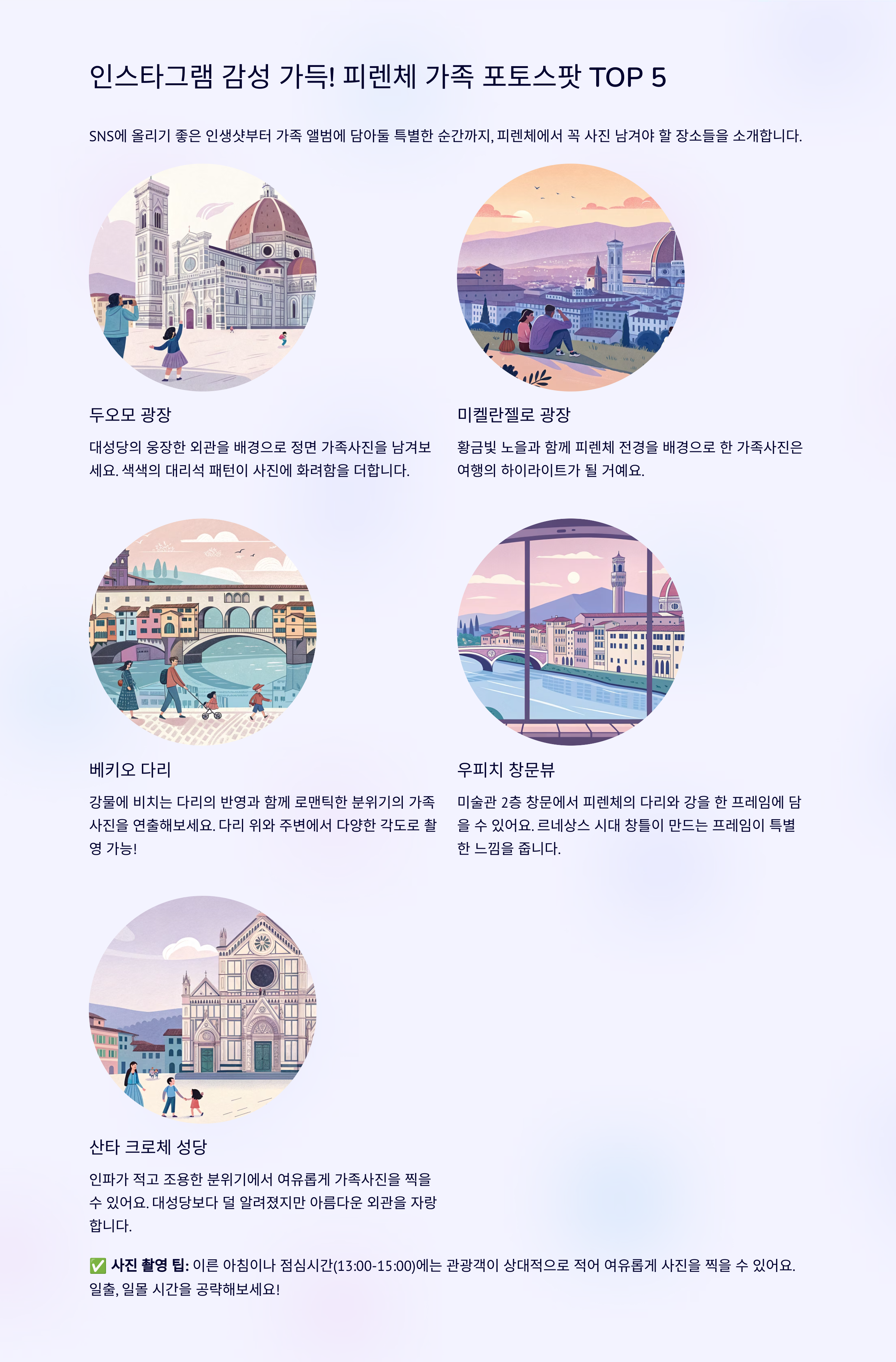 두오모 광장 대성당 배경의 정면 가족사진 촬영 인기 미켈란젤로 광장 황금빛 노을 아래 전경 배경 셀카 베키오 다리 주변 강을 배경으로 로맨틱한 분위기의 가족사진 우피치 미술관 창문뷰 피렌체의 다리와 강을 한 프레임에 담을 수 있음 산타 크로체 성당 앞 인파가 적고 조용한 분위기의 가족 사진 명소