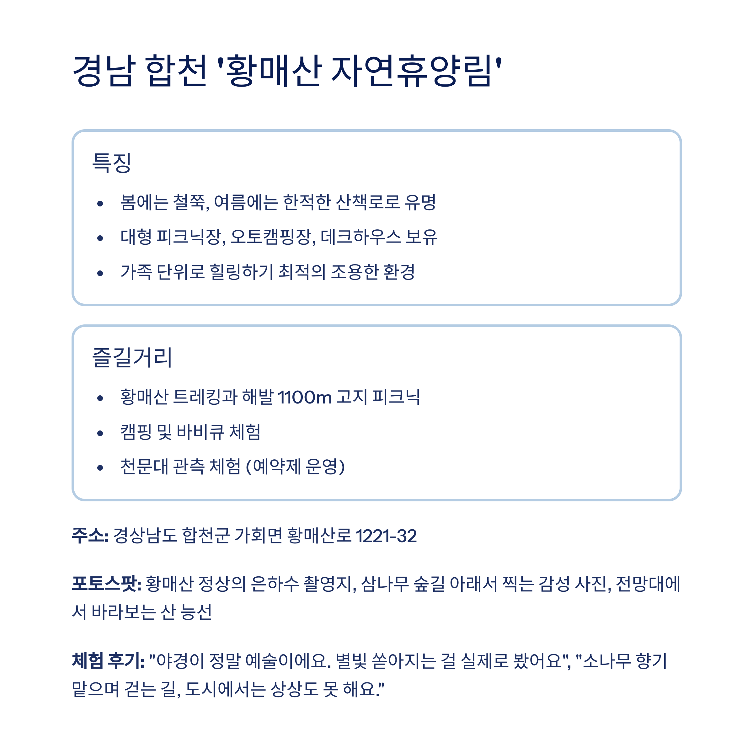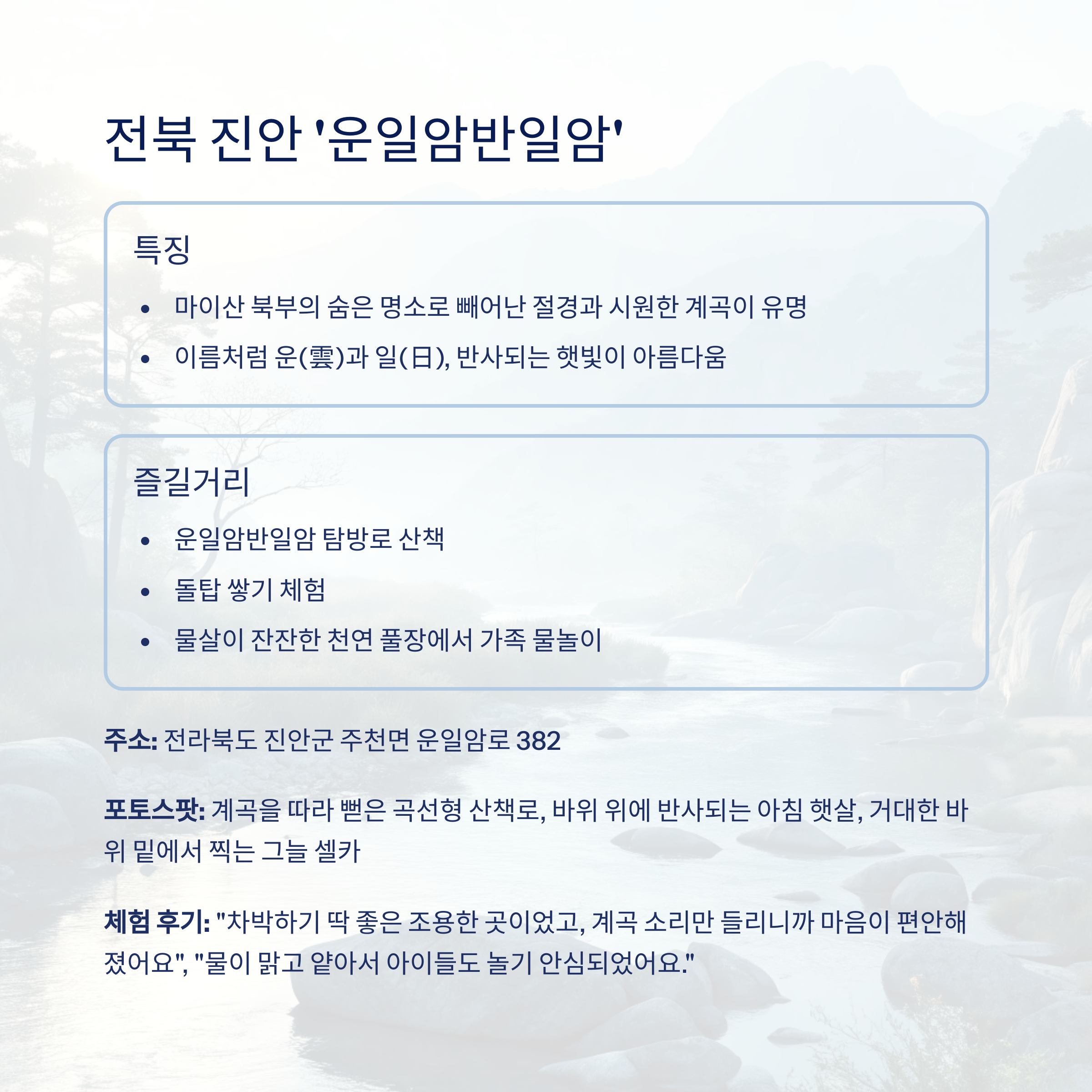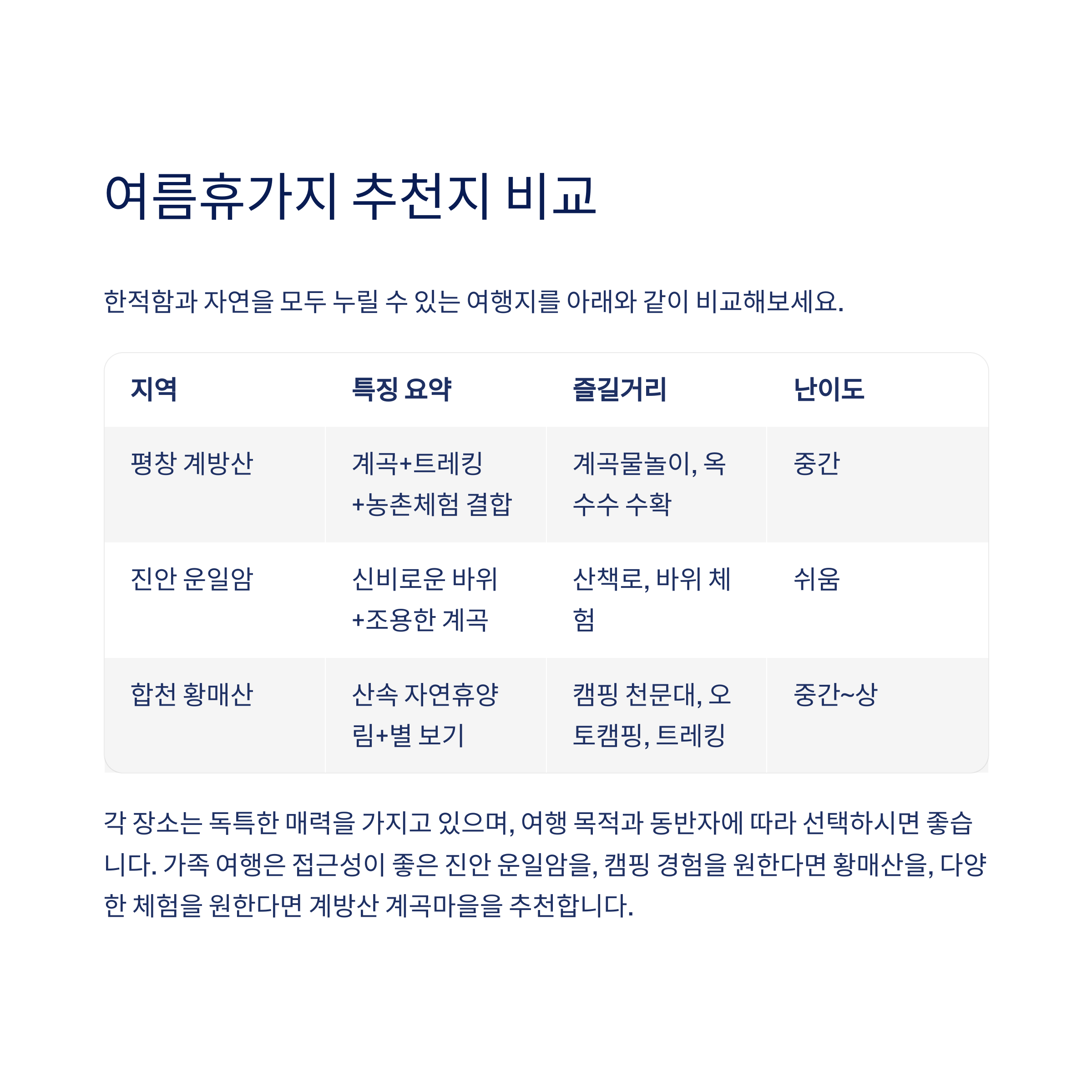 평창 계방산 계곡+트레킹+농촌체험 결합 계곡물놀이, 옥수수 수확 중간 진안 운일암 신비로운 바위+조용한 계곡 산책로, 바위 체험 쉬움 합천 황매산 산속 자연휴양림+별 보기 캠핑 천문대, 오토캠핑, 트레킹 중간~상