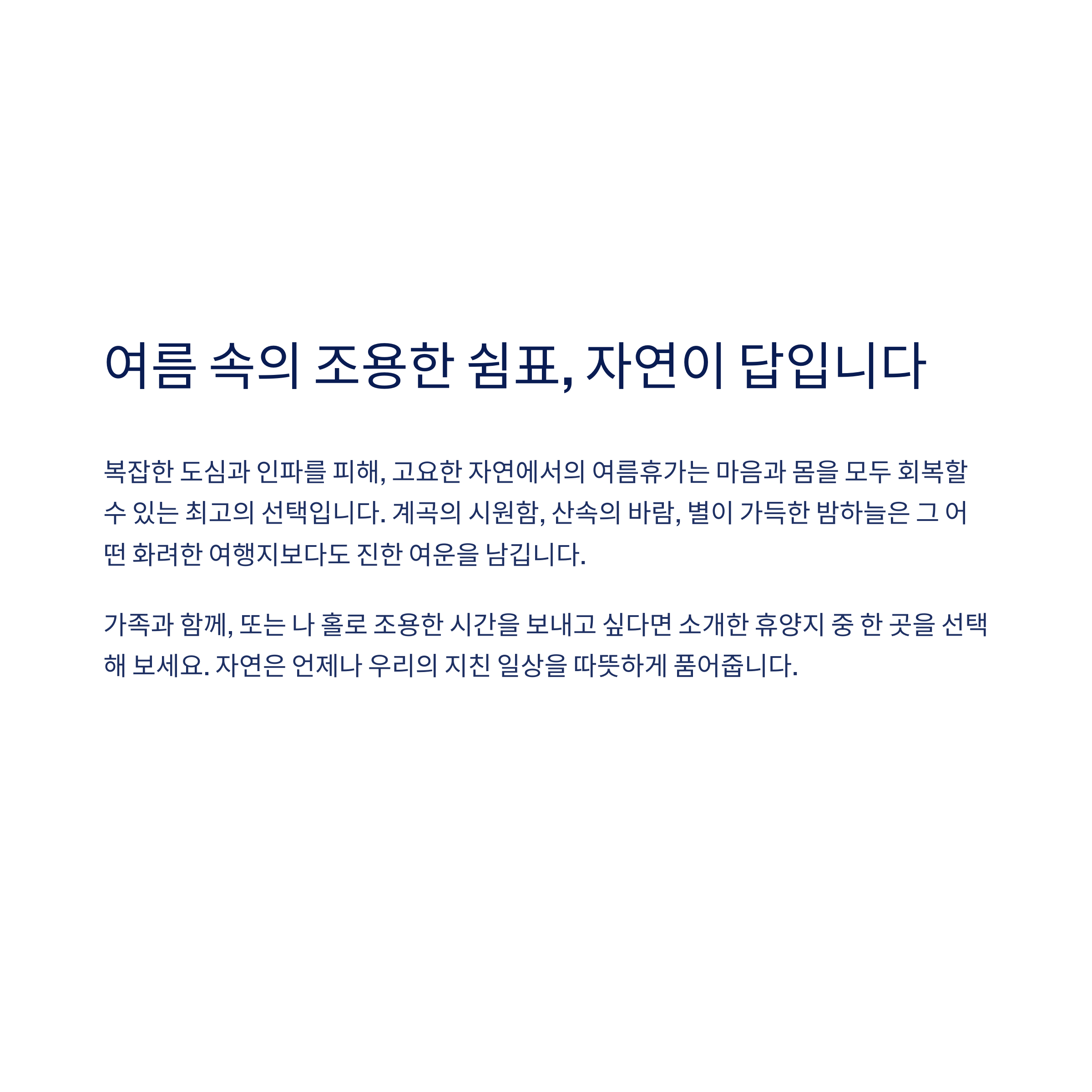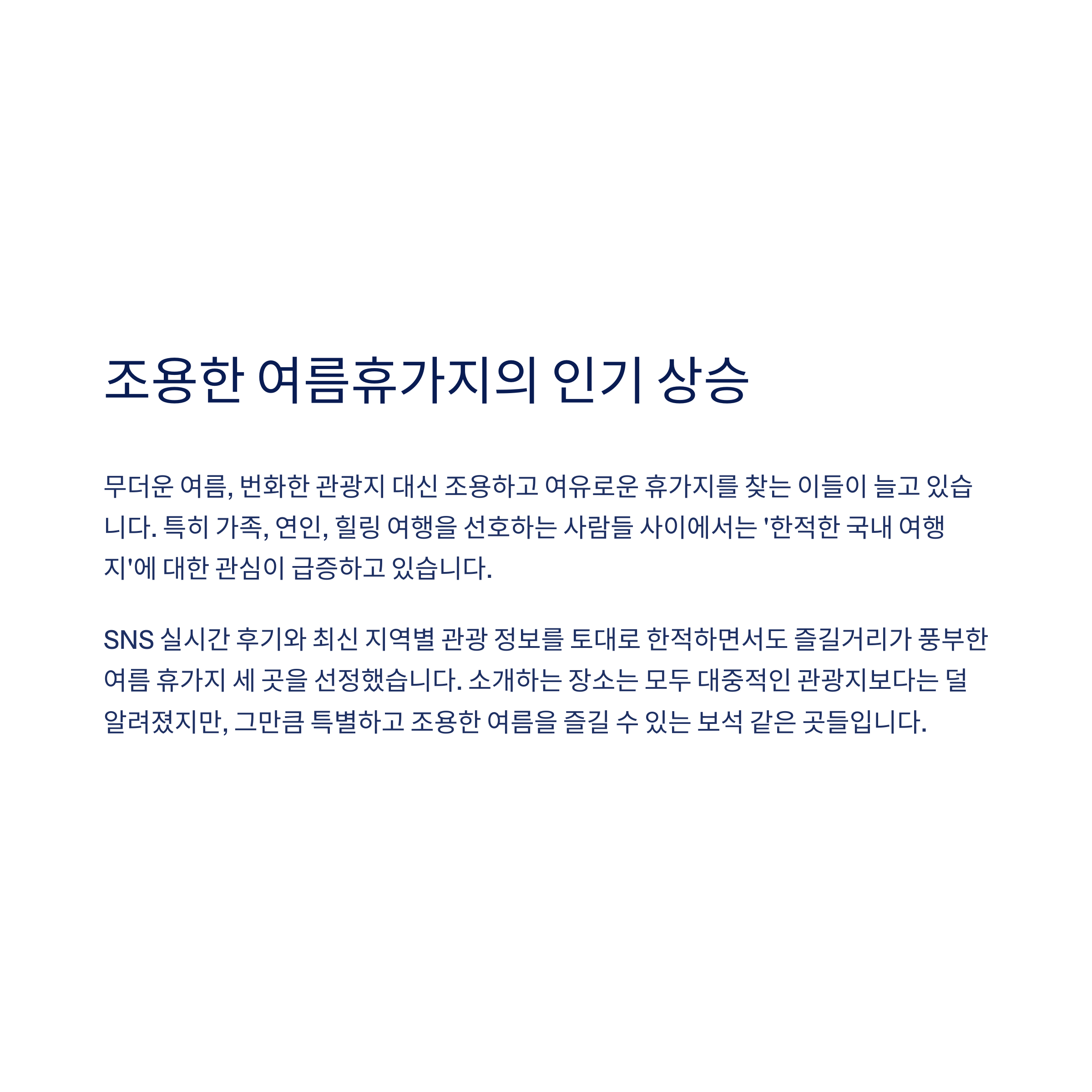 소개하는 장소는 모두 대중적인 관광지보다는 덜 알려졌지만, 그만큼 특별하고 조용한 여름을 즐길 수 있는 보석 같은 곳들입니다.