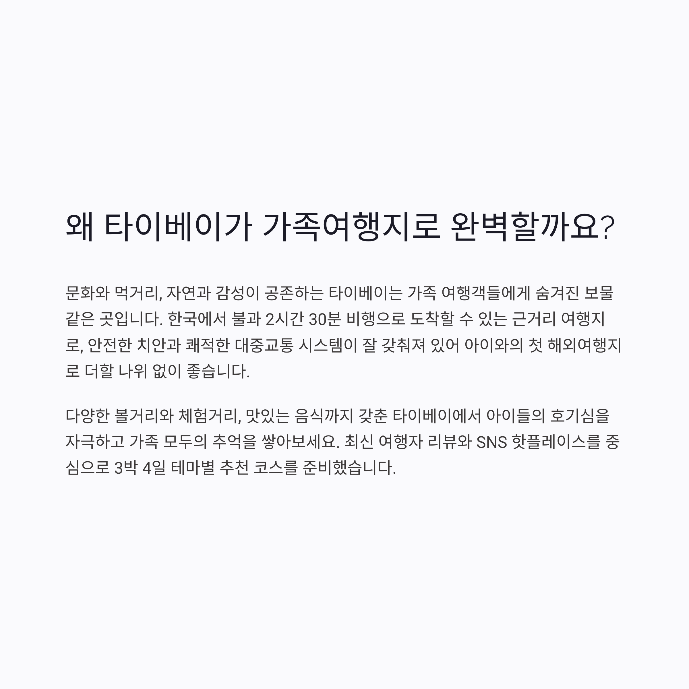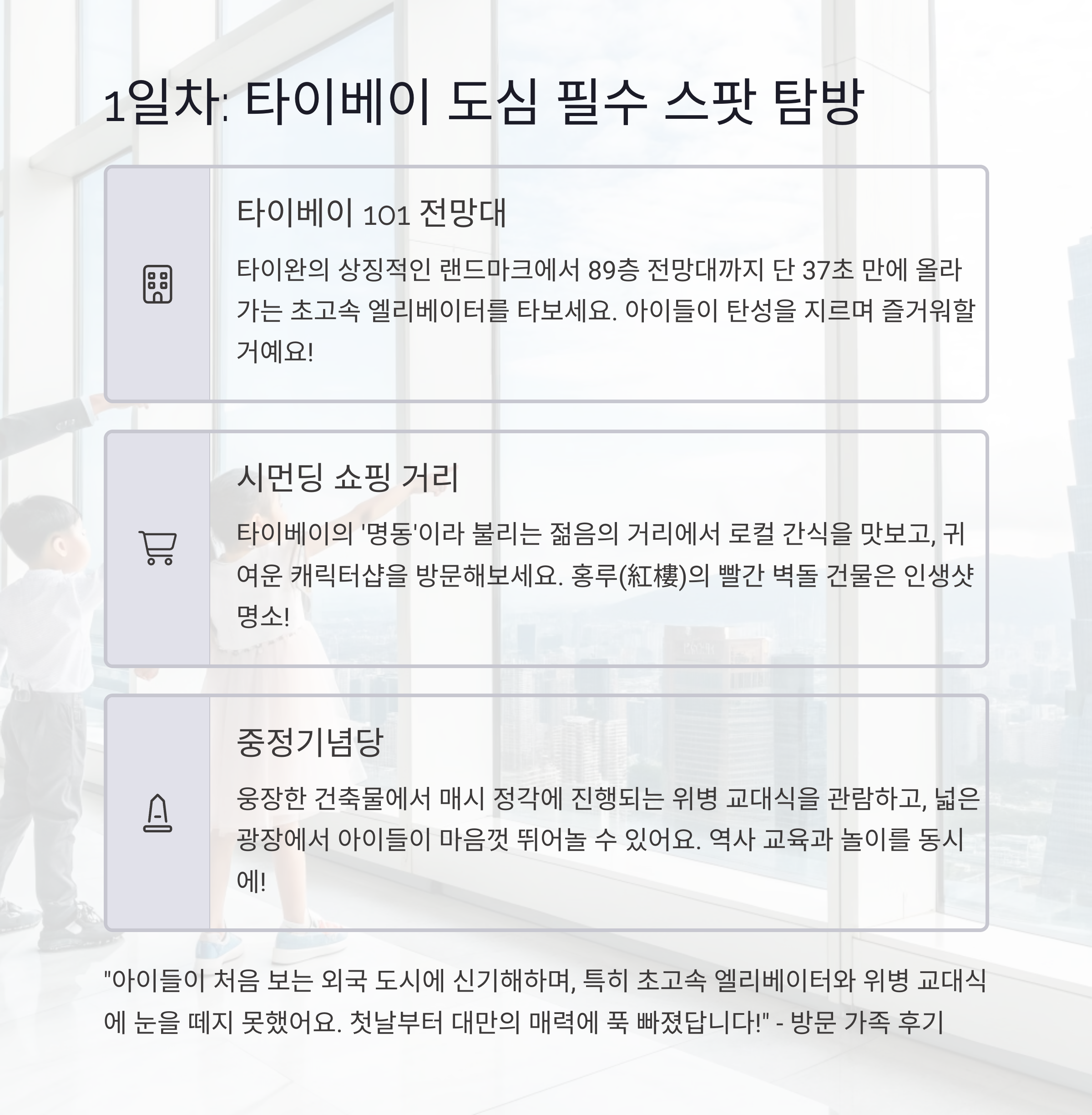 1일차 도심 관광 타이베이 101, 시먼딩, 중정기념당 타이페이 필수 방문지 탐방 2일차 자연+역사 양명산, 베이터우 도서관, 단수이 구도심 조용한 산책과 강변 야경 체험 3일차 실내 체험+교육 고궁박물관, 어린이 신세계, 미라마몰 아이중심 프로그램과 쾌적함 4일차 쇼핑+휴식 용캉제 거리, 핸드메이드 마켓, 브런치 카페 여행 마무리 기념품+힐링 브런치 타이베이는
