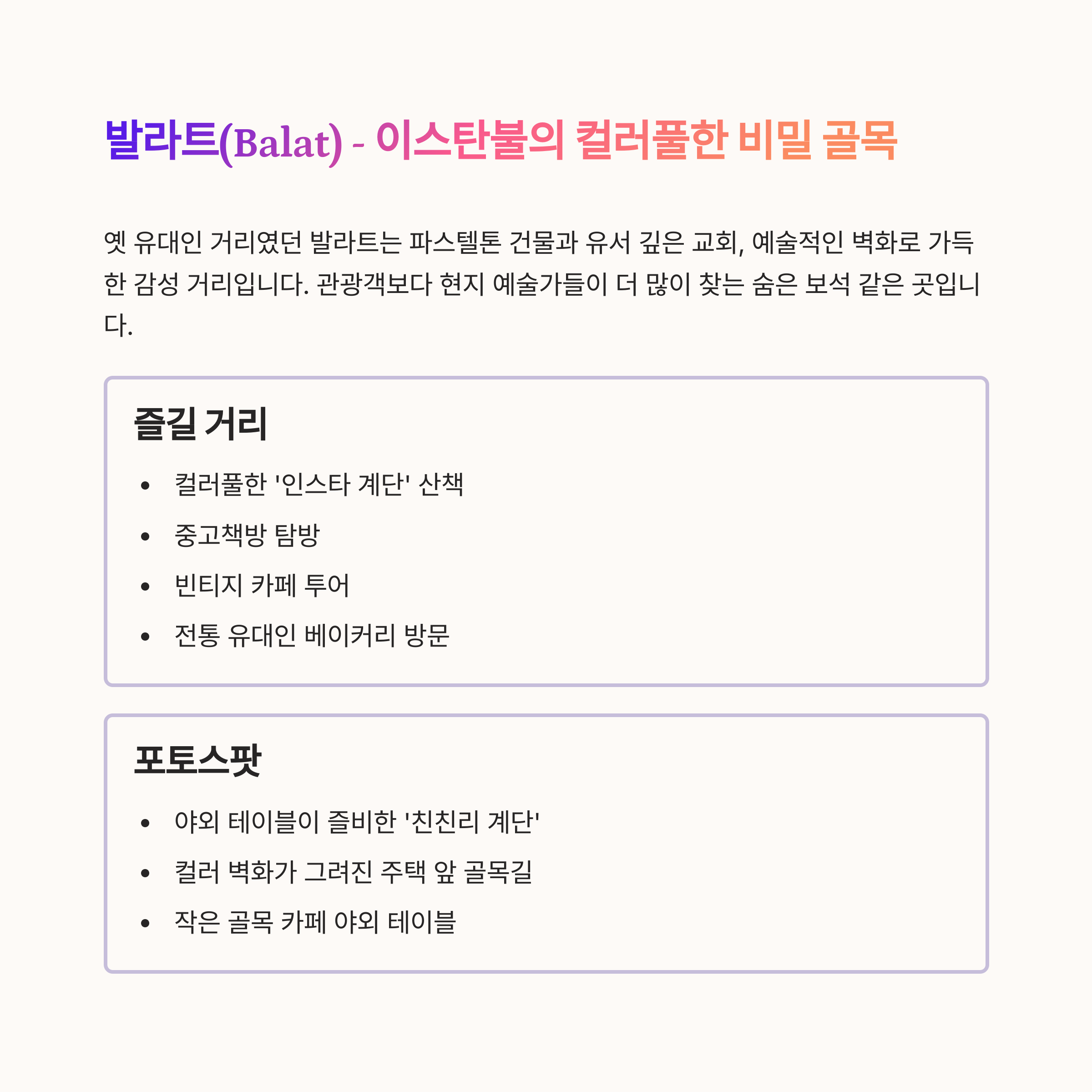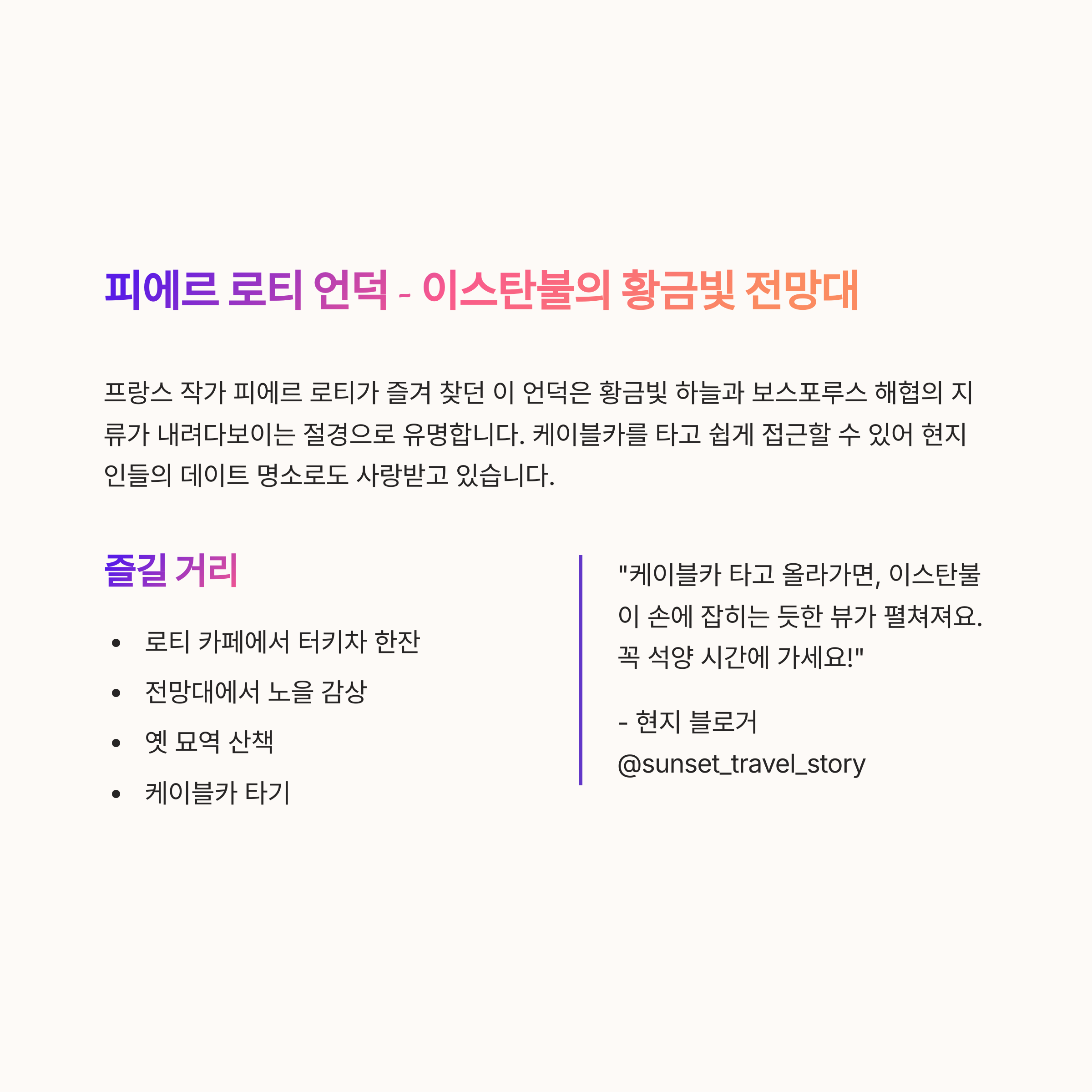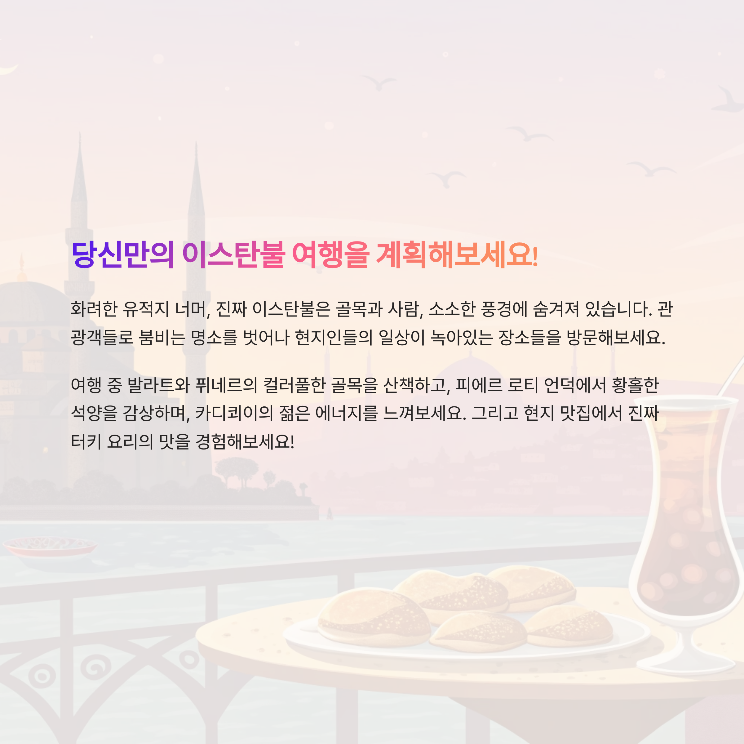 1일차 발라트·퓌네르 구역 산책 감성 골목 걷기, 유대인 전통 베이커리 체험 2일차 피에르 로티 언덕 – 예니카프 해변 석양 감상, 가을 산책, 터키차 티타임 3일차 카디쾨이 – Çiya Sofrası 저녁식사 젊은 거리 감성, 독립서점, 현지 맛집 탐방 4일차 츠루코루 앤티크 거리 – 순수 박물관 골동품 탐방, 박물관 관람, 느긋한 오후 시간 5일차 카라쾨이 해산물 점심 후 출국 이스탄불 모던 감성 마무리, 쇼핑 및 공항 이동 화려한 유적지 너머, 진짜 이스탄불은 골목과 사람, 소소한 풍경에 숨겨져 있습니다.