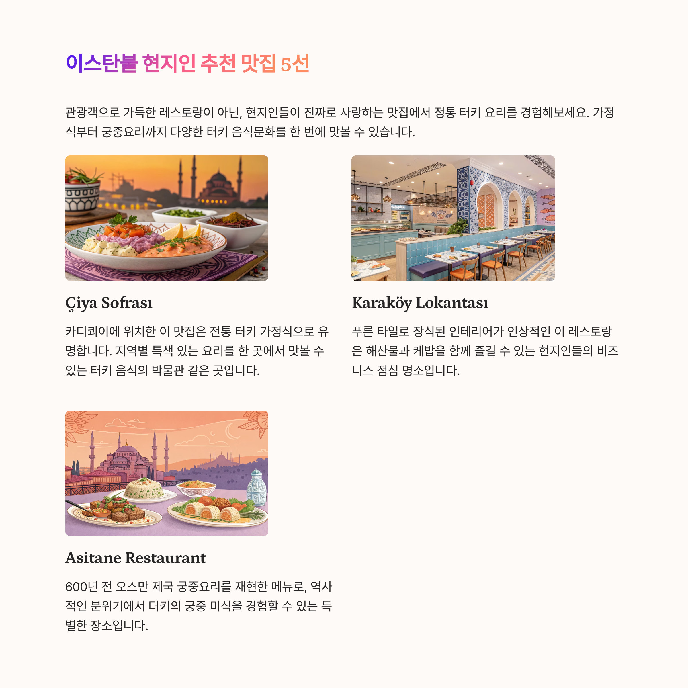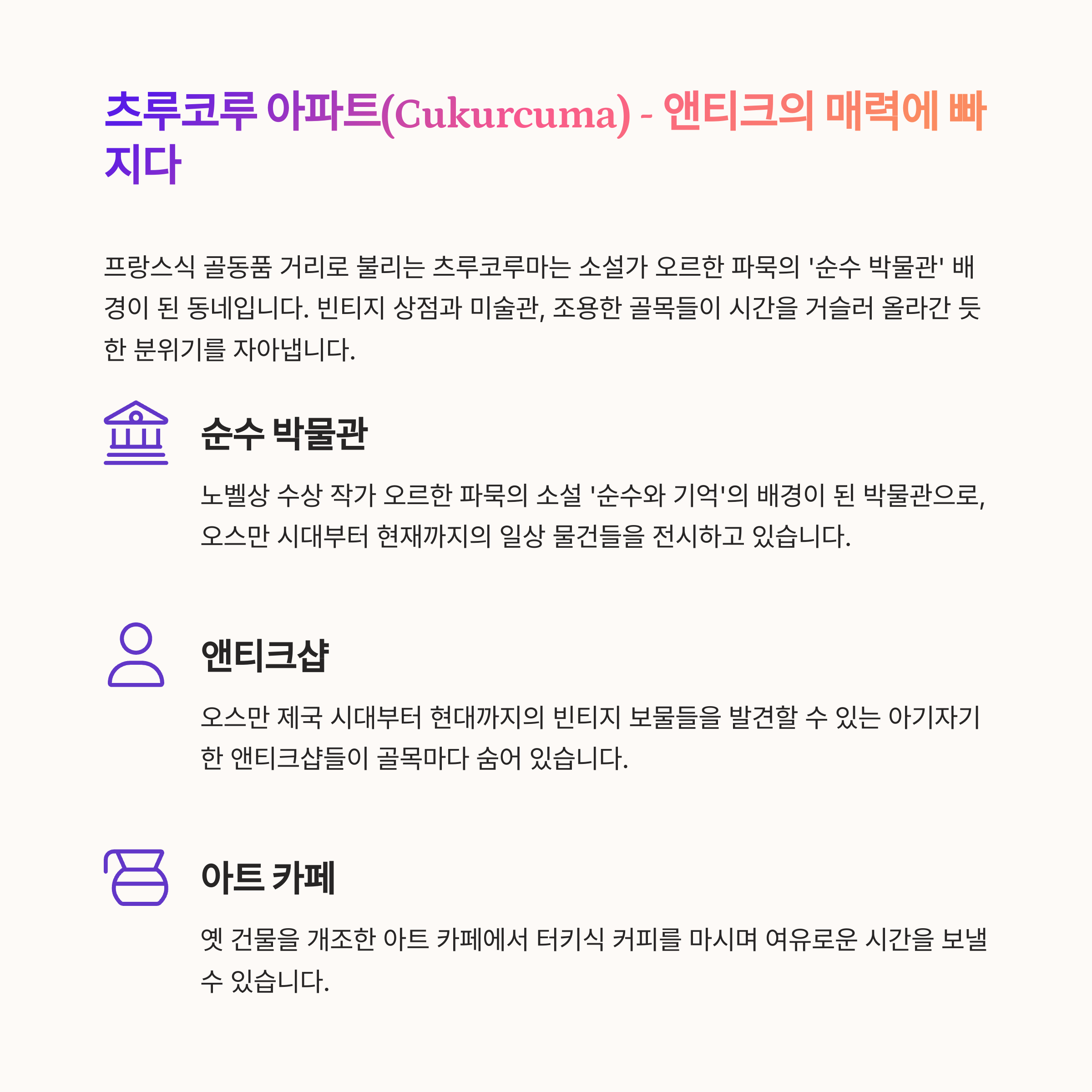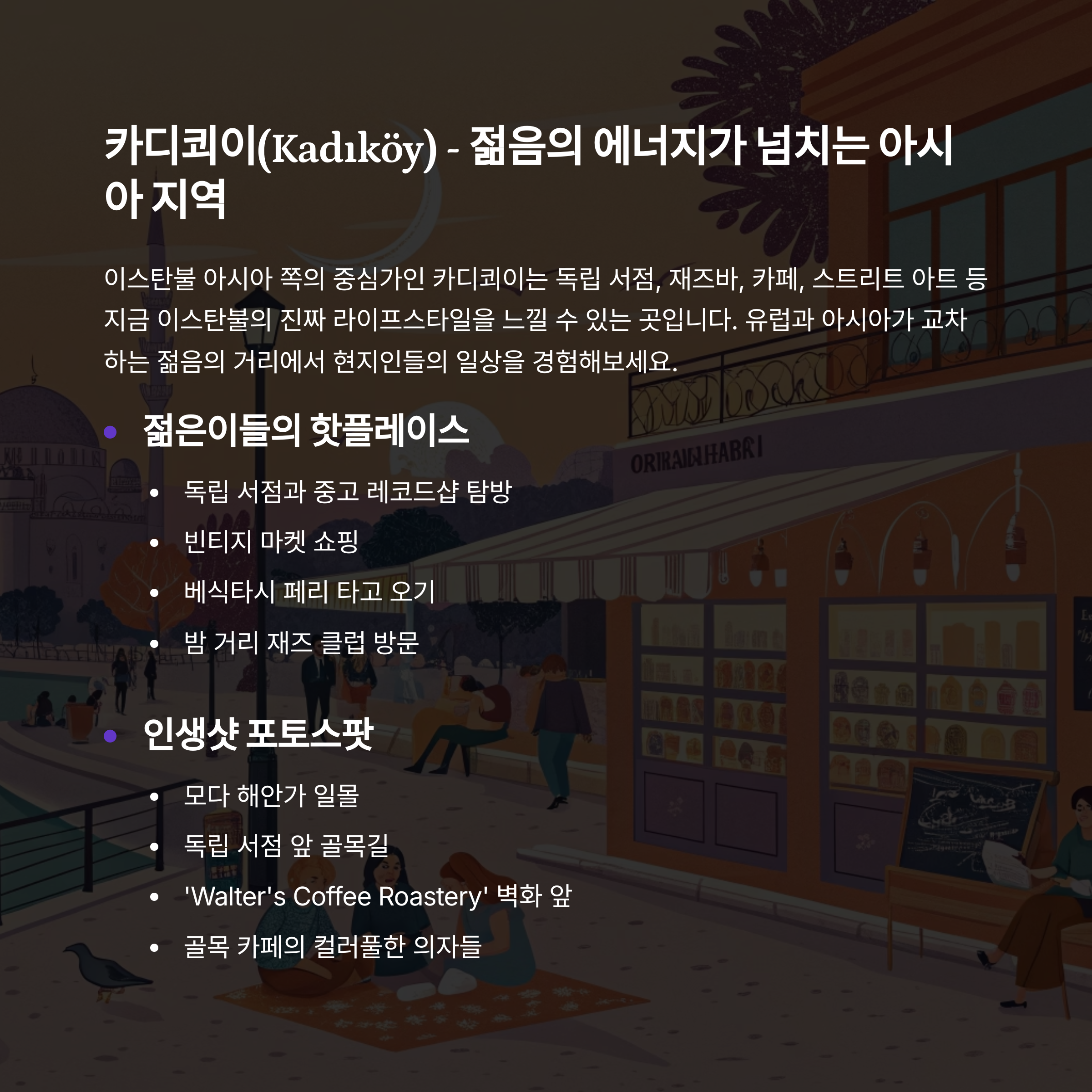 1일차 발라트·퓌네르 구역 산책 감성 골목 걷기, 유대인 전통 베이커리 체험 2일차 피에르 로티 언덕 – 예니카프 해변 석양 감상, 가을 산책, 터키차 티타임 3일차 카디쾨이 – Çiya Sofrası 저녁식사 젊은 거리 감성, 독립서점, 현지 맛집 탐방 4일차 츠루코루 앤티크 거리 – 순수 박물관 골동품 탐방, 박물관 관람, 느긋한 오후 시간 5일차 카라쾨이 해산물 점심 후 출국 이스탄불 모던 감성 마무리, 쇼핑 및 공항 이동 화려한 유적지 너머, 진짜 이스탄불은 골목과 사람, 소소한 풍경에 숨겨져 있습니다.