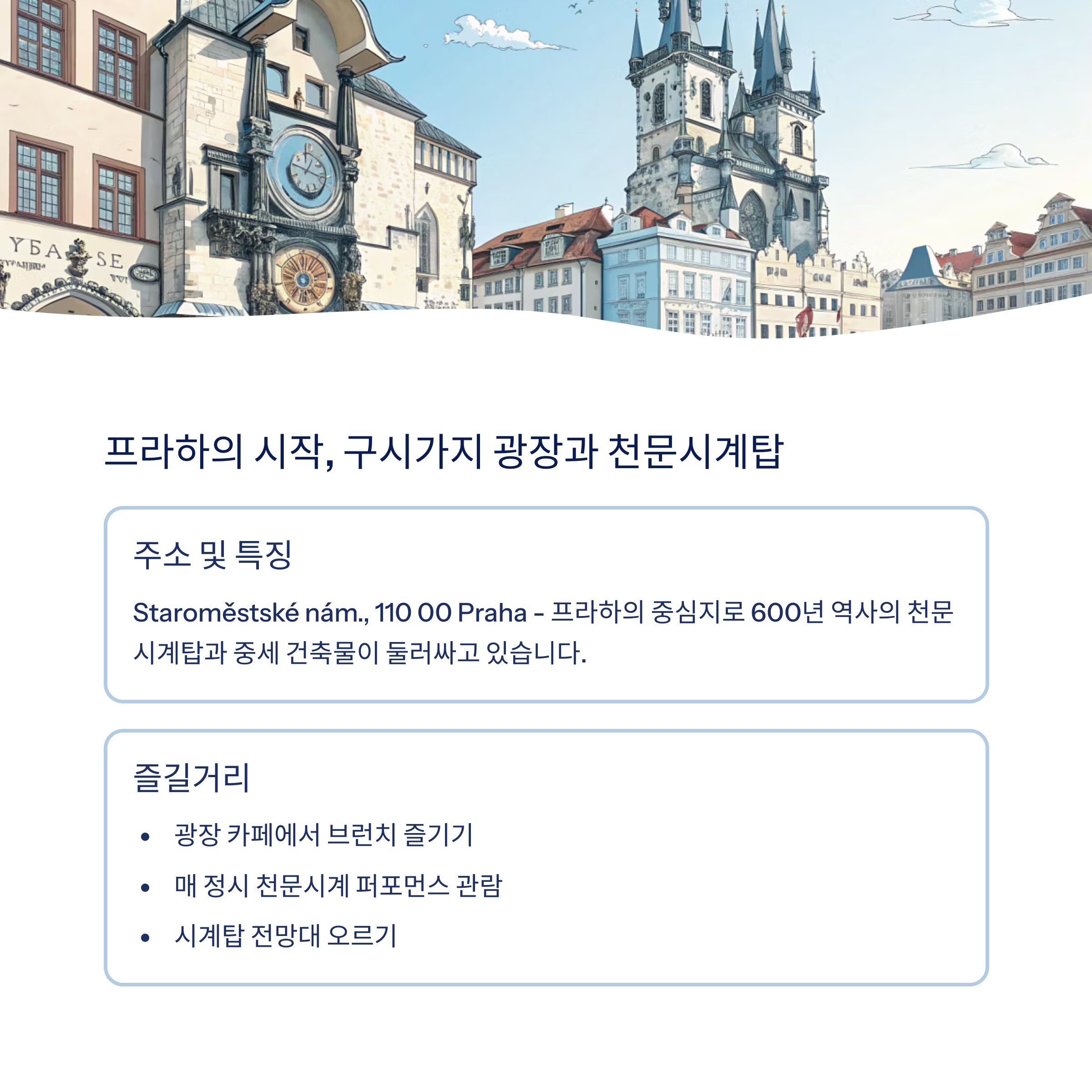 “딱 프라하 느낌이 나는 곳! 천문시계 퍼포먼스는 귀엽고, 광장에서 마시는 커피는 정말 영화 같았어요.”