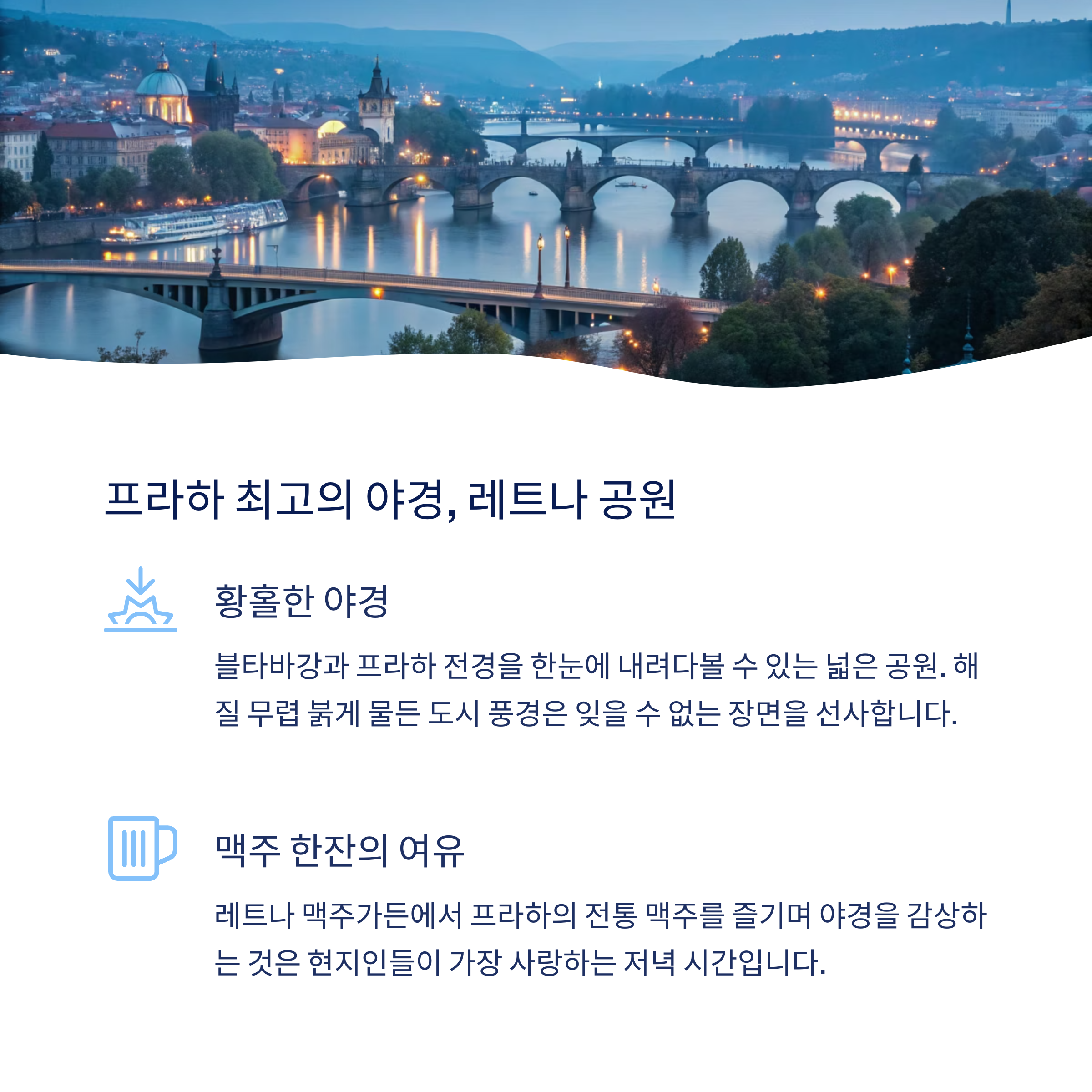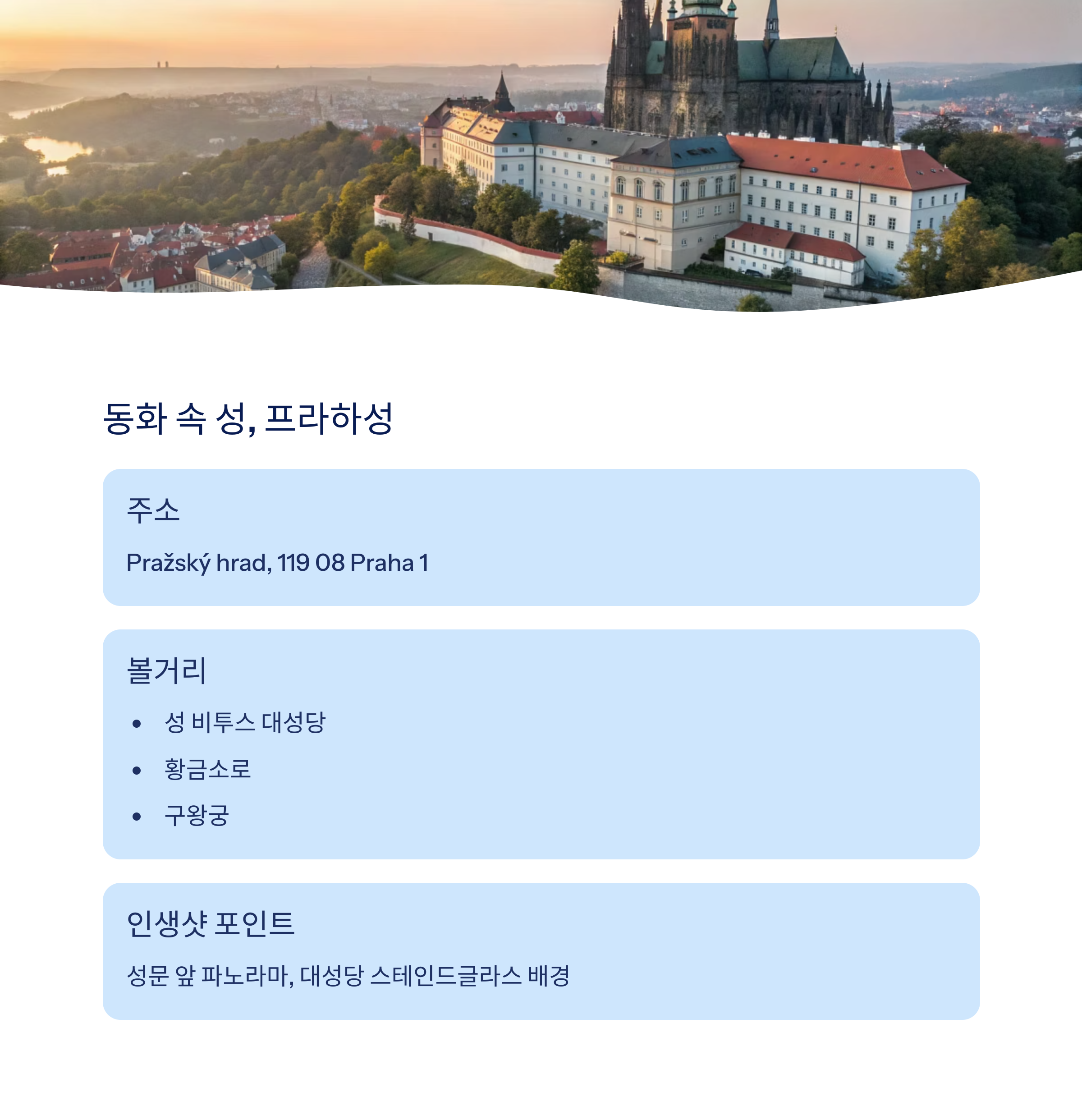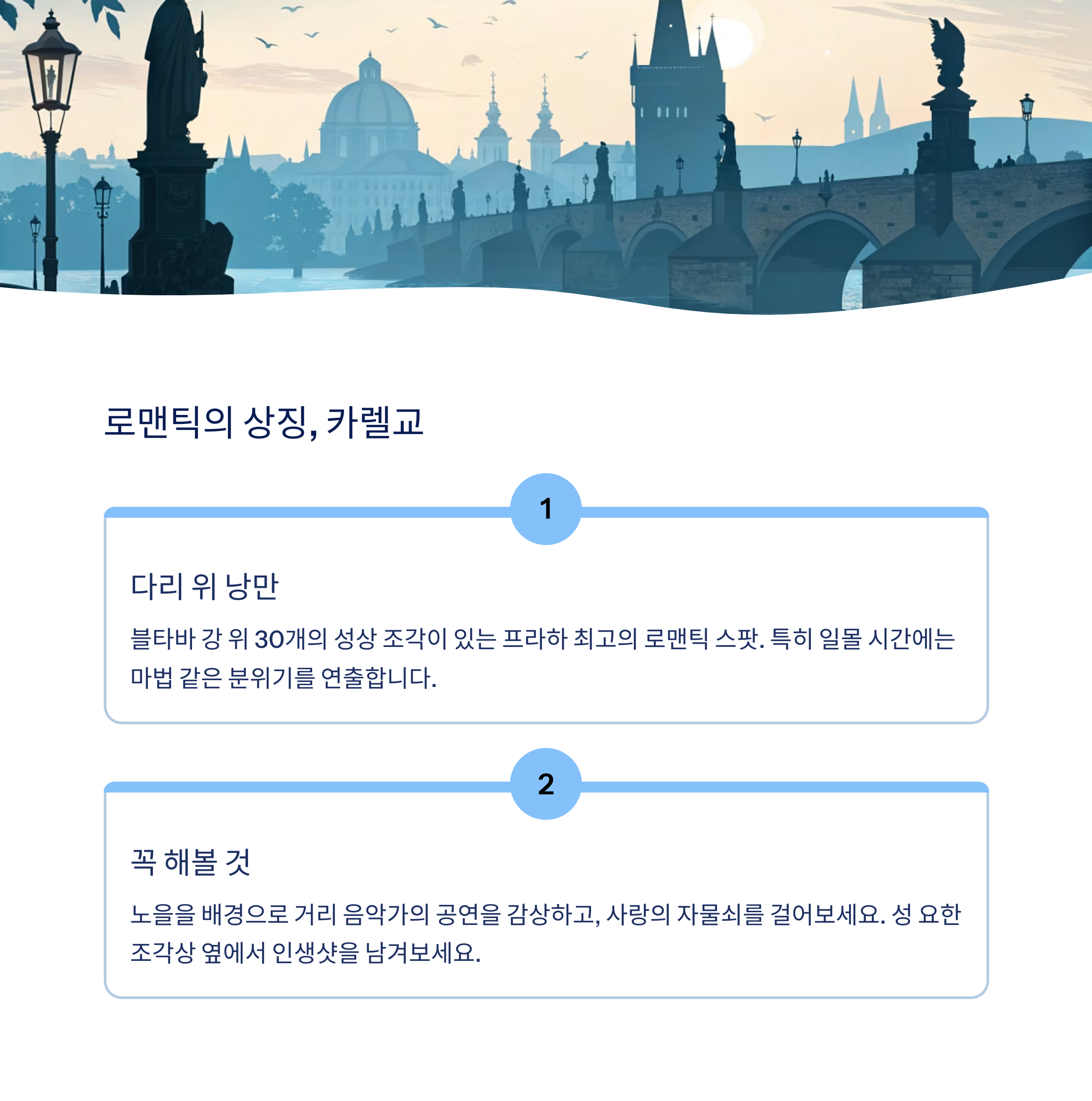 프라하는 단순히 고성의 도시가 아닙니다. 걷는 길마다 역사가 있고, 입에 넣는 음식마다 전통이 있고, 눈에 담는 풍경마다 감동이 있는 도시입니다. 여유롭게 걸으며 마주치는 장면마다 마음을 울리는 낭만이 가득한 프라하, 이번 여행에서는 꼭 느긋하게 즐겨보시길 바랍니다. 아래는 프라하 3박 4일 일정 요약과 명소 비교표입니다.