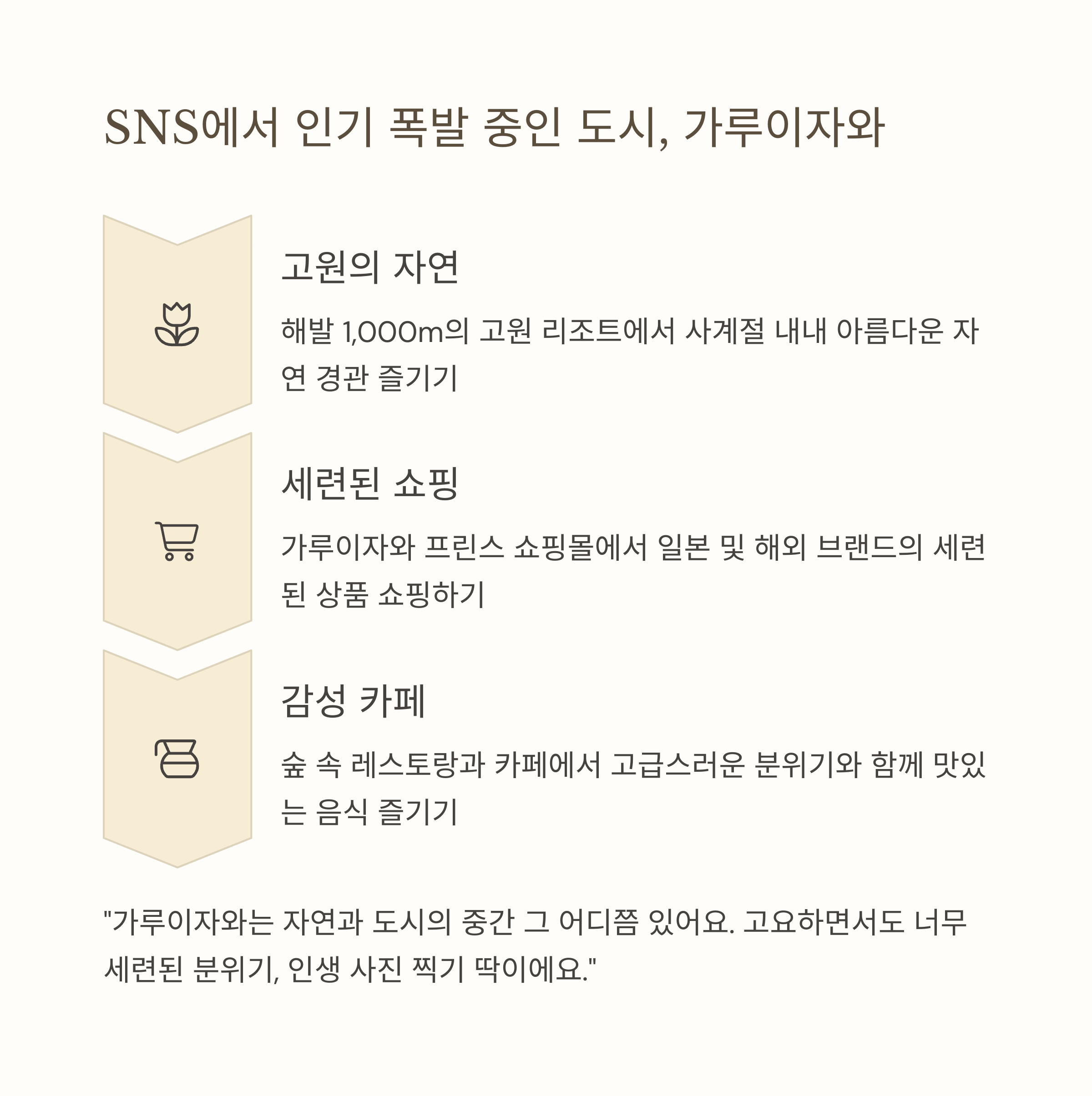고원 리조트, 세련된 상점가, 아웃도어 활동즐길거리