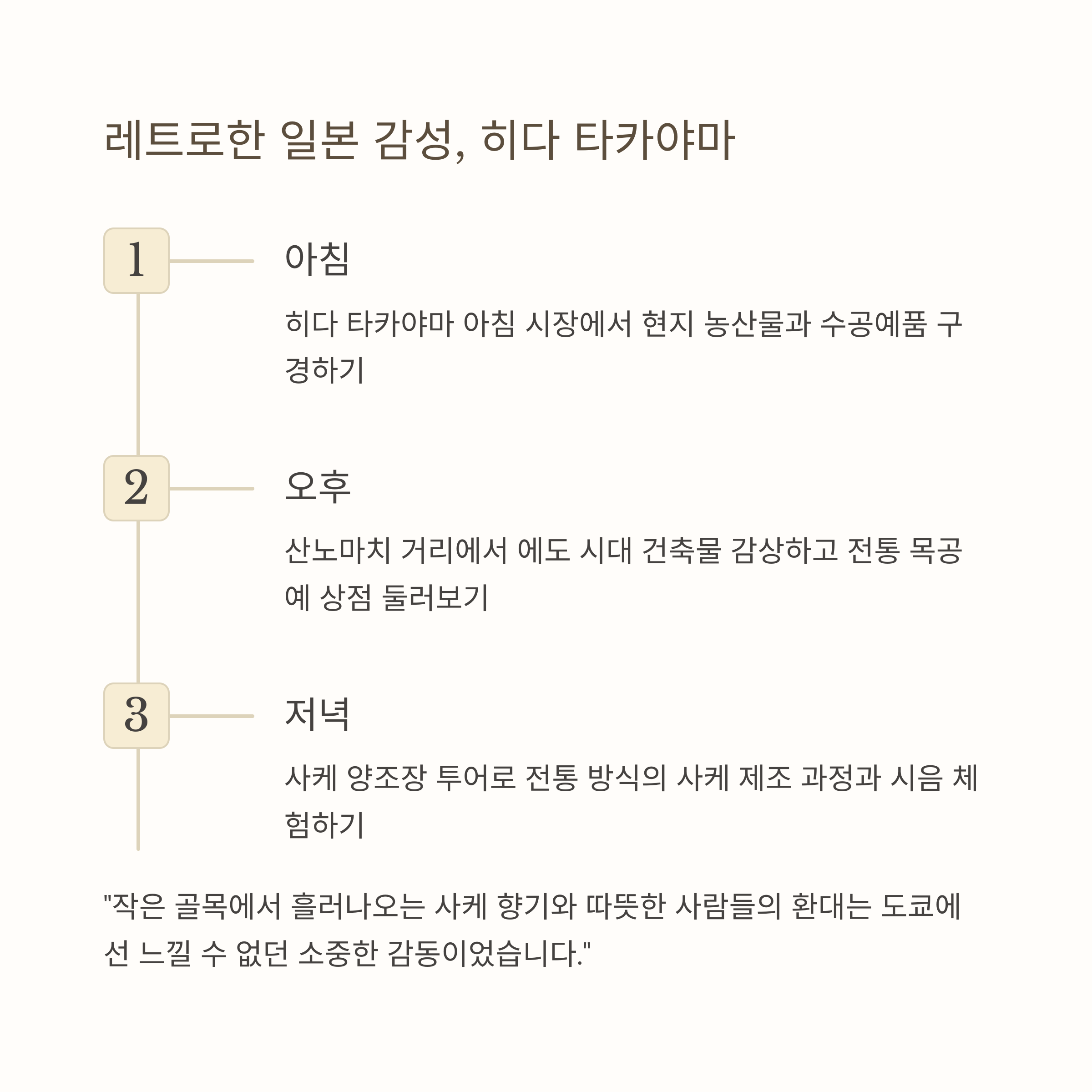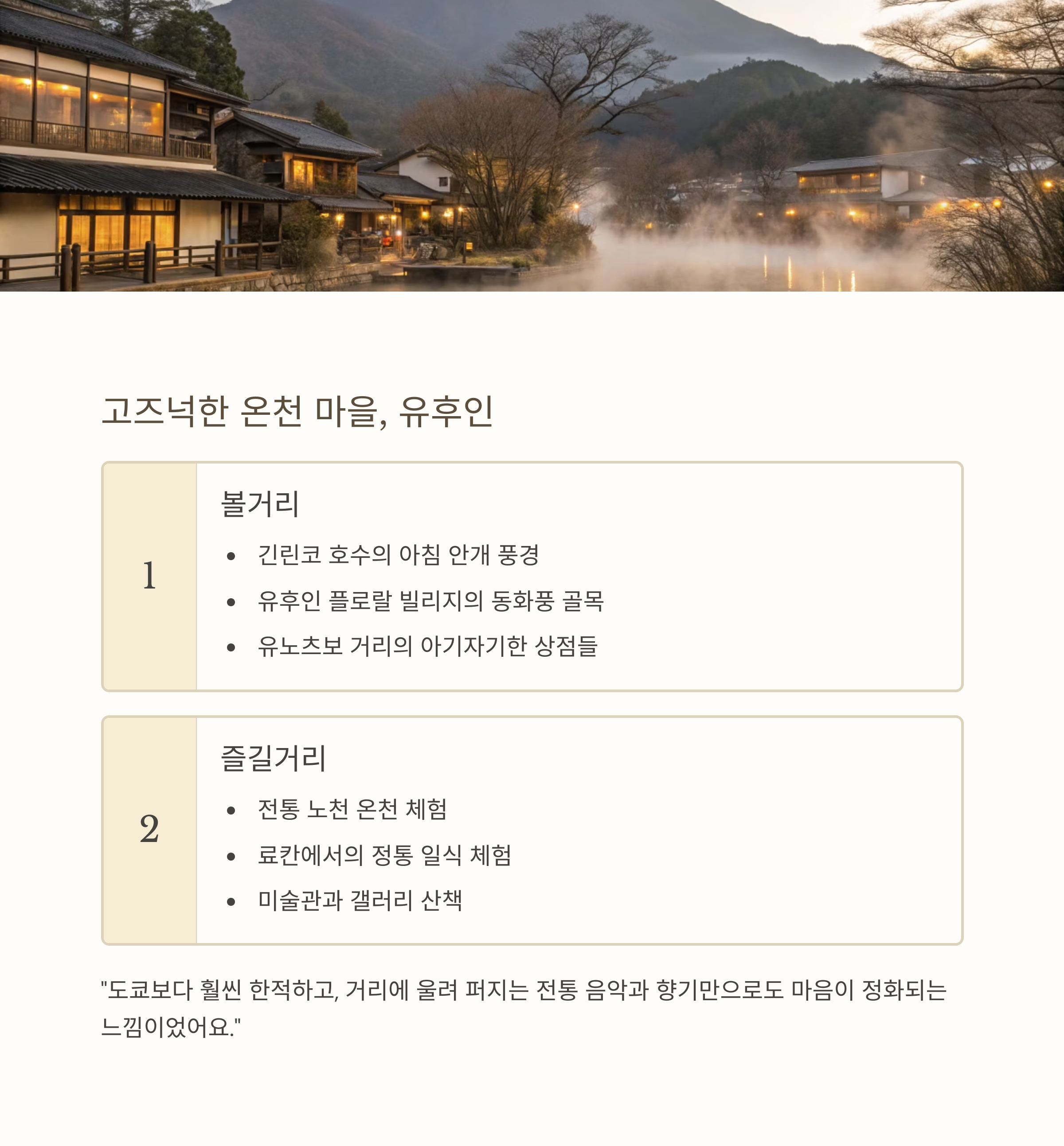 1일차 인천 출발 → 유후인 도착 → 온천 마을 산책 2일차 히다 타카야마 이동 → 구시가지 산책, 사케 체험 3일차 오노미치 이동 → 고양이 골목, 바다 자전거 4일차 가루이자와 또는 마츠야마 이동 후 귀국 감성 소도시 비교표
