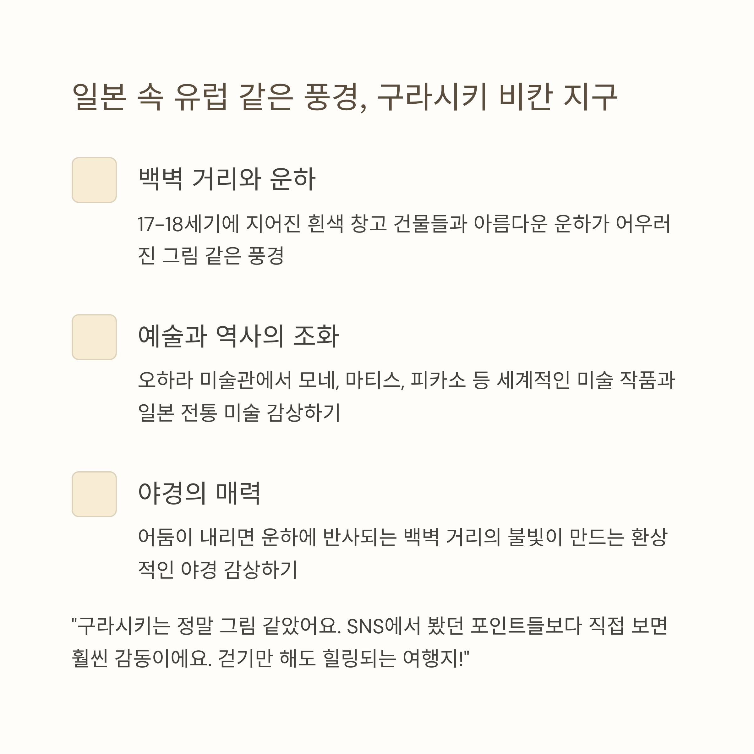 "구라시키는 정말 그림 같았어요. SNS에서 봤던 포인트들보다