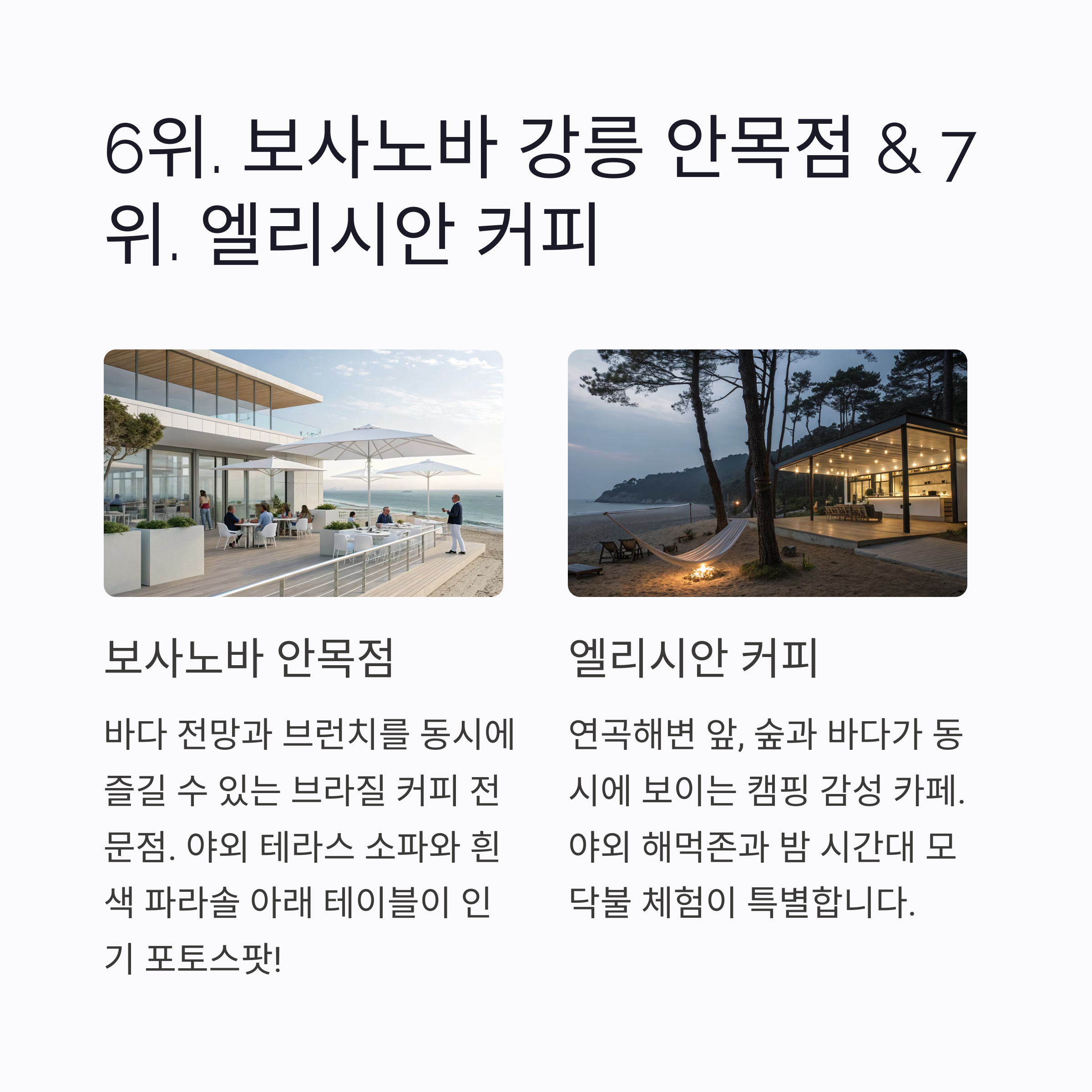 1 슬로우레이블 안목해변 인근 2층 창가석, 테라스 해질녘 말차 레어치즈, 아인슈페너 2 테라로사 본점 구정면 벽돌 정원, 커피기계 옆 핸드드립, 브런치류 3 콜드브루랩 안목 카페거리 유리 드립존, 간판 벤치 콜드브루 바틀 4 오디너리 카페 사천진 해변 옥상 루프탑, 창가석 브런치 세트, 수제 스콘 5 모루 난설헌로 한옥 한옥 처마 밑, 연못 앞 연잎 라떼, 전통 다과 6 보사노바 안목점 창해로 파라솔 아래 테이블, 바다 뷰 샌드위치, 보사노바 라떼 7 엘리시안 커피 연곡해변 해먹존, 모닥불 감성 조명 시나몬 라떼, 브루잉 커피 '여행' 카테고리의 다른 글