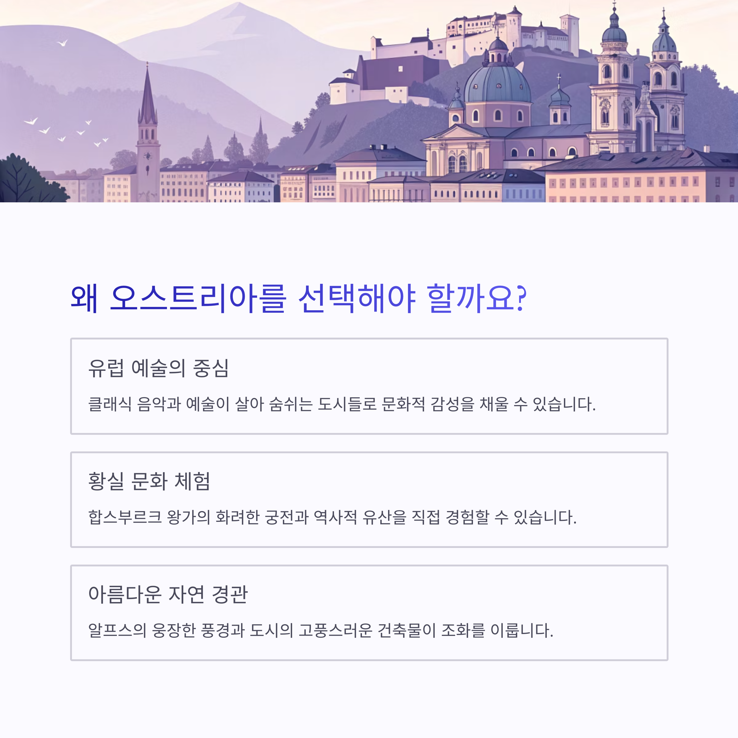 특히 수도 **비엔나(Vienna)**와 모차르트의 도시 **짤쯔브르크(Salzburg)**는 클래식 감성과 황실 문화,