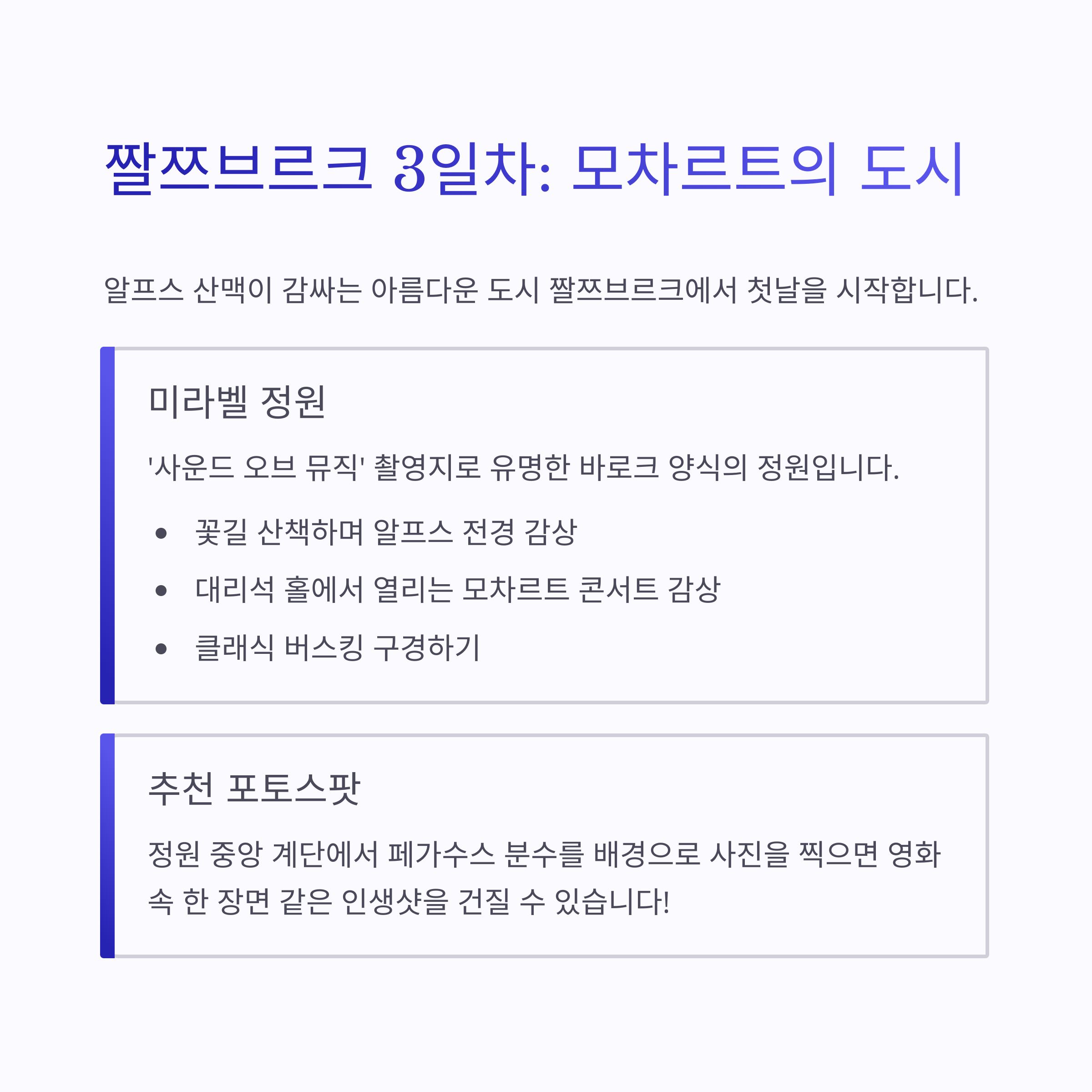1일차 비엔나 쇤브룬 궁전 → 슈테판 대성당 → 시내 골목 산책 2일차 비엔나 벨베데레 궁전 → 오페라 극장 → 자허 카페 3일차 짤쯔브르크 미라벨 정원 → 게트라이데 거리 → 모차르트 생가 4일차 짤쯔브르크 호헨짤쯔브르크 요새 → 구시가지 산책 후 비엔나 이동 or 귀국 비엔나 vs 짤쯔브르크 감성 비교표