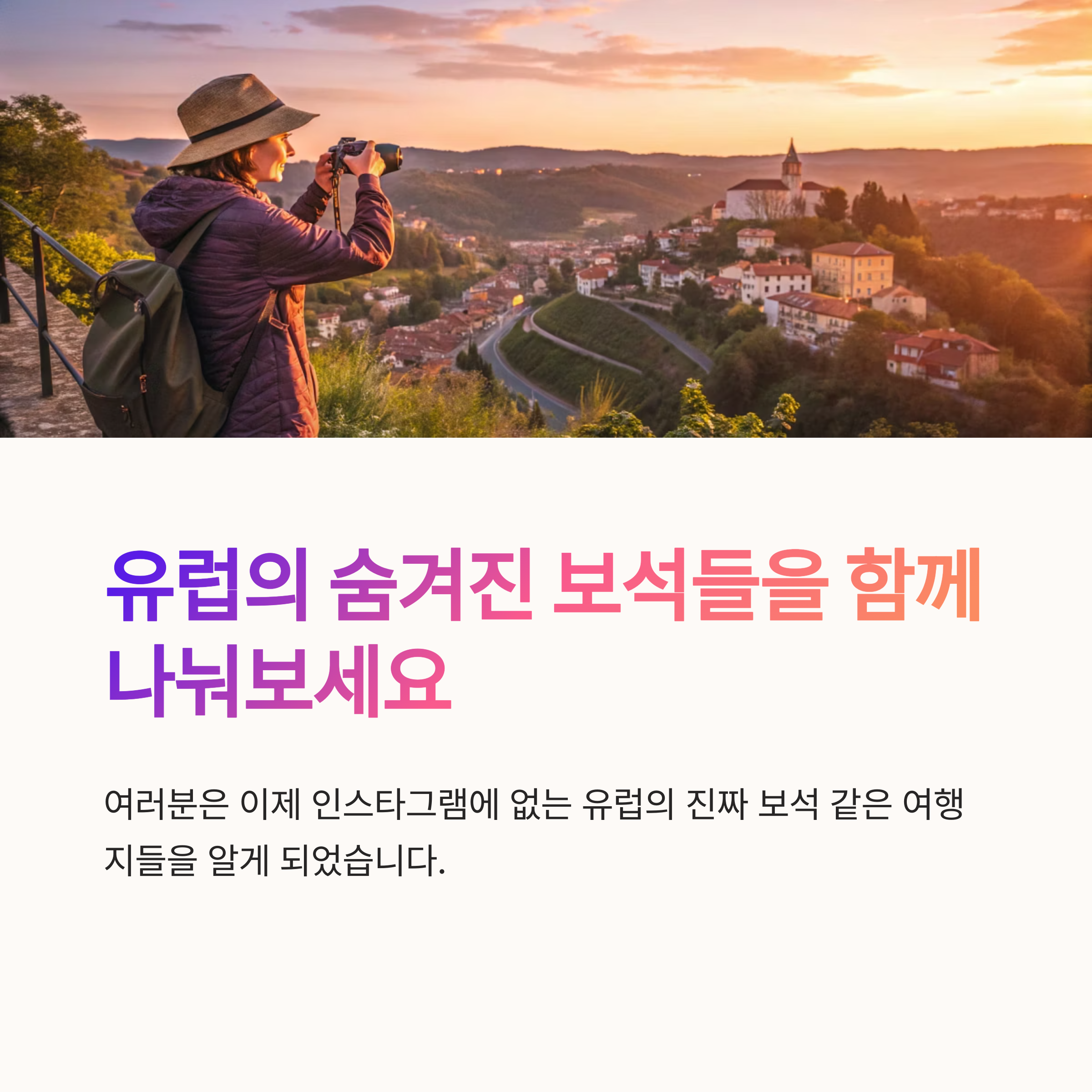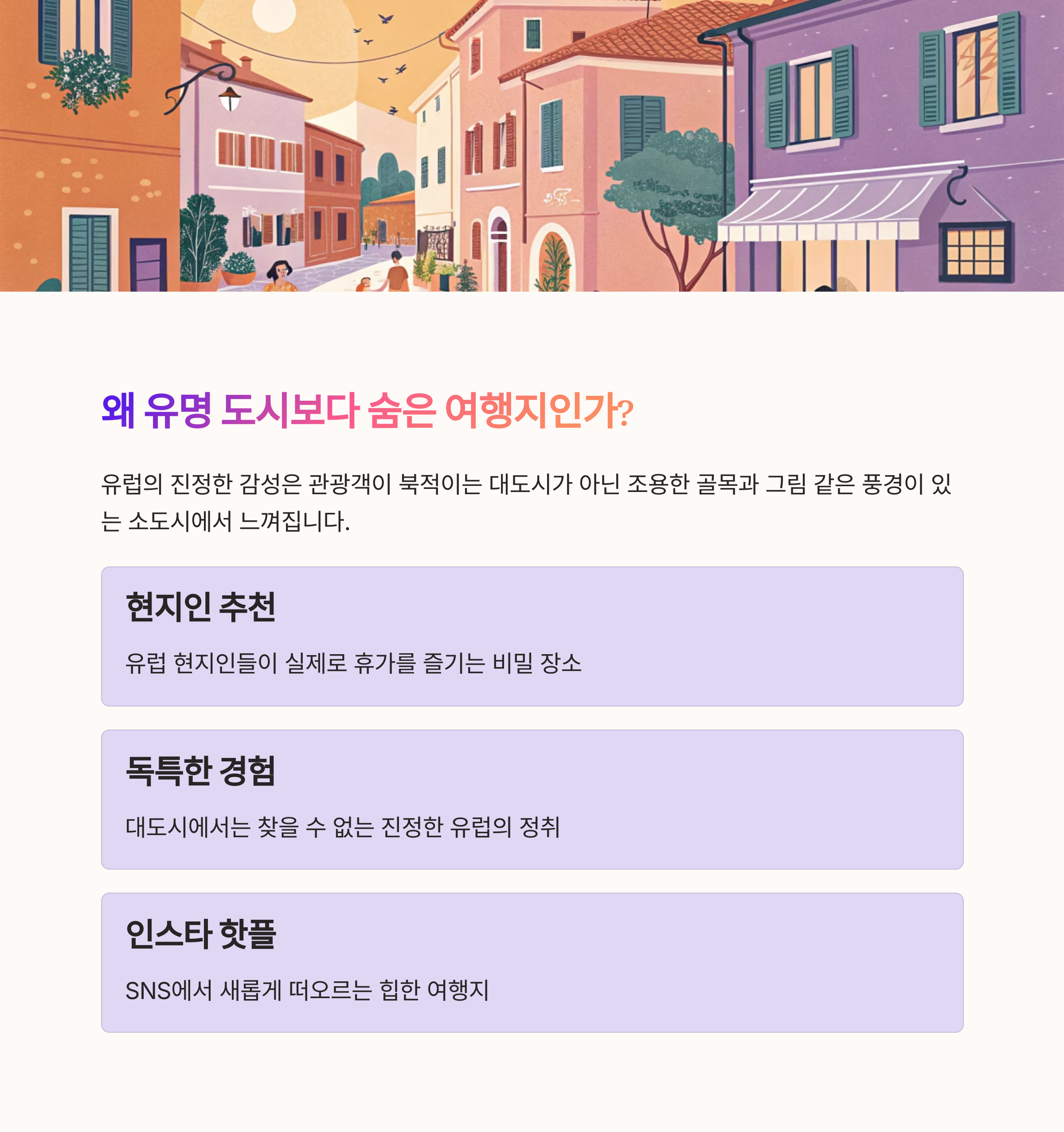 하지만 진짜 유럽의 감성은 조용한 골목과 그림 같은 풍경이 어우러진 숨은 여행지에서 더 짙게 느껴집니다.