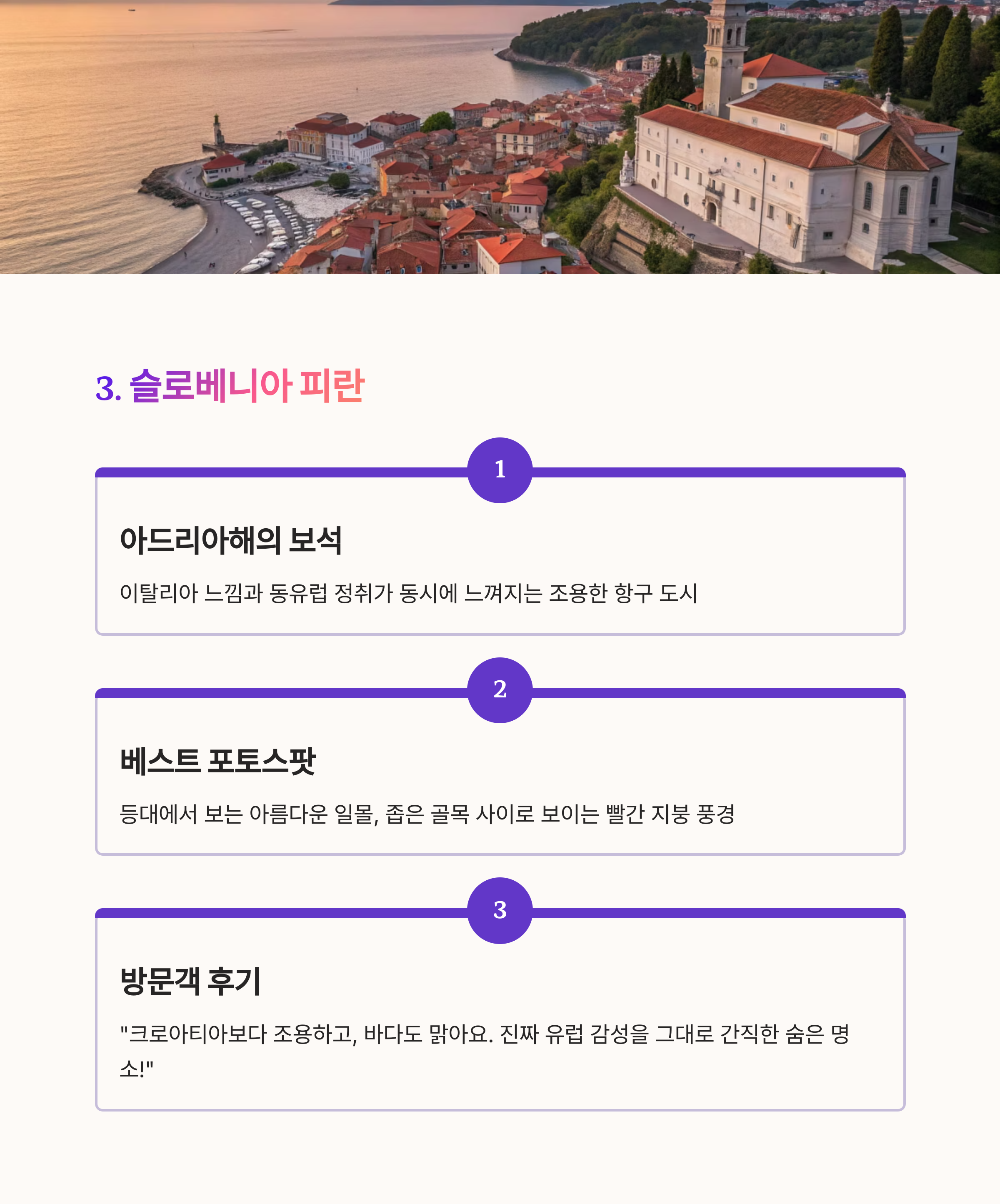 슬로베니아, 크로아티아 4박5일 여행일정 및 맛집 추천 (11) 2025.08.06 AI여행플래너로 짠 2박3일 제주도 여름코스 대공개 (11) 2025.08.05 반려견과 함께 가기 좋은 국내 해변 여행지 5곳 (16) 2025.08.05 동유럽의 중심 오스트리아 비엔나와 짤쯔브르크 3박4일 여행계획 (9) 2025.08.04 2025 여름, 강릉카페거리 핫플 순위 TOP7, 현지인 추천 감성 카페 (9) 2025.08.04
