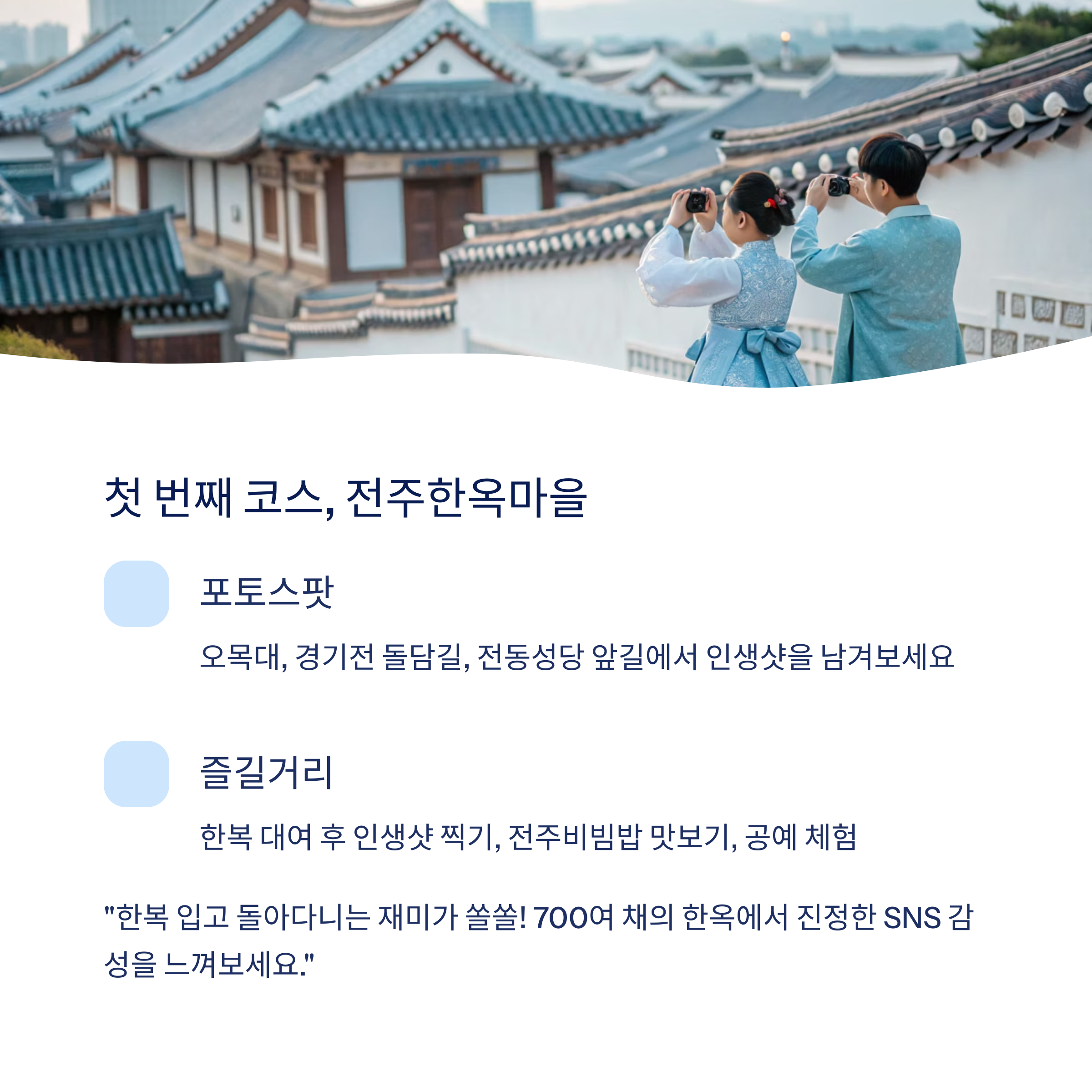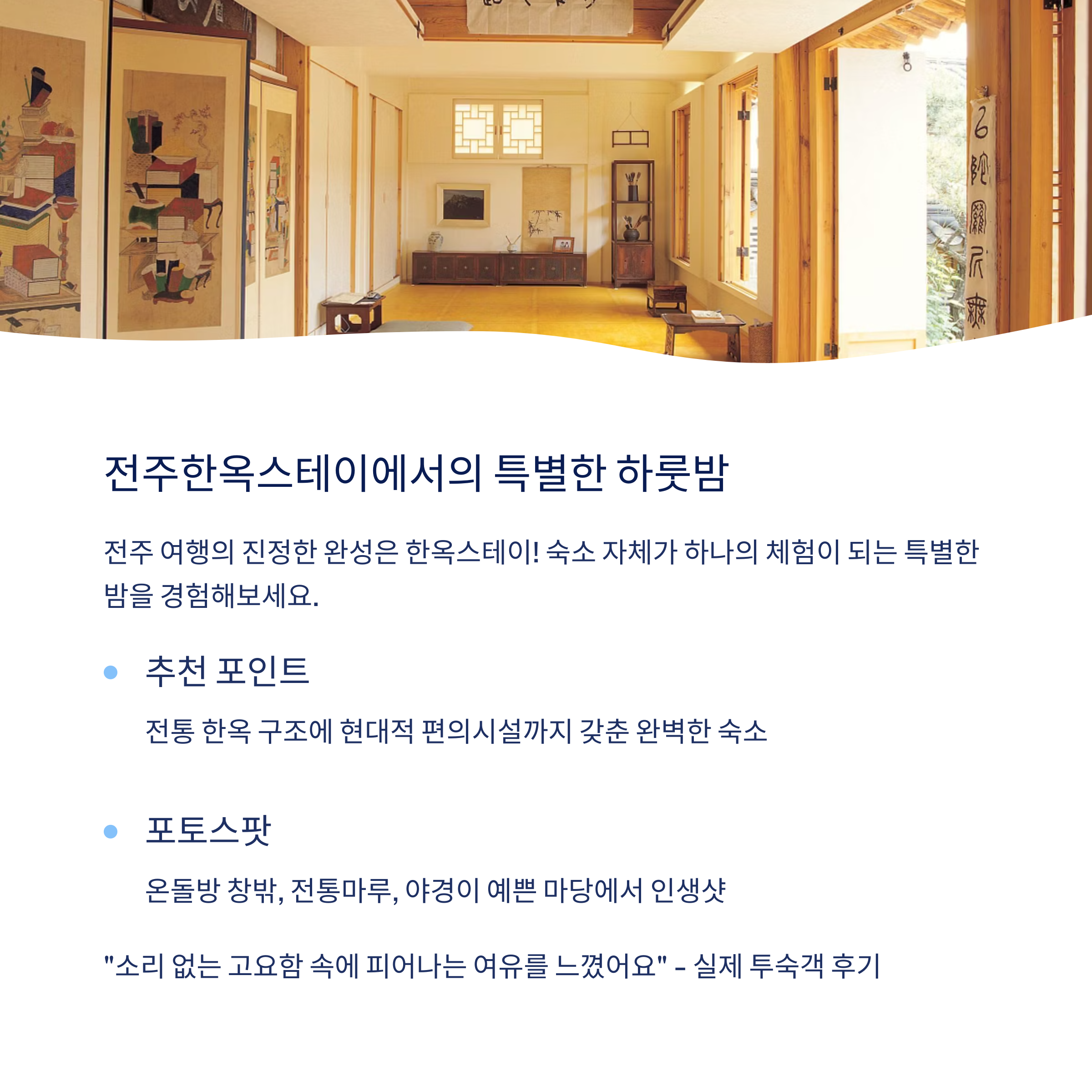 리뷰, 트렌드를 분석하여 가장 만족도 높은 전북 여행일정을 구성했습니다. 전주의 감성과