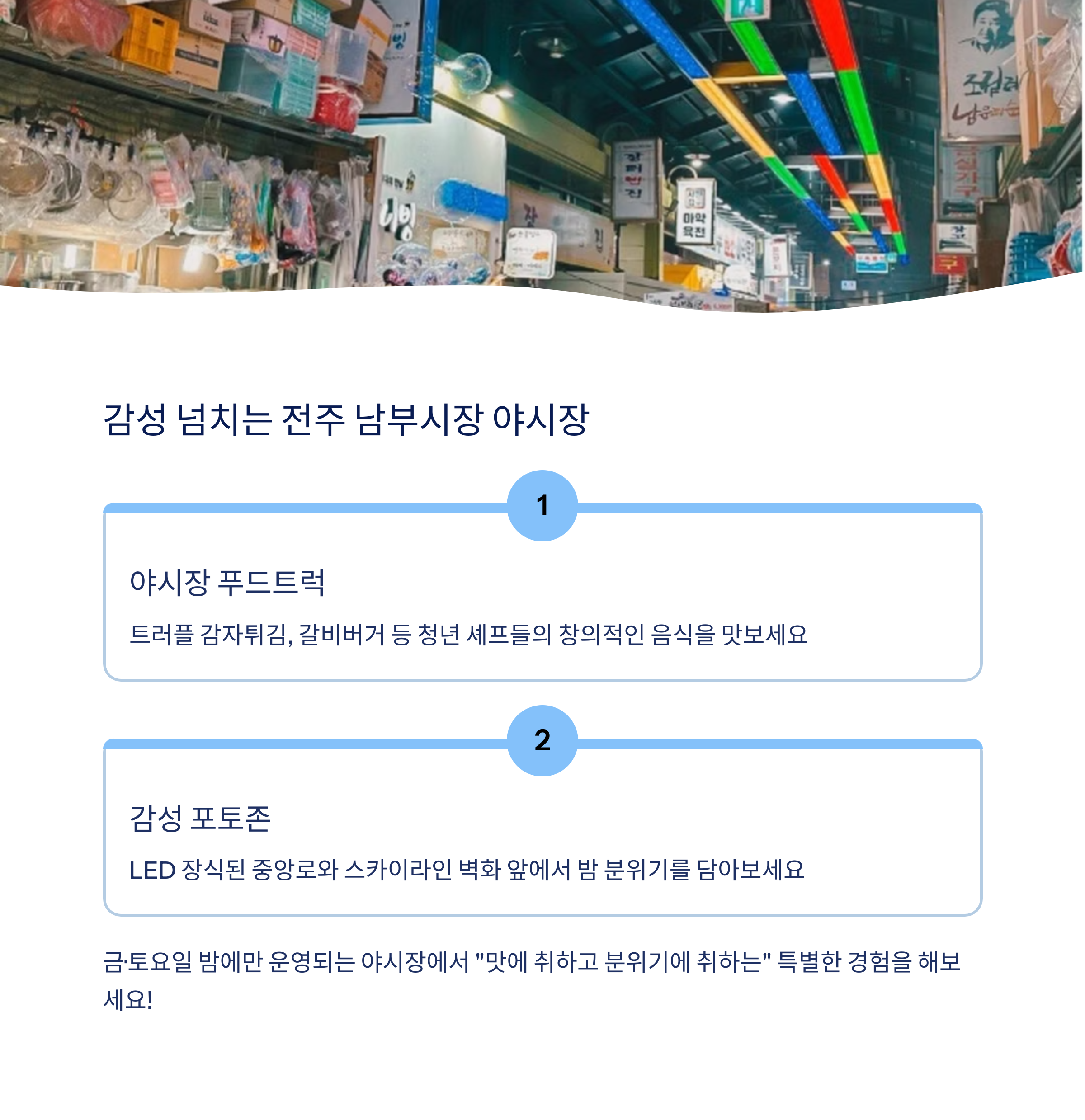 감성 넘치는 밤여행은 전주 남부시장 야시장에서 완성됩니다. 먹거리와 볼거리가 어우러져