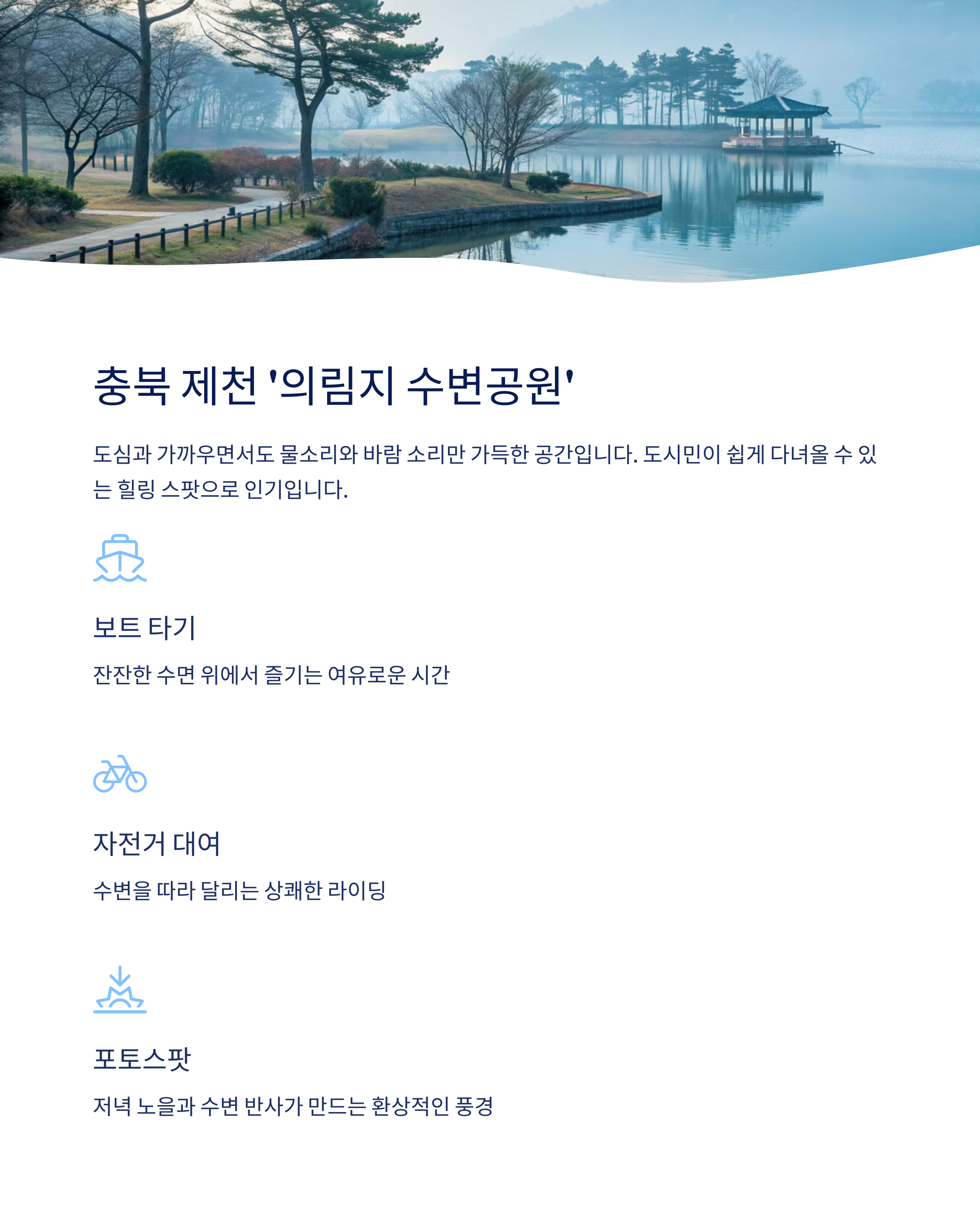 도시민이 쉽게 다녀올 수 있는 힐링 스팟으로 인기입니다.주소: 충청북도 제천시 의림대로 33길 24