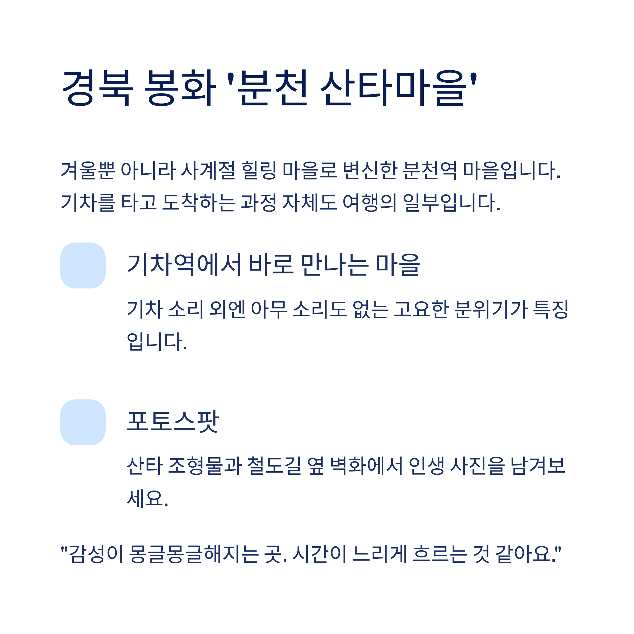 기차를 타고 도착하는 과정 자체도 여행의 일부입니다.주소: 경상북도 봉화군 소천면 분천리