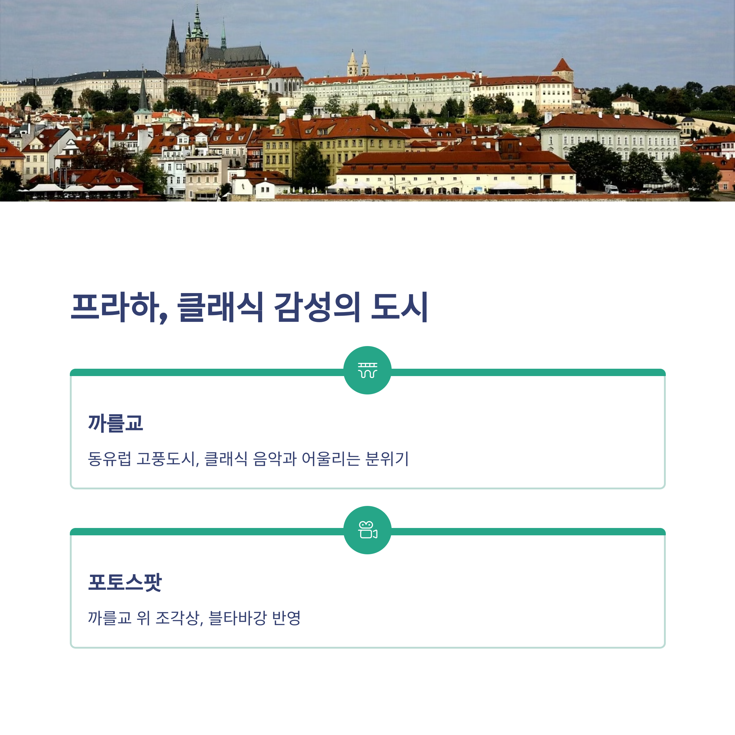 특징: 동유럽 고풍도시, 클래식 음악과 어울리는 분위기